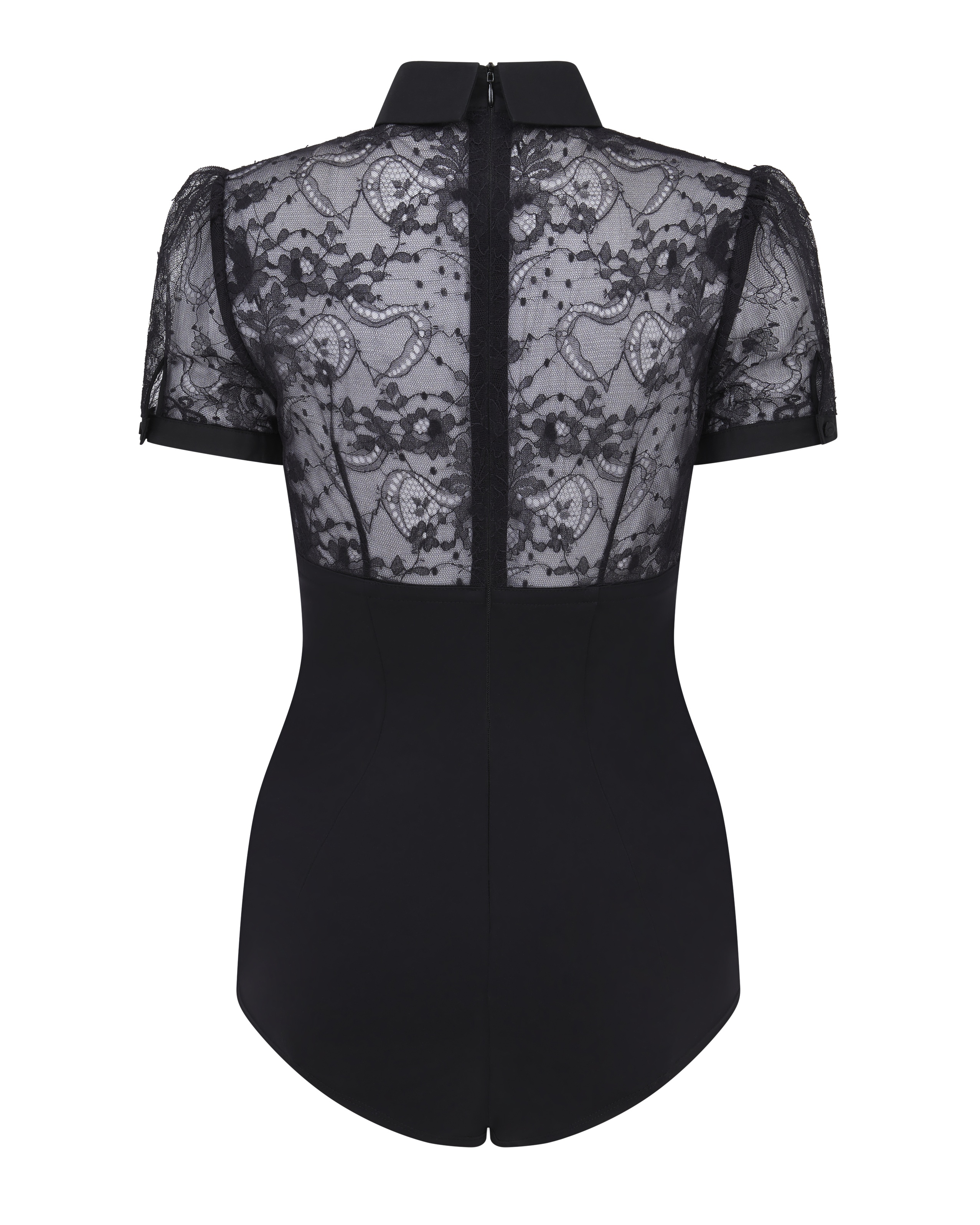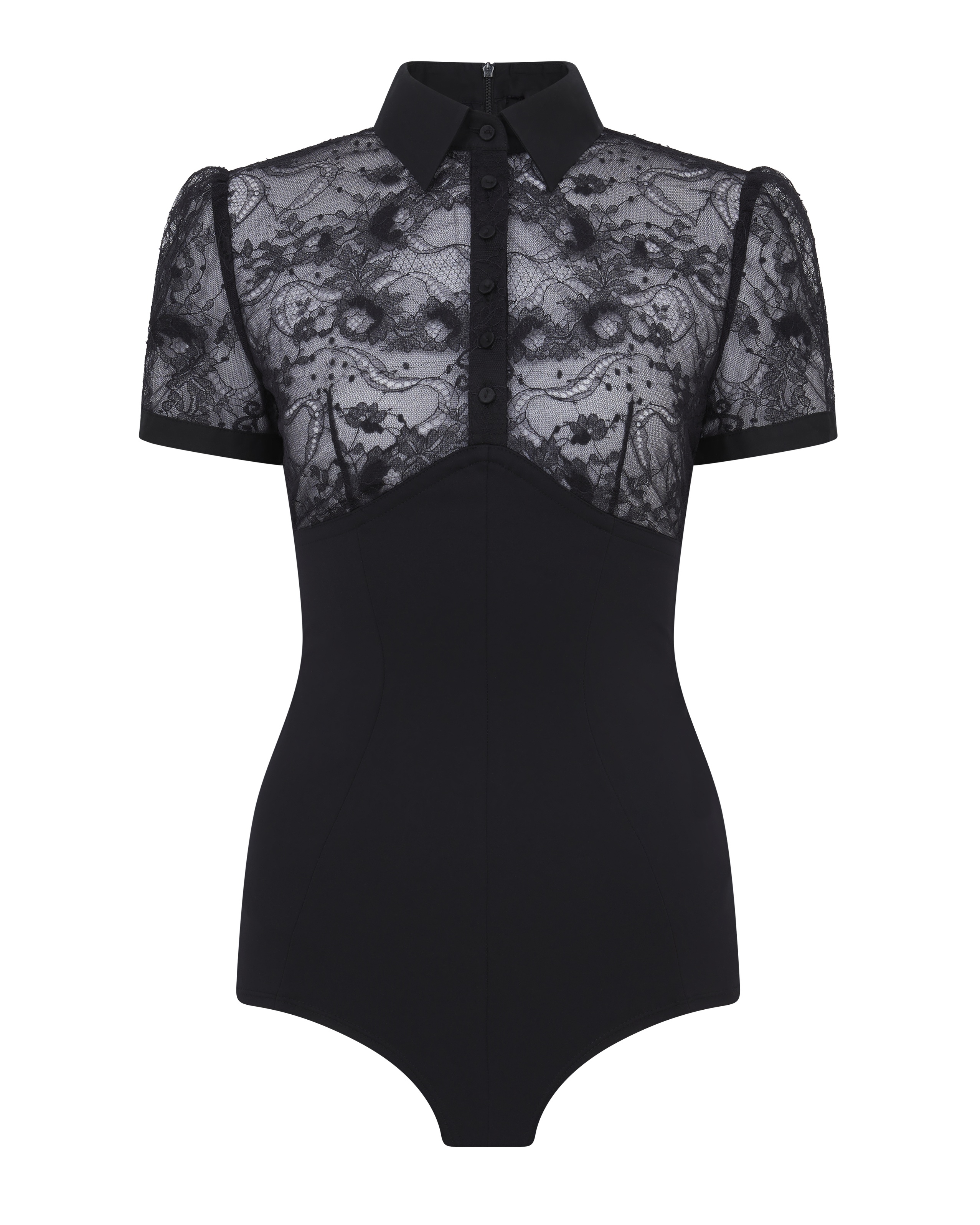 Боди Dorothie в черном цвете сочетает кружевной верх с пуговицами, воротничок и манжеты из хлопка и облегающий низ из стрейчевого джерси — попробуйте добавить галстук и платье из той же коллекции.