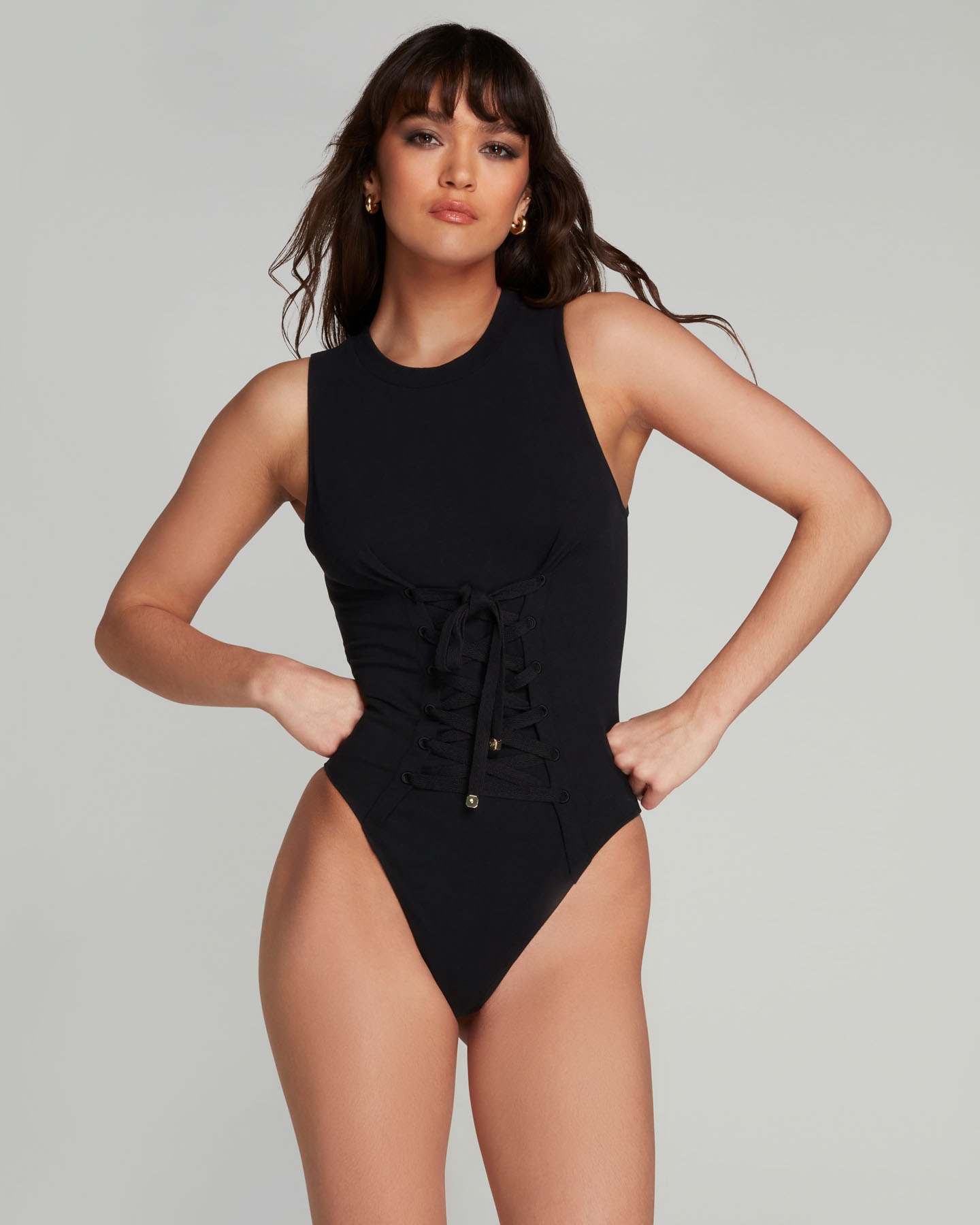 В основе черного боди Larah лежит принцип универсальности и удобства, благодаря использованию высококачественного органического хлопка. Дизайн со шнуровкой на передней части талии подчеркивает силуэт, а ненавязчивый логотип Agent Provocateur на груди служит маркером бренда. Боди легко вписывается в любой гардероб, дополняя как спортивные, так и более элегантные ансамбли из коллекции Larah.