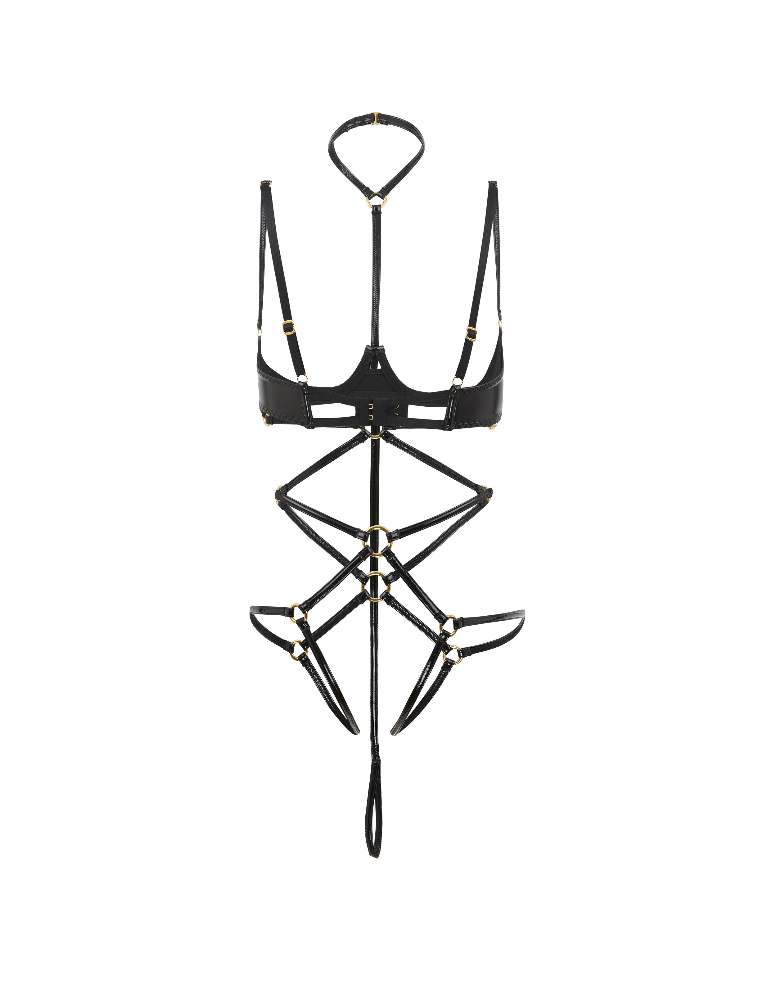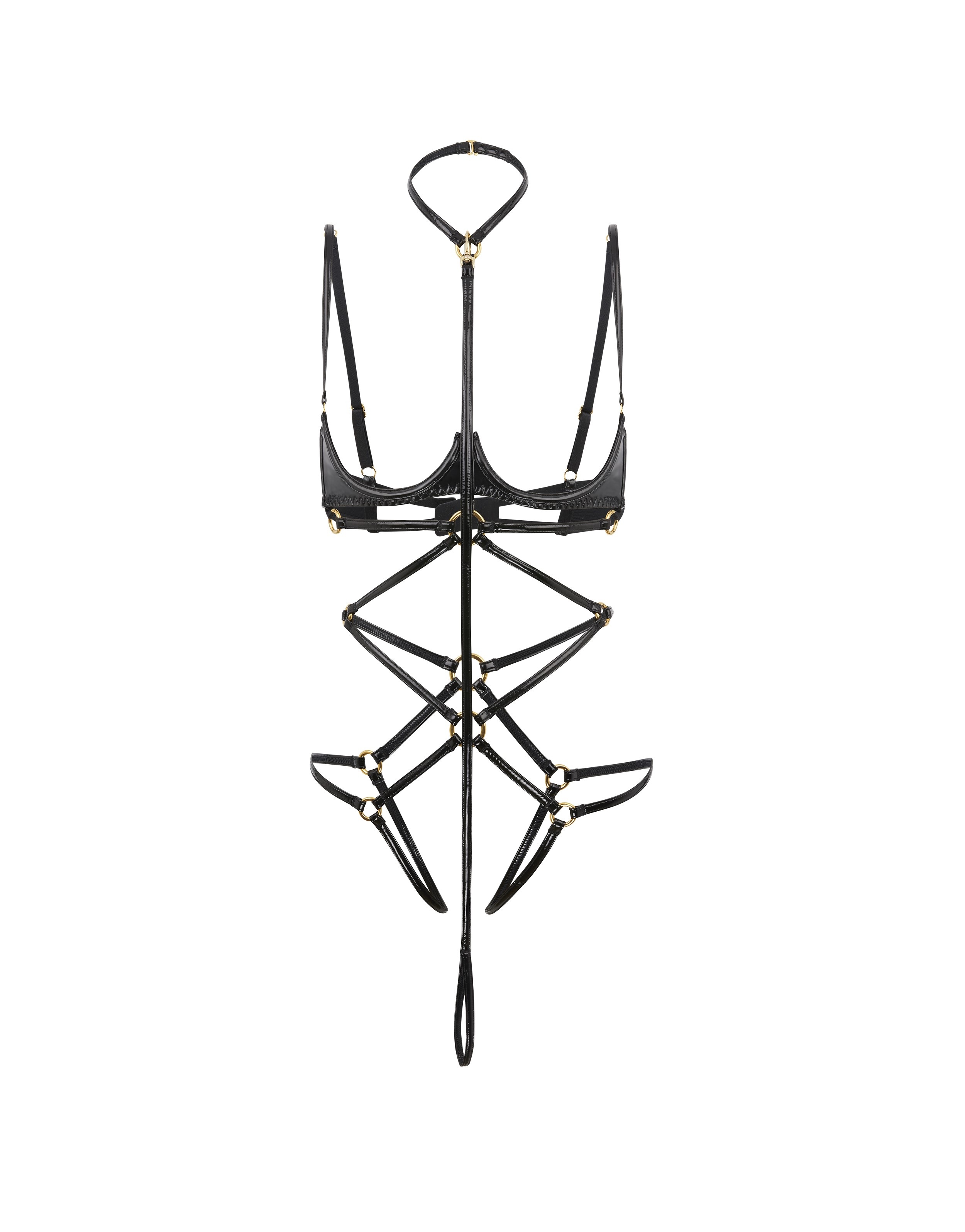 Создайте смелый и невероятно соблазнительный образ с боди Ozella, надевая его в комплекте с вашим любимым бельем или как самостоятельную вещь. Модель выполнена из черного материала с лакированным эффектом и дополнена соединительными колечками из золотистого металла.