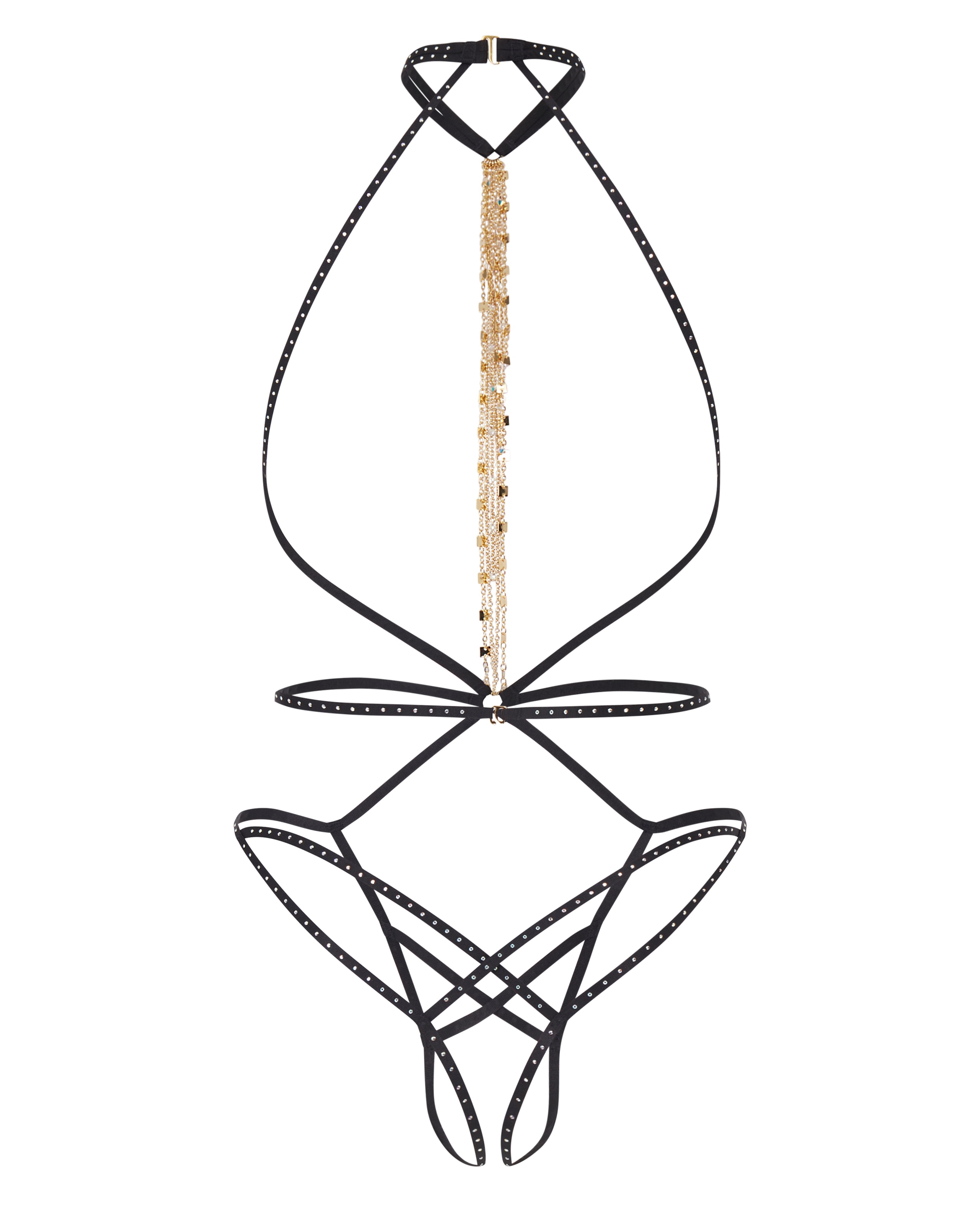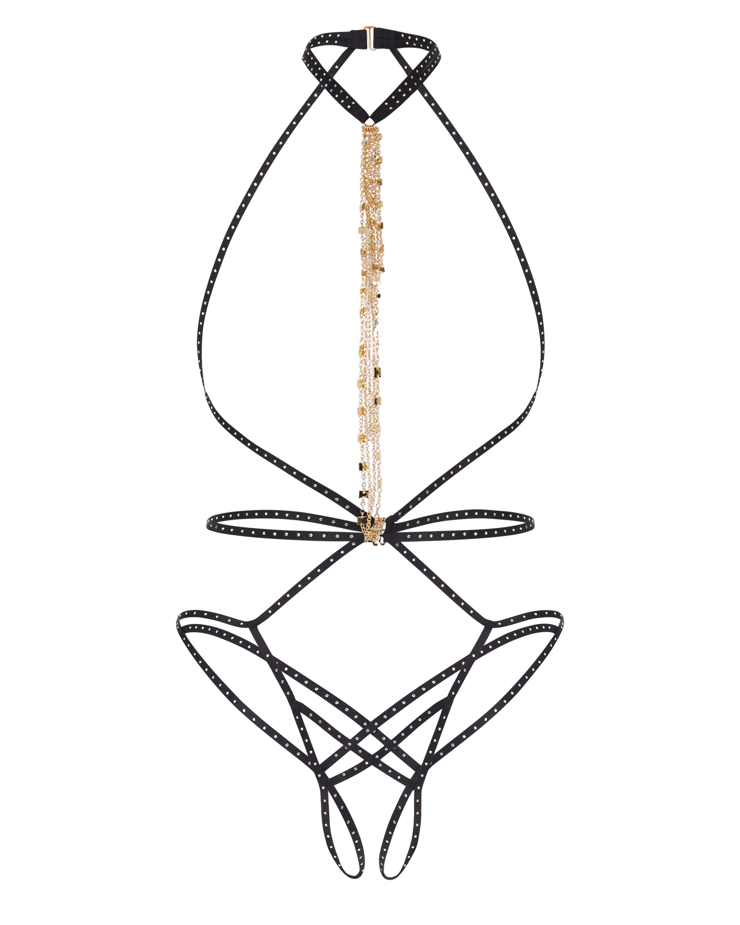 Боди Rubi черного цвета, вдохновленное вегасскими шоу-герлз и созданное, чтобы быть в центре внимания. Эффектная модель подчеркивает каждый изгиб благодаря эластичным лентам с кристаллами и акцентам из цепочек. Гладкие металлические застежки обеспечивают идеальную посадку. Полный комплект Rubi — ваш выход на сцену.