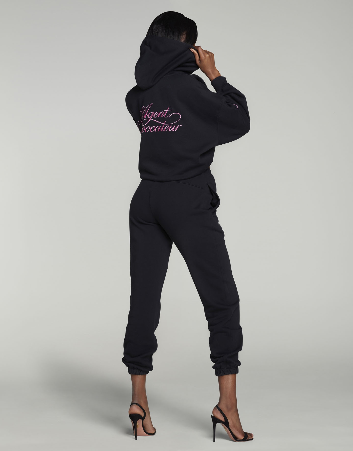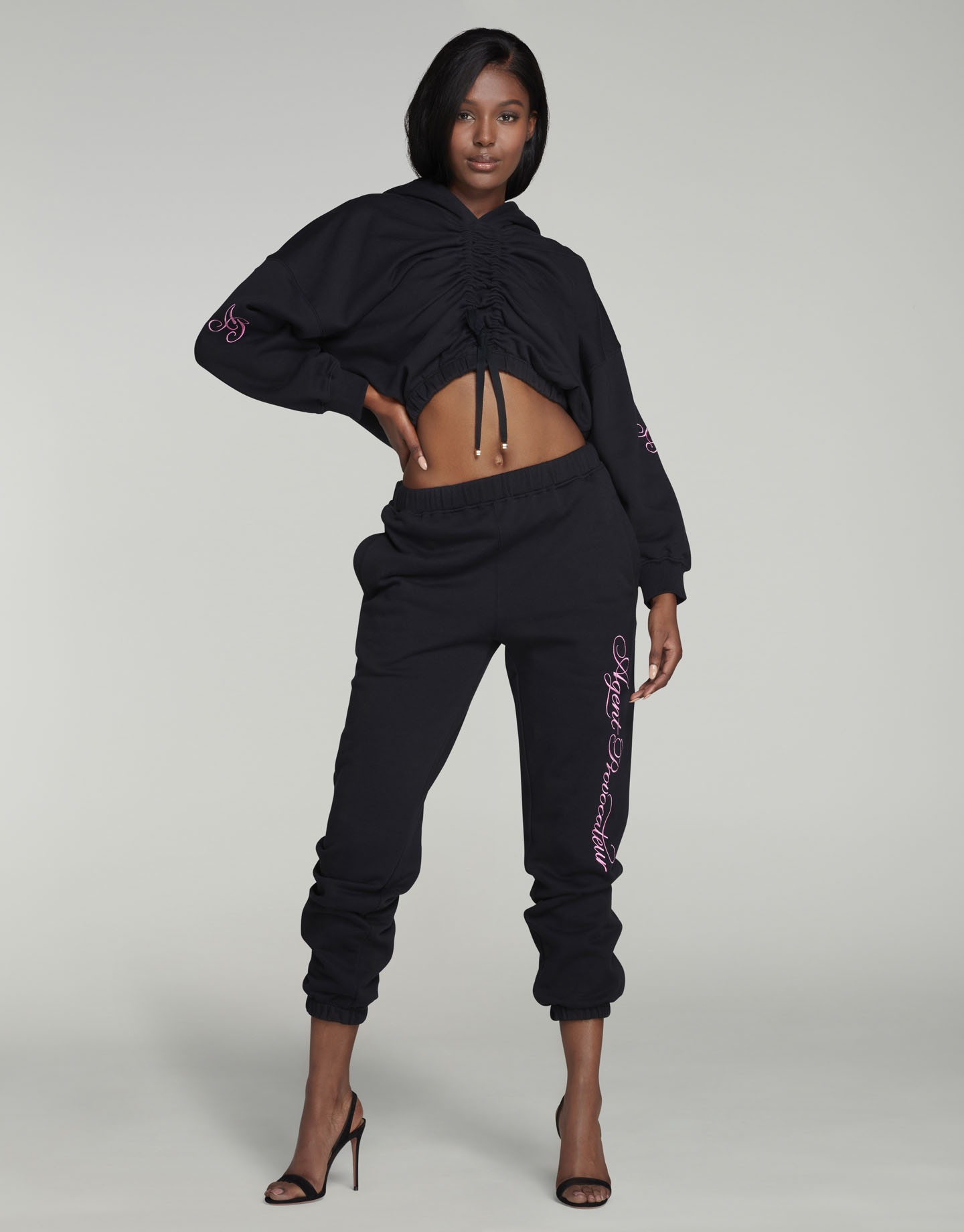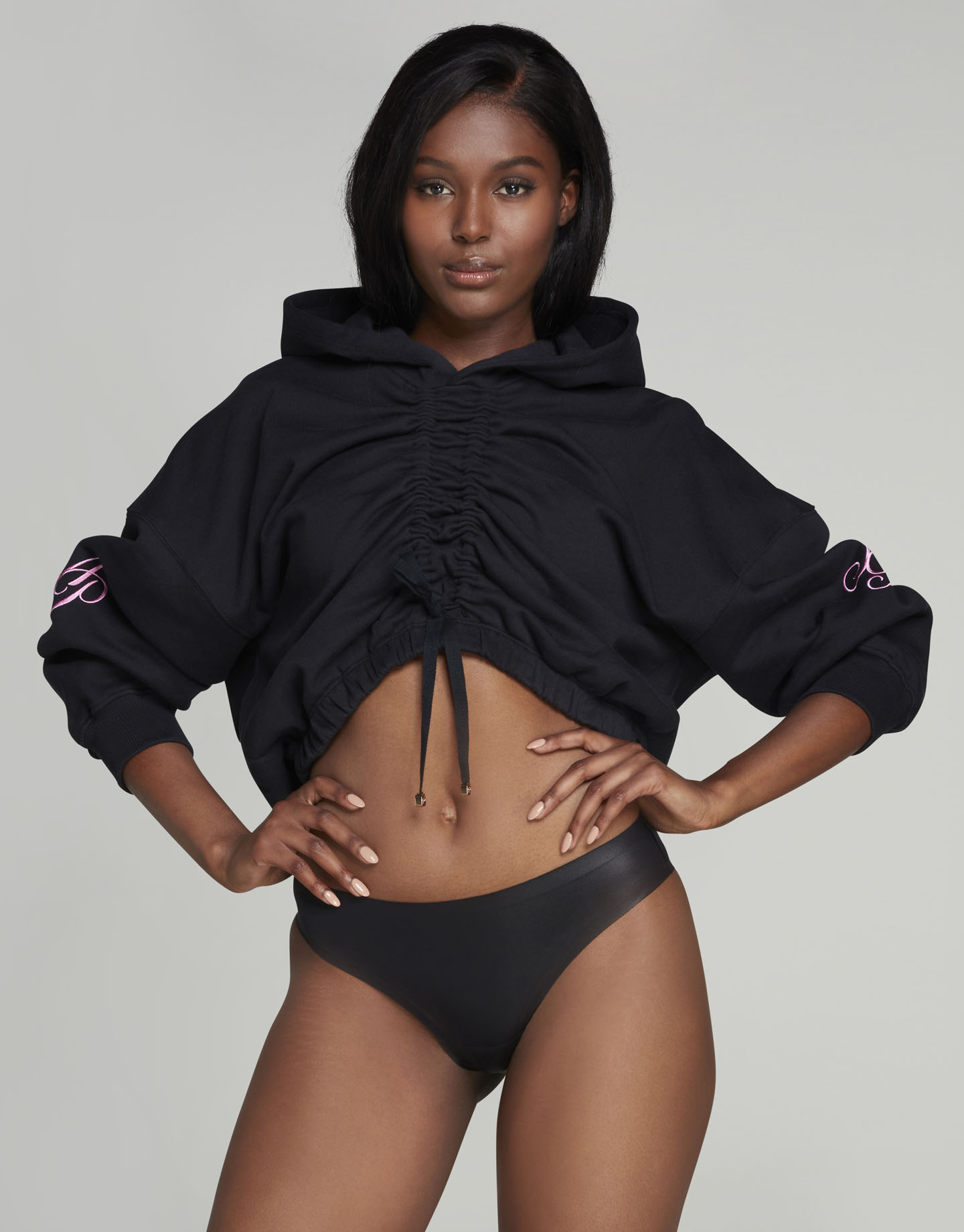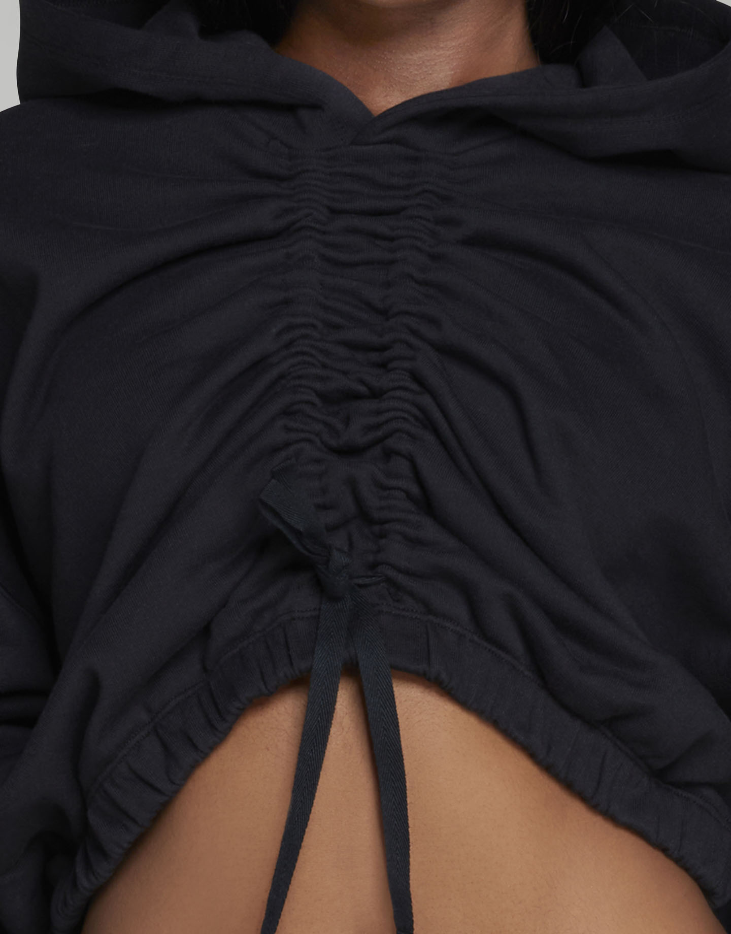 Худи просторного кроя из коллекции Rayley сшито из мягкого хлопкового трикотажа. Черный цвет служит фоном для контрастной вышивки в виде логотипов бренда. Спереди расположены кулиски, с помощью которых можно собрать изделие в текстурную сборку. Отсылка к расслабленному стилю 90-х прослеживается и в спущенной линии плеч, дающей начало свободным рукавам.