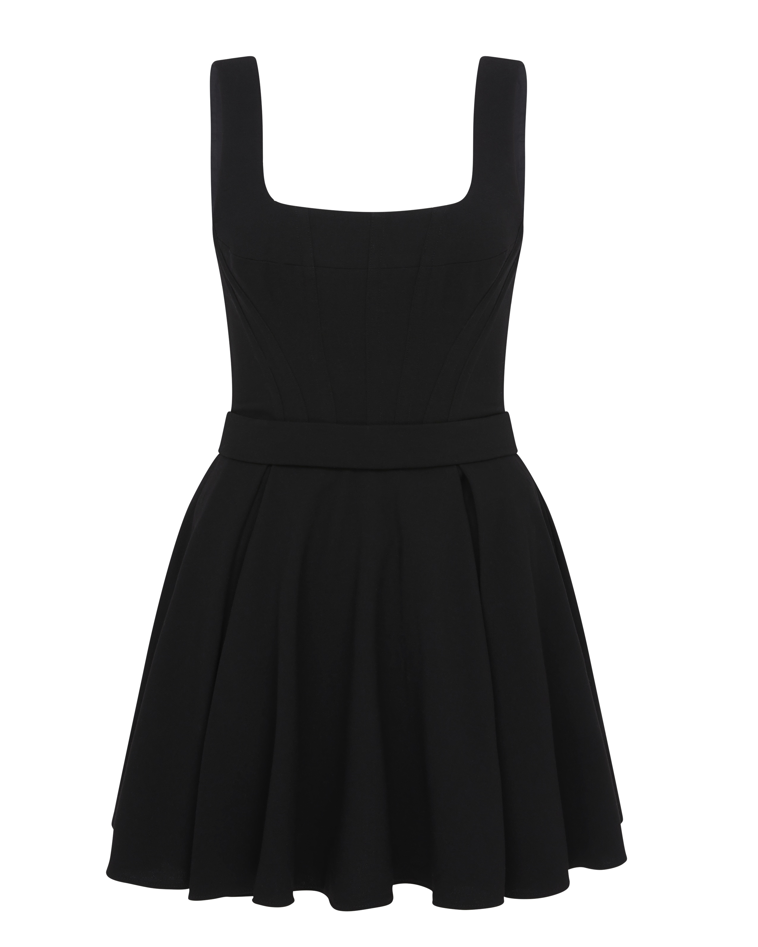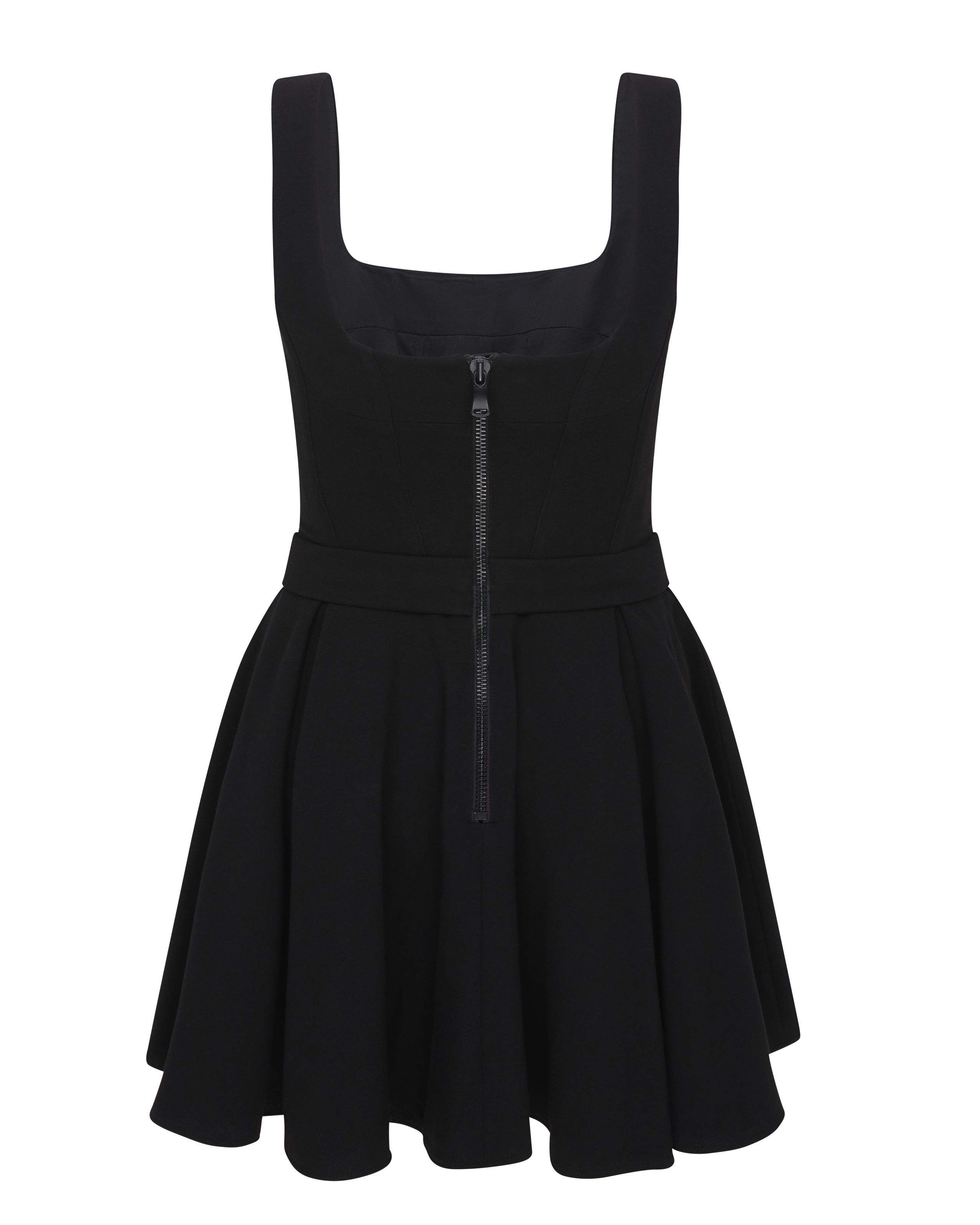 Мини-платье Dorothie выполнено из премиальной костюмной ткани на шелковой подкладке и дополнено съемными подтяжками на внутреннем поясе. Длина акцентирует верх чулок.