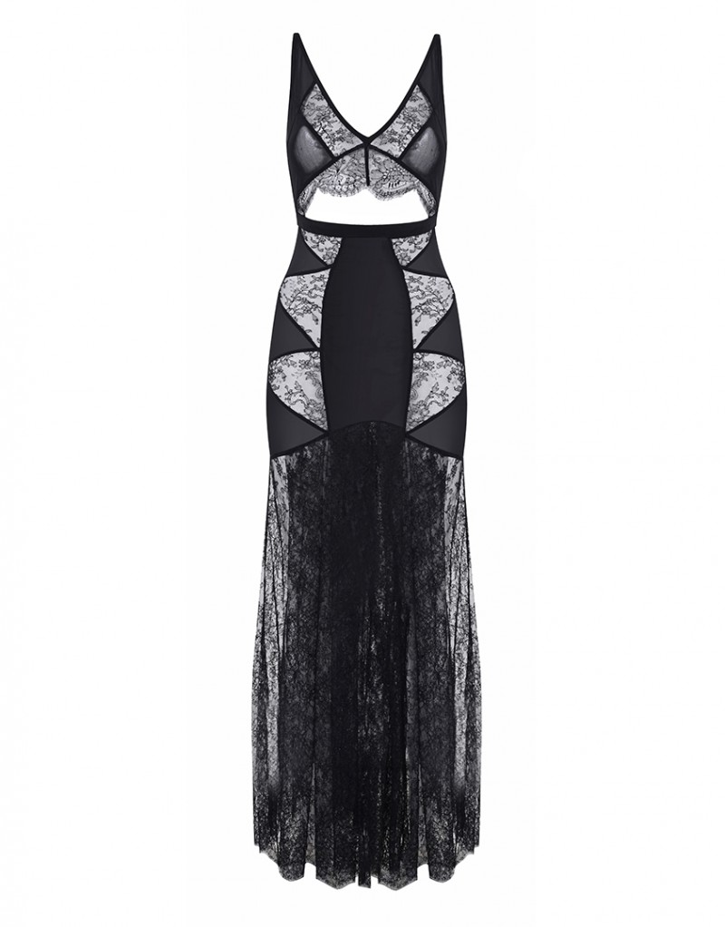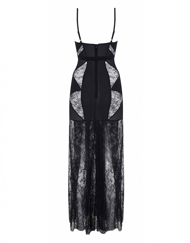 Deanna - это восхитительное сочетание классических форм 1950-х годов и современного дизайна. Эффектное платье в пол создано из контрастных панелей крупной черной сетки и флорального кружева. Оно выгодно подчеркивает фигуру. Модель дополнена струящейся юбкой из черного кружева шантильи. Дразнящий вырез под грудью, отороченный кружевными лепестками, завершает образ.