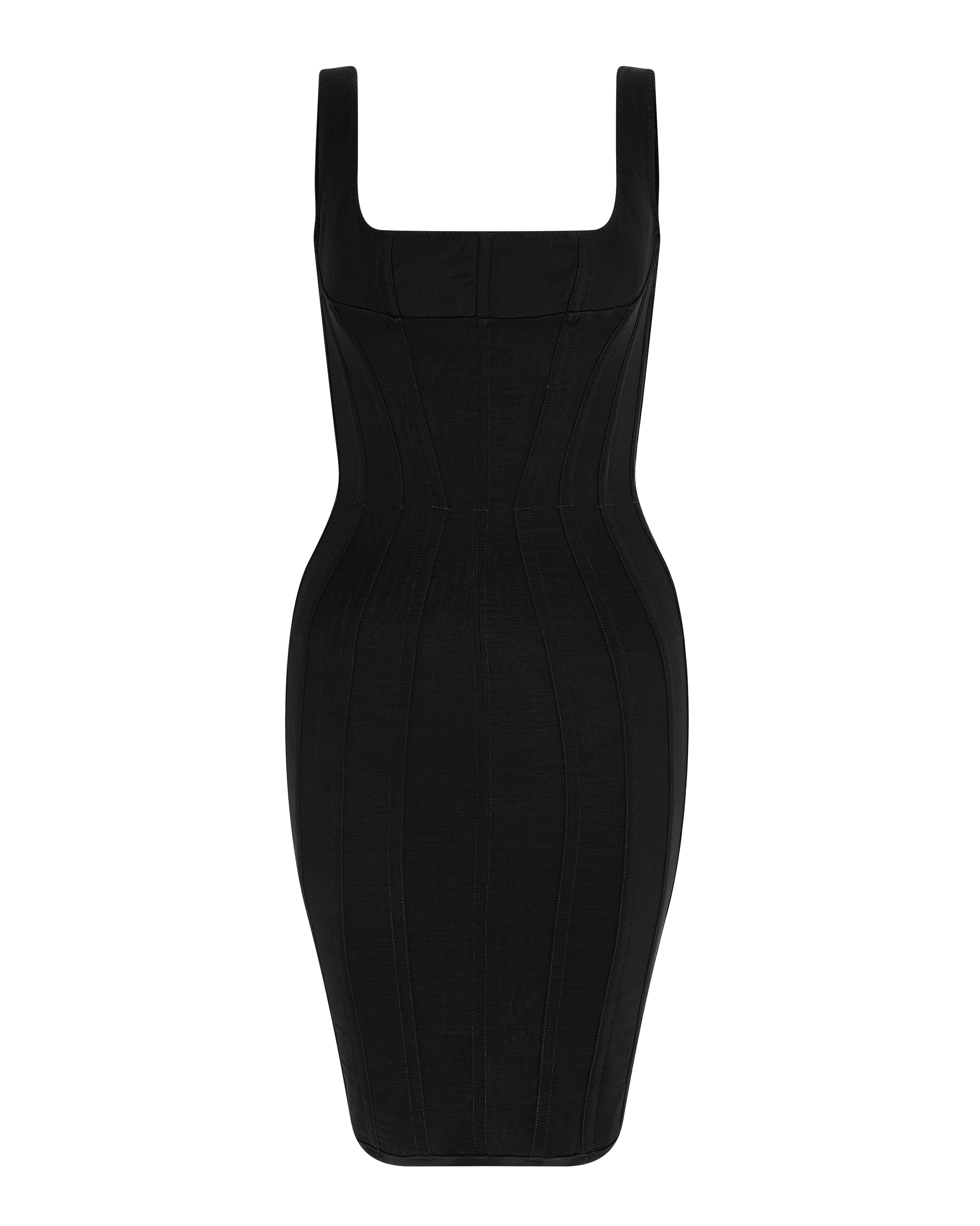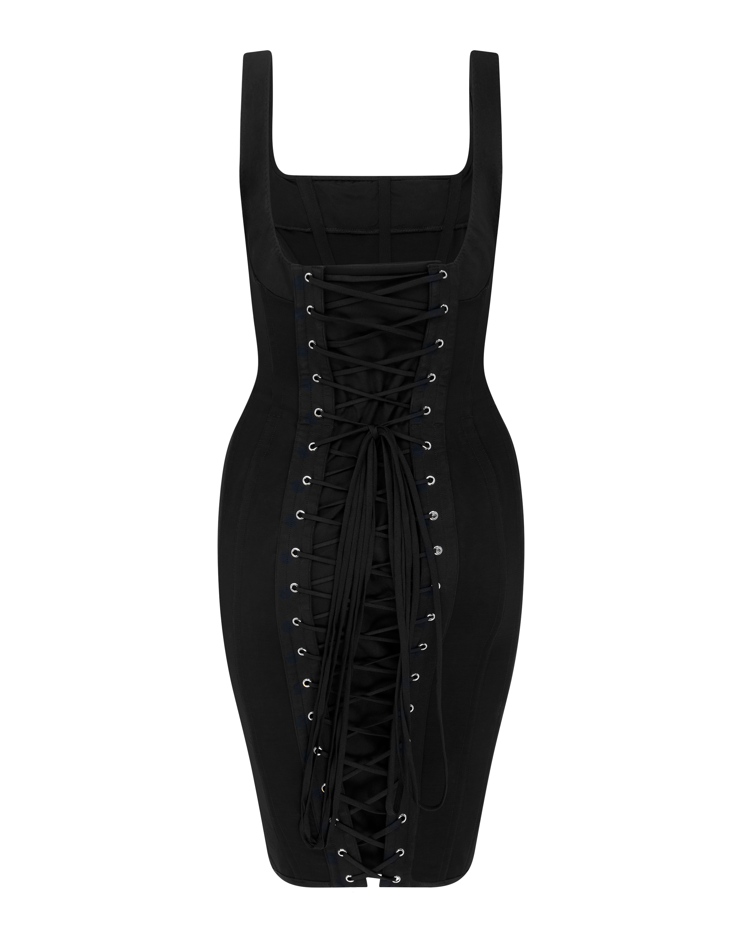 Коллекция-бестселлер Zena представлена черным платьем. Лиф с корсетными косточками подчеркивает линию фигуры, а регулируемая шнуровка на спине с защитной панелью обеспечивает индивидуальную посадку и стильный вид.