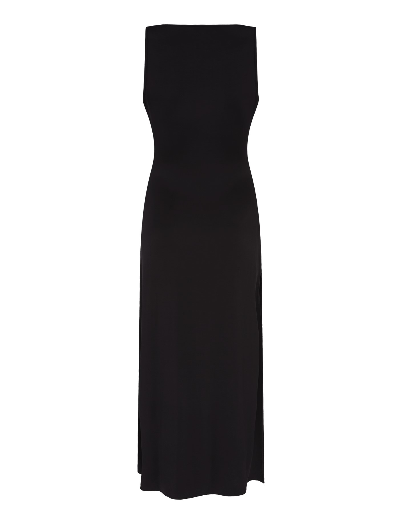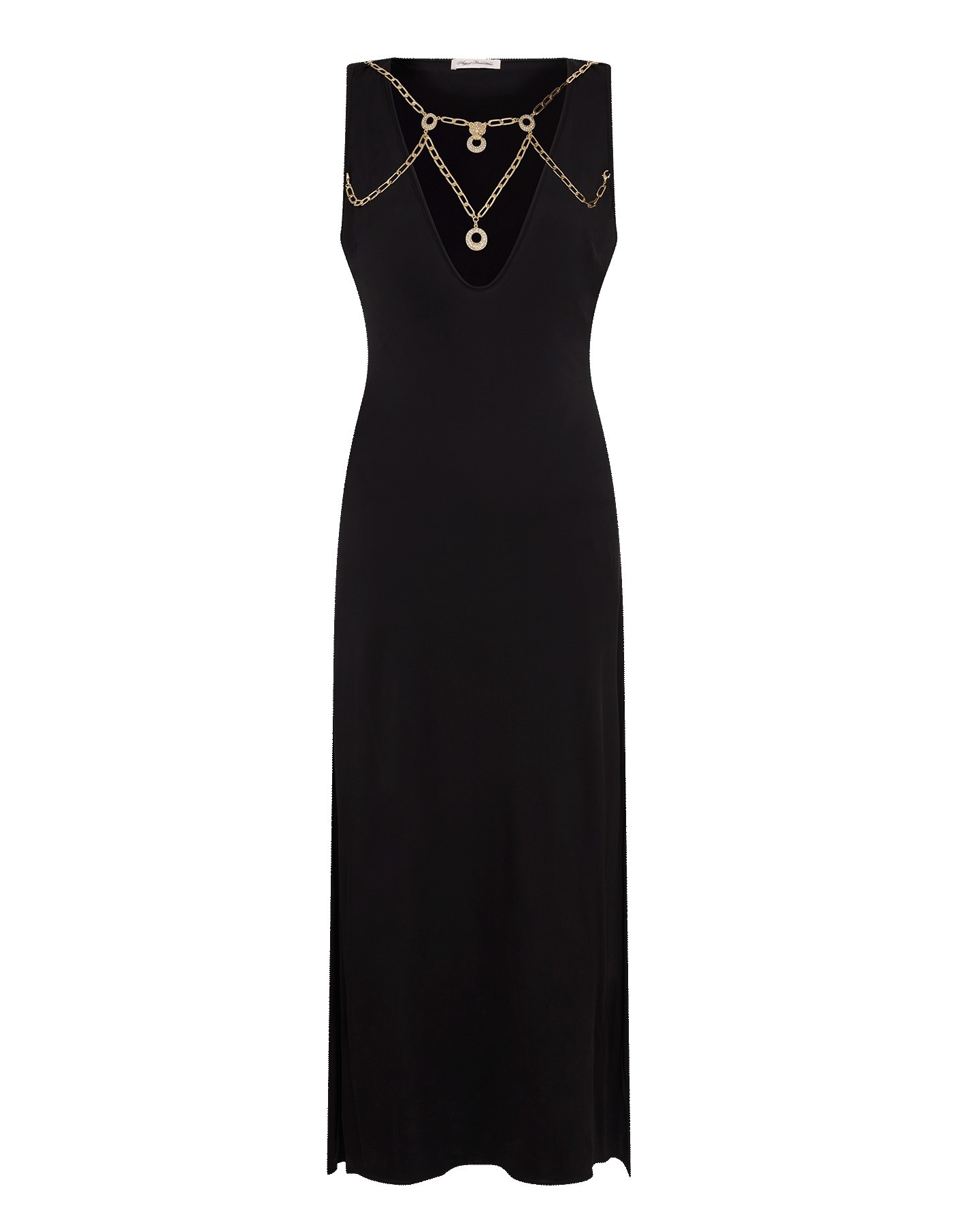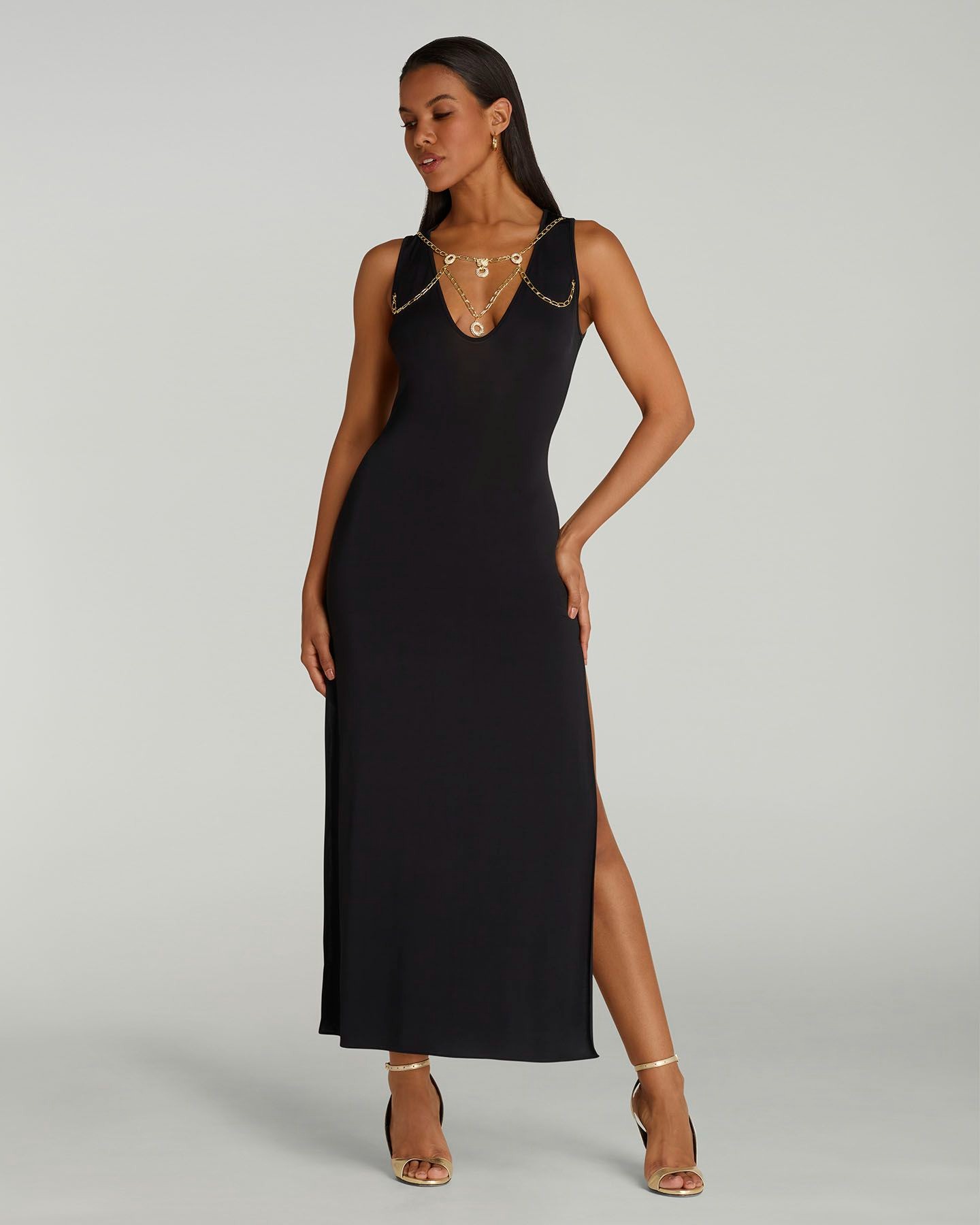 Черное пляжное платье Haislee выполнено из струящегося трикотажа, подчеркивающего силуэт. Глубокий вырез декорирован сверкающей фурнитурой с кристаллами золотого оттенка. Высокий разрез на бедре добавляет нотку дерзости. Не забудьте дополнить платье купальником Haislee для создания идеального пляжного образа.