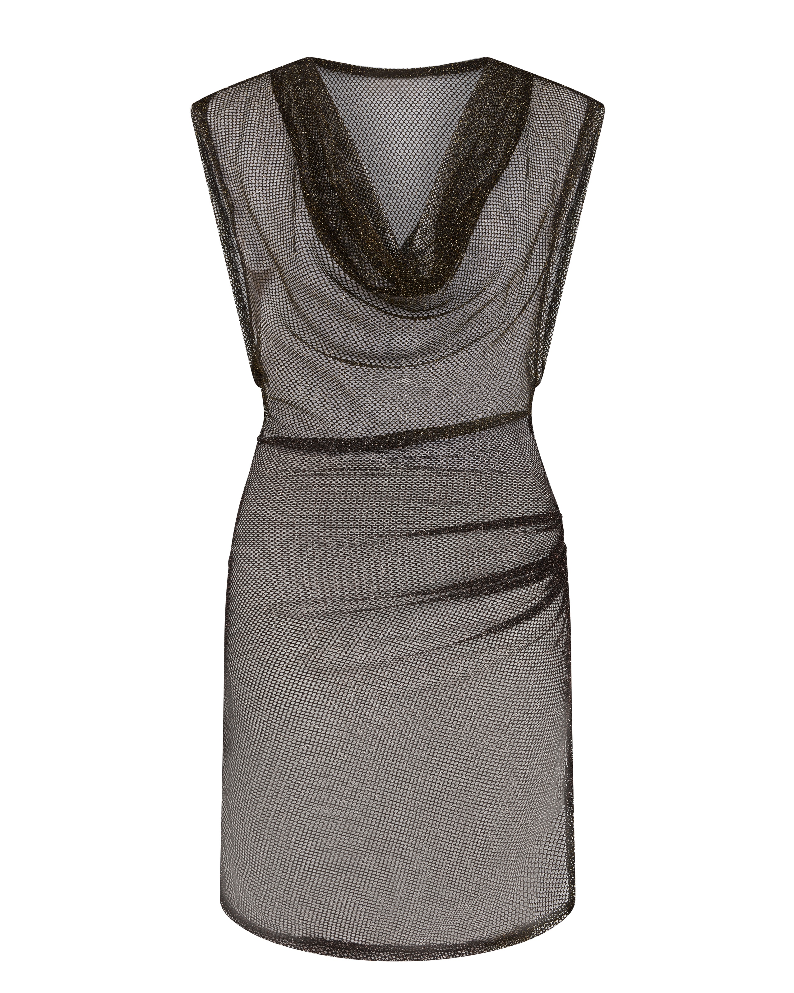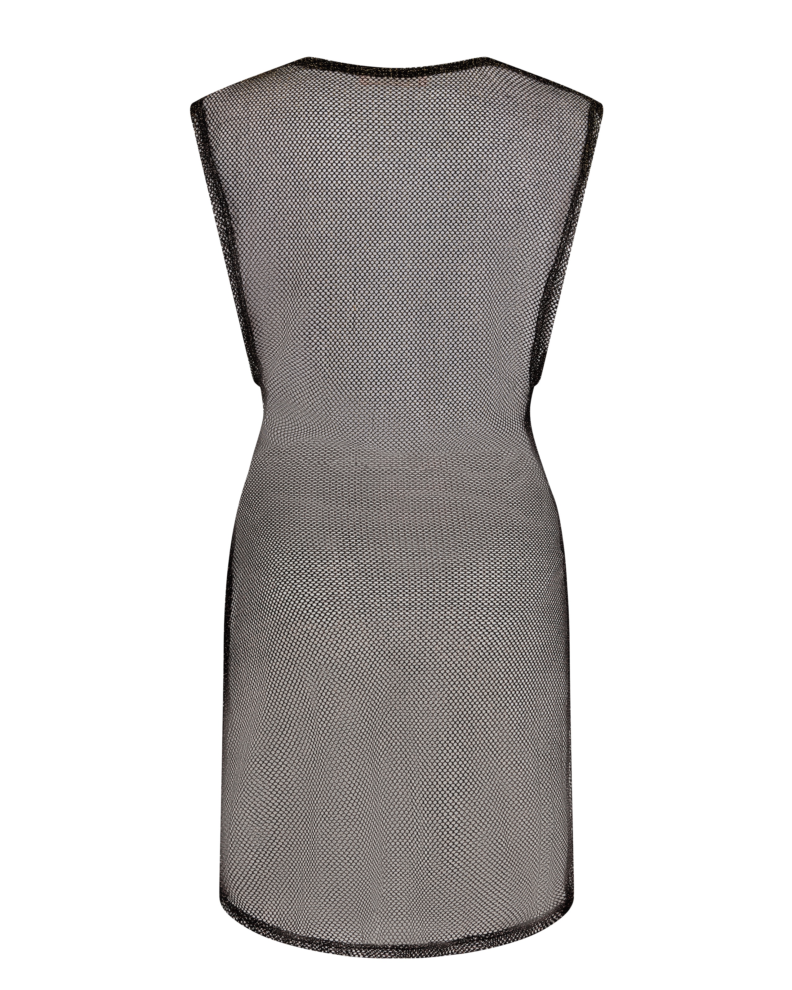 Пляжное платье Orina в глубоком черном цвете изготовлено из легкой прозрачной сетчатой ткани с мерцающими металлизированными нитями. Асимметричная деталь со сборкой и дерзким разрезом, подчеркивающим бедро. Отсутствие застежек обеспечивает легкость ношения. Создайте загадочный образ с помощью коллекции Orina.