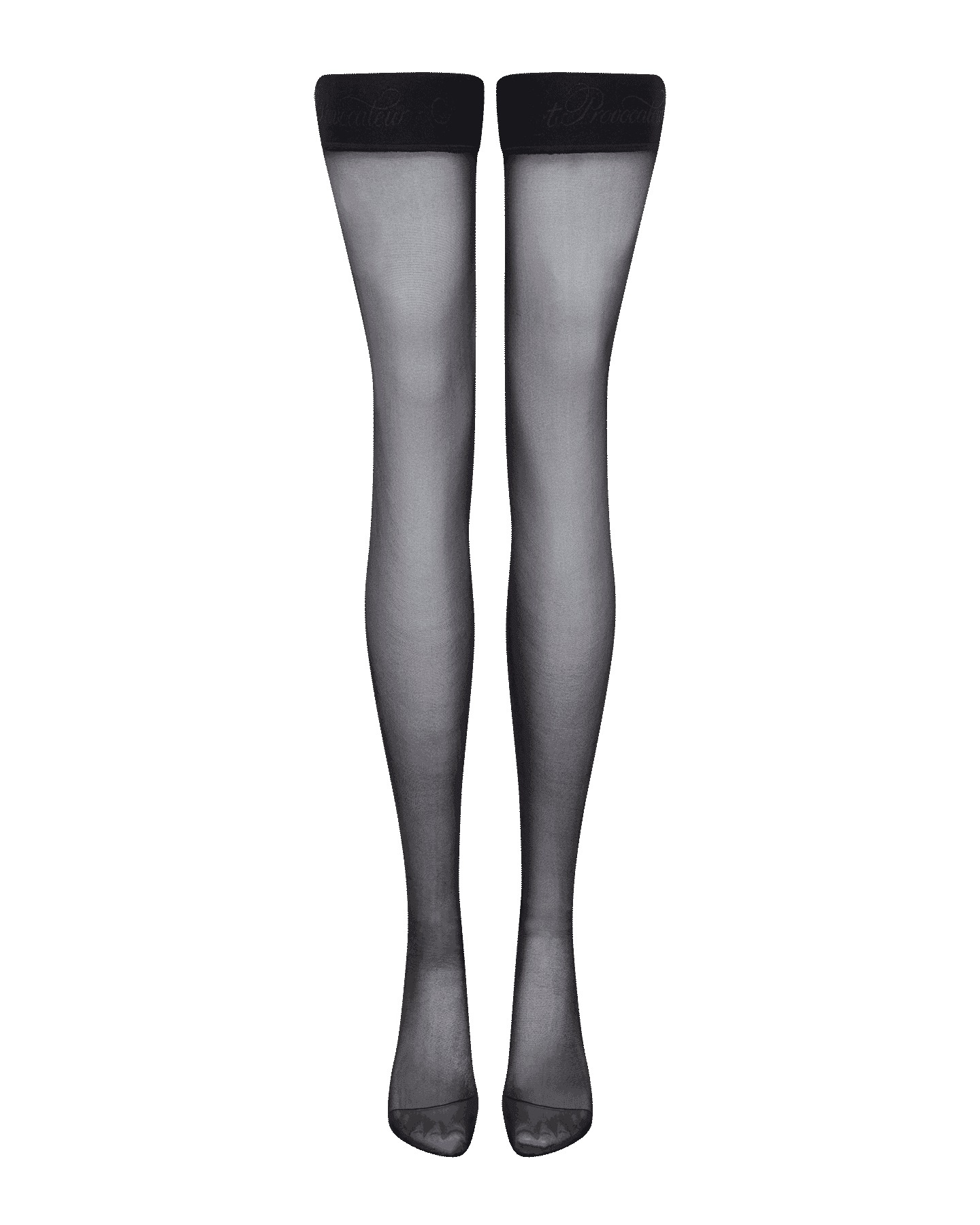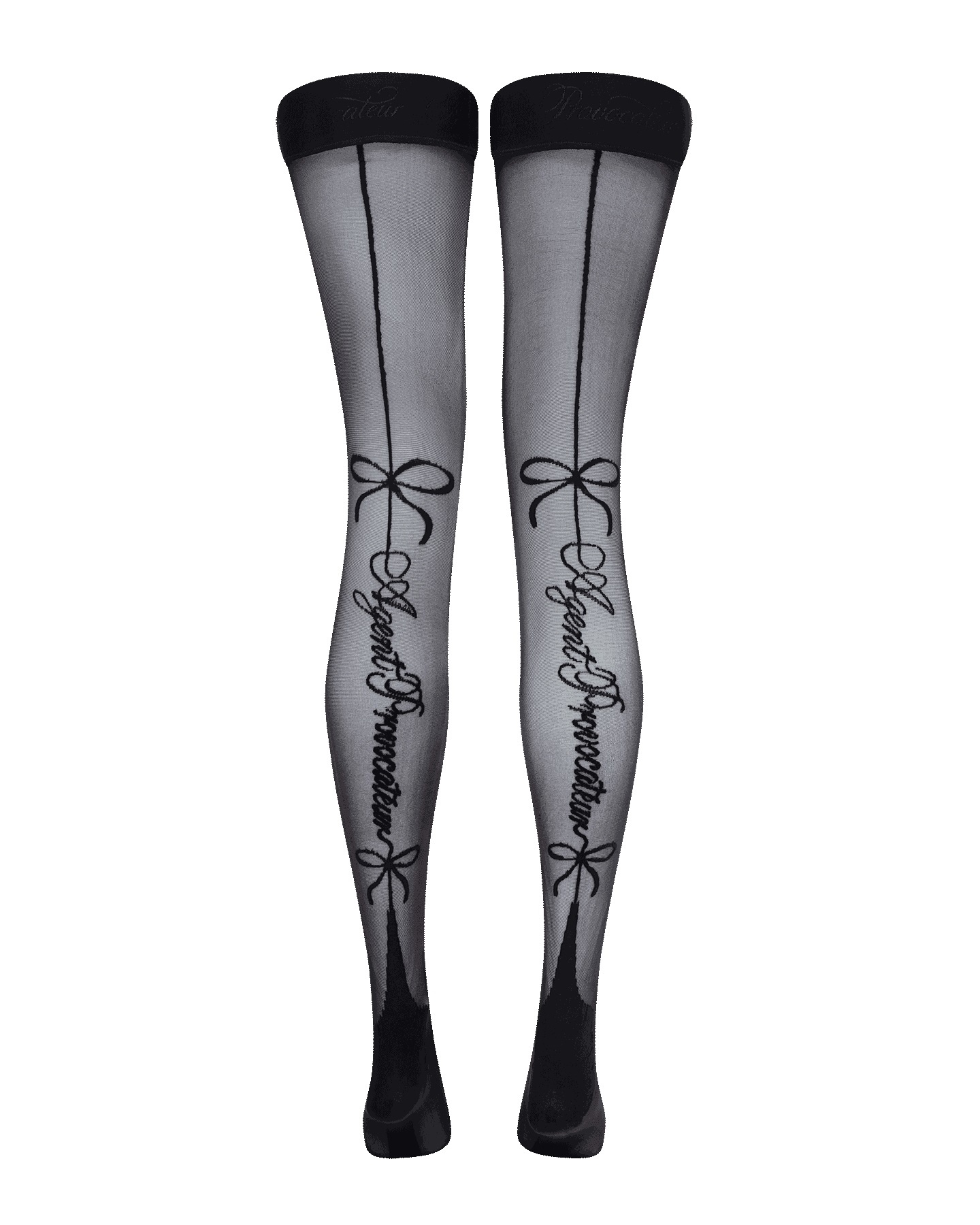 Чулки на резинке AP Signature черного цвета. Их отличительная черта — фирменный дизайн шва-стрелки на задней части. Идеальный фон для любого комплекта Agent Provocateur.