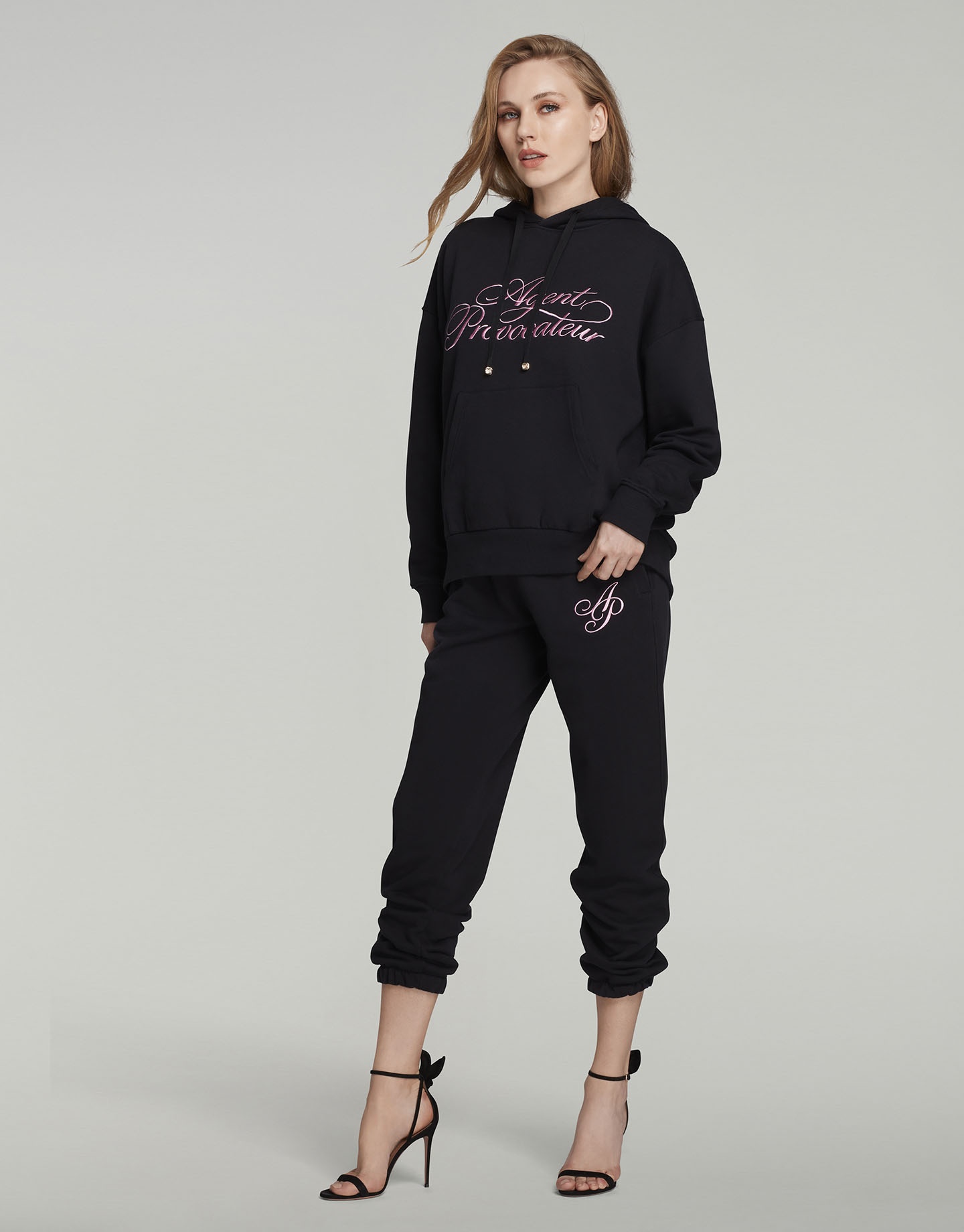Домашние брюки-джоггеры Rayley в черном цвете сшиты из хлопка, который отличается мягкостью и особенно комфортен к телу. Фирменная стилистика бренда Agent Provocateur выражена монограммой АР, вышитой светло-розовыми нитками. Эта модель дополнена боковыми карманами, поясом-резинкой и манжетами. Дополнить комплект стоит худи Rayley.