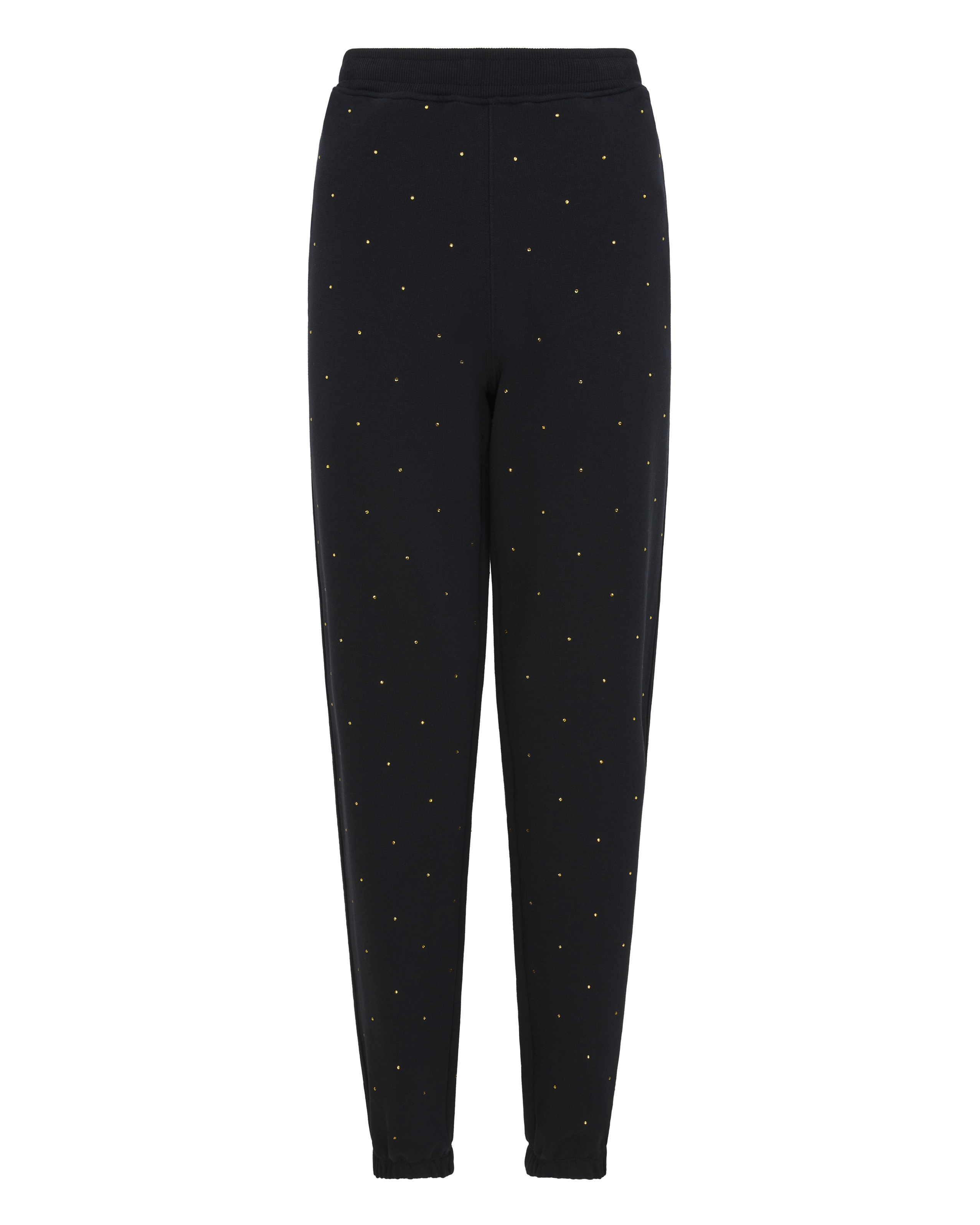 Черные джоггеры Rayley Stud украшены блестящими золотыми кристаллами. Выполненные из мягкого органического хлопкового джерси, они обеспечивают комфорт благодаря эластичному поясу и удобным карманам. Логотип AP, вышитый золотой нитью на задней части, добавляет изящный штрих. Носите их после тренировки или в повседневной жизни, сочетая с другими элементами коллекции Rayley Stud.