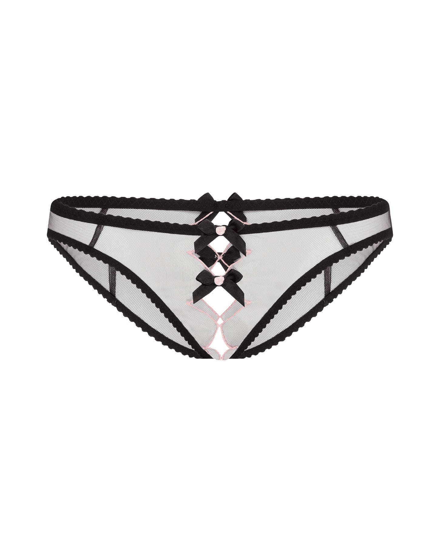 Элегантные французские трусики из полупрозрачного черного тюля с контрастной окантовкой розового цвета украшают дразнящие вырезы, спускающиеся от талии вниз. Вырезы декорированы бантиками спереди и сзади. Французские трусики украшены кокетливым продольным разрезом на ластовице для самых сладострастных моментов.