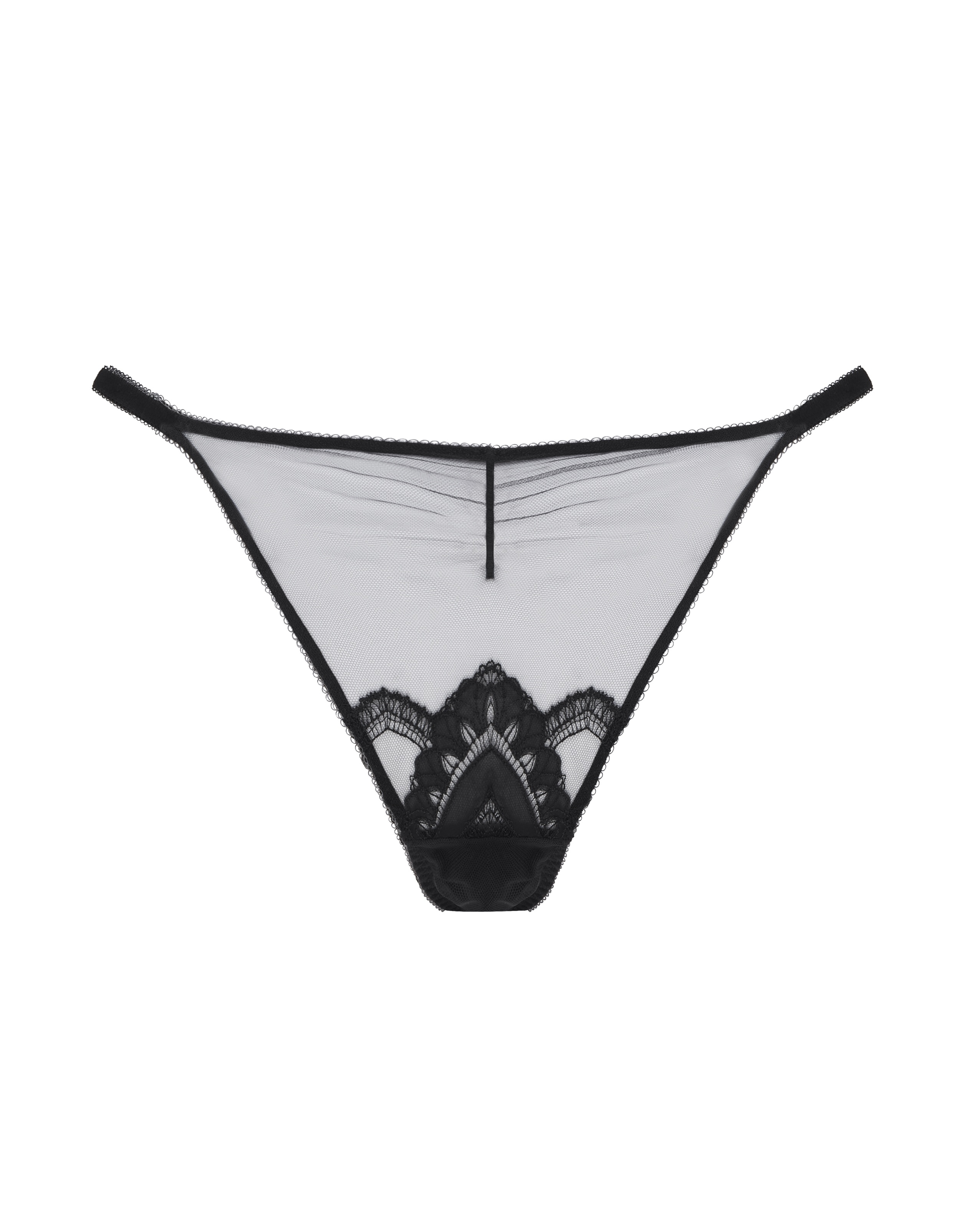 Черные классические трусы Alysia с элегантной швейцарской вышивкой, выполненной методом лазерной резки. Модель имеет крой танга, что добавляет изюминку в дизайн. Носите их с другими элементами серии Alysia для создания завораживающего образа.