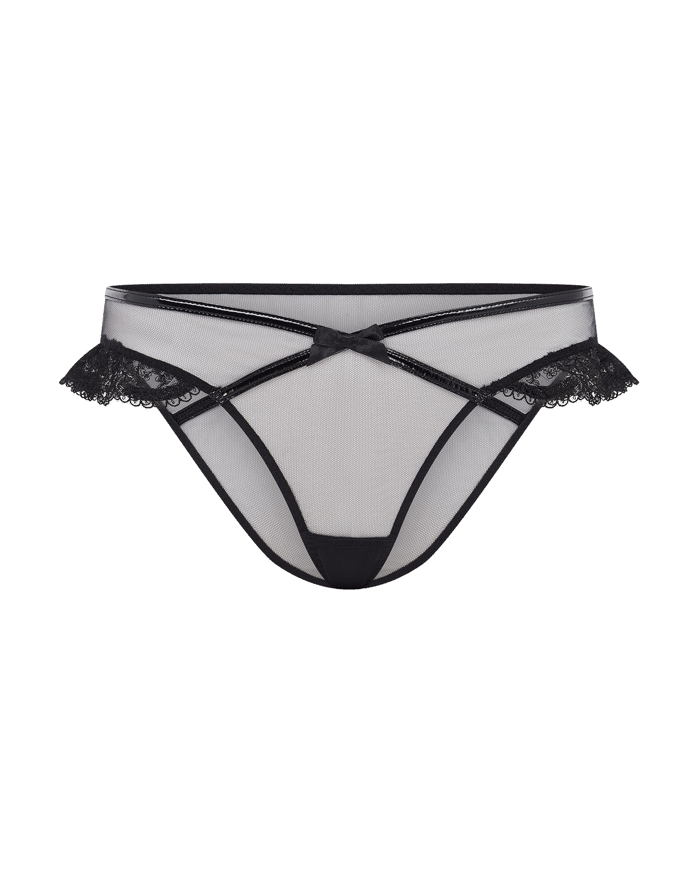 Черные классические трусы Charlotia из прозрачного тюля спереди и сзади декорированы ПВХ-отделкой в виде креста по центру. Милая цветочная вышивка на бедрах и атласный бантик спереди и сзади на крестовине создают контраст. Сочетайте с коллекцией Charlotia для максимальной дерзкой изощренности.