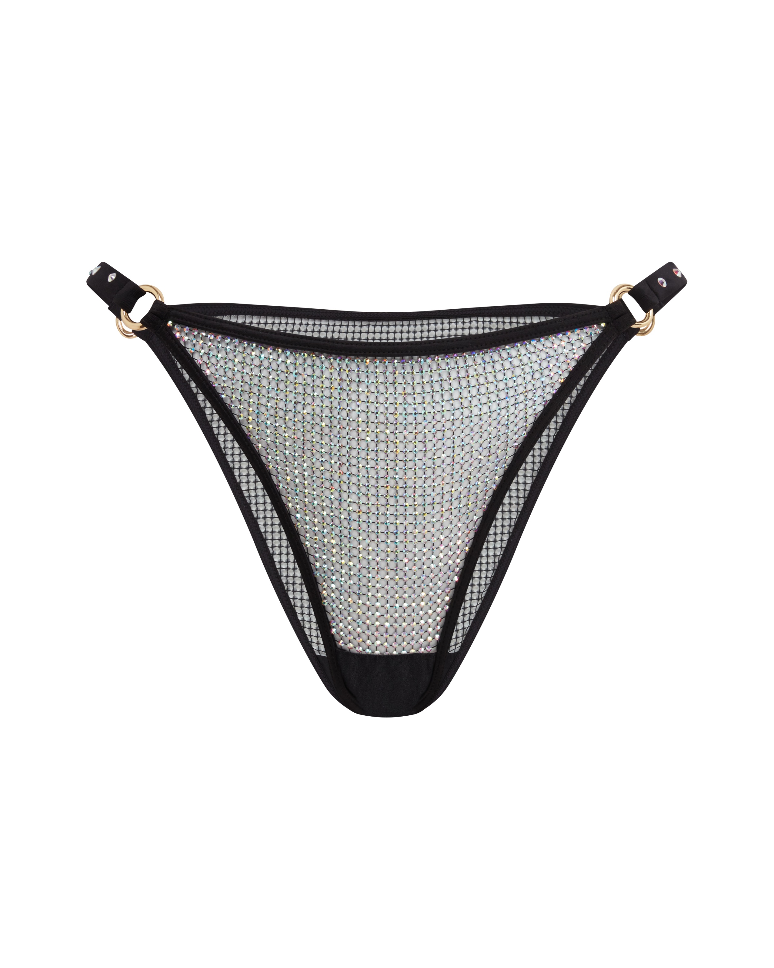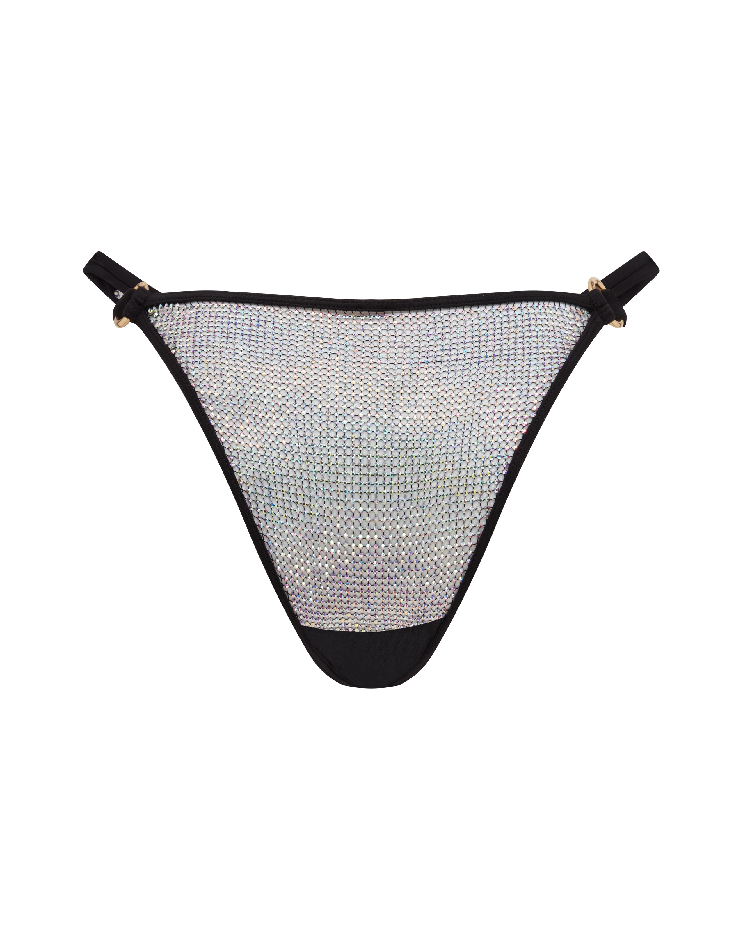 Классические трусы Estellie черного цвета с низкой посадкой. Передняя и задняя части из итальянской кристальной сетка. Боковые вставки танга выполнены из гладкого микрофибрового атласа со стразами. Перед и спинка окантованы гладким микрофибровым атласом. Акценты — массивные золотистые кольца. Шелковая ластовица. Дополните роскошный образ бельем Estellie.