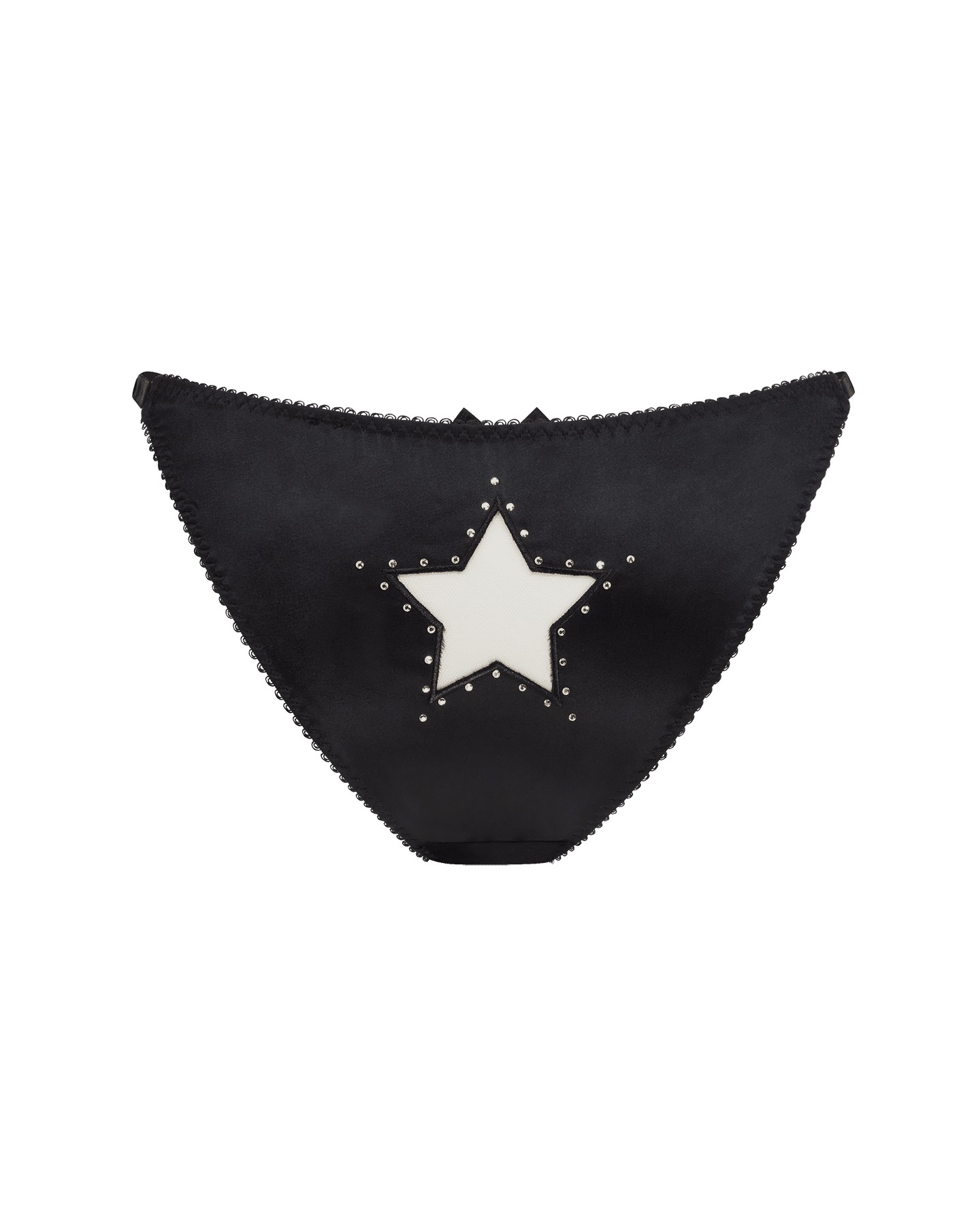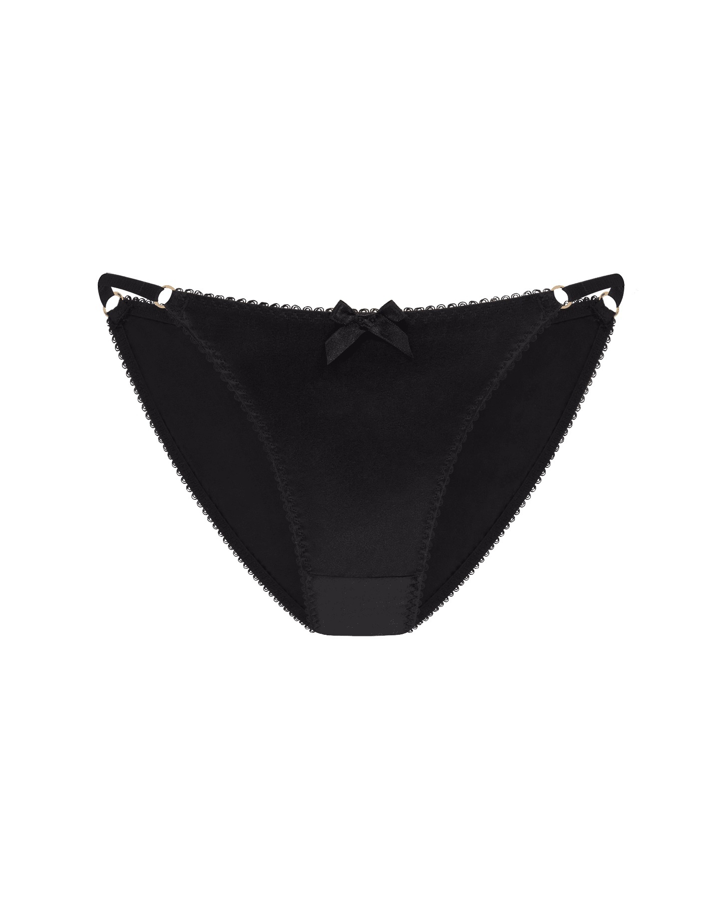 Классические трусы Ettie черного цвета из шелкового атласа украшены ажурным сердечком сзади. Волнистая окантовка талии, золотистые кольца и эластичные черные боковые лямки дополняют дизайн.