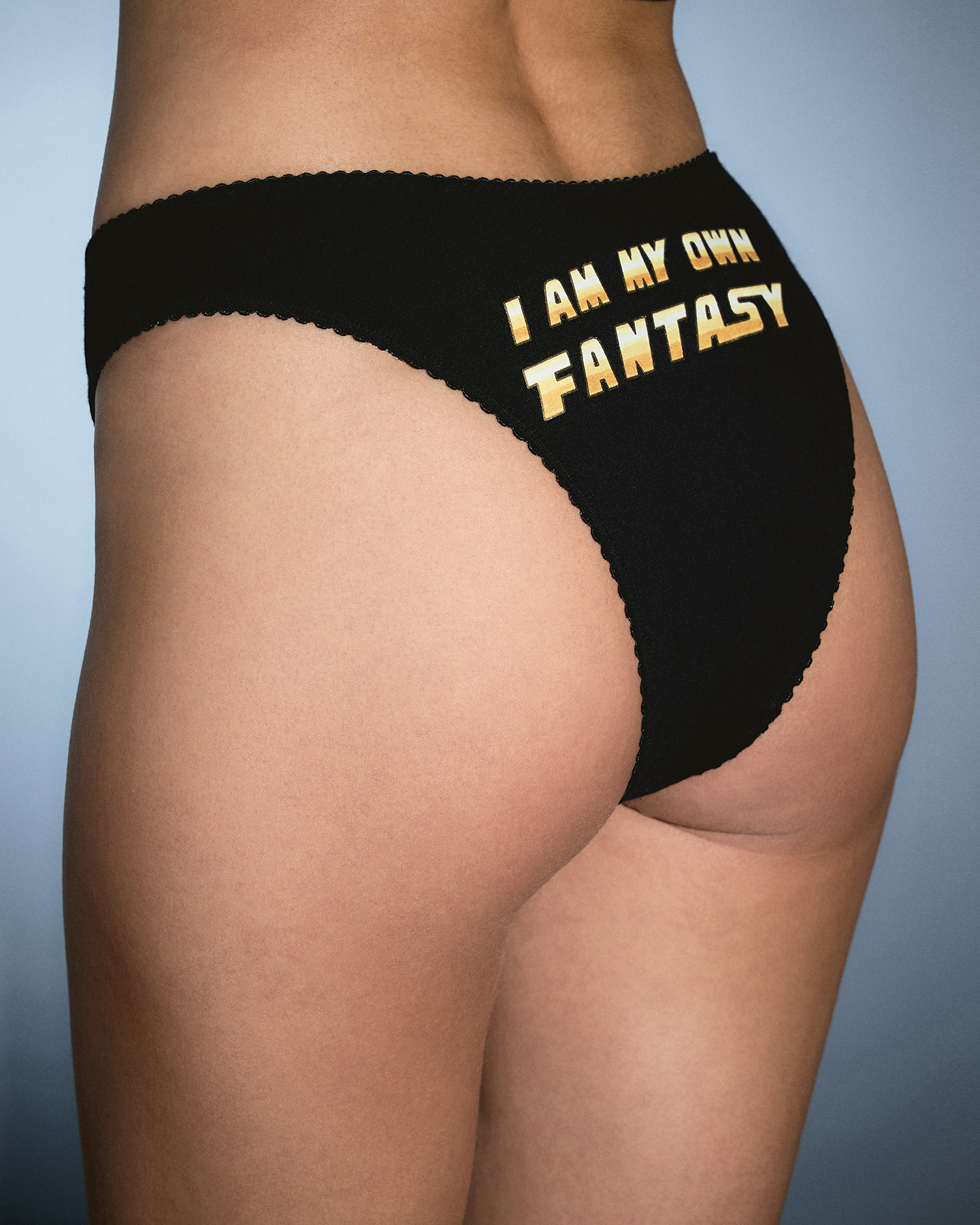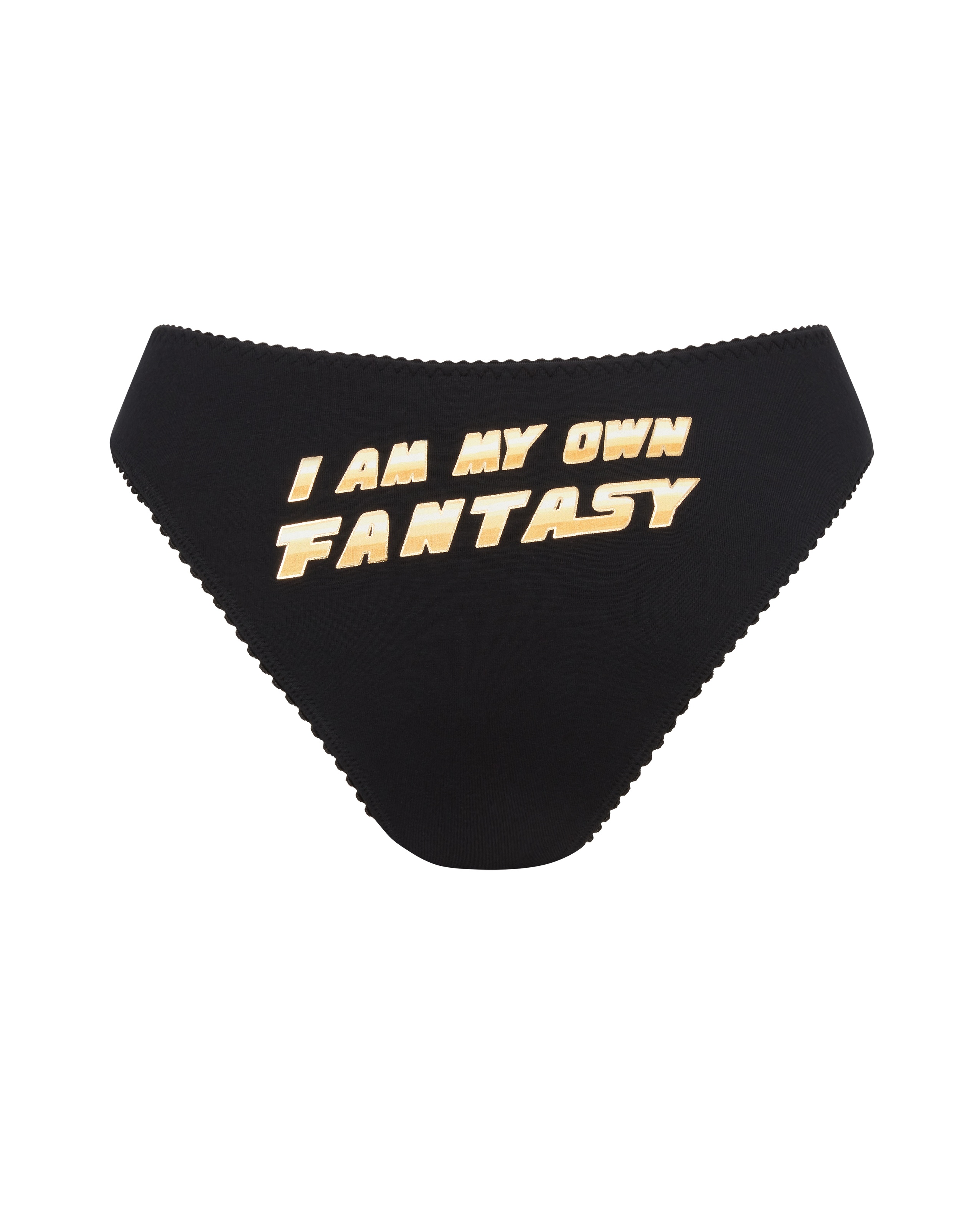 Классические трусы Fantasy черного цвета из гладкого джерси с ярким принтом Rocket Girl на спине с золотыми фольгированными акцентами. Завершает образ бант по центру. Идеальная пара для майки Fantasy, создающая игривый и стильный комплект для смелых экспериментов.