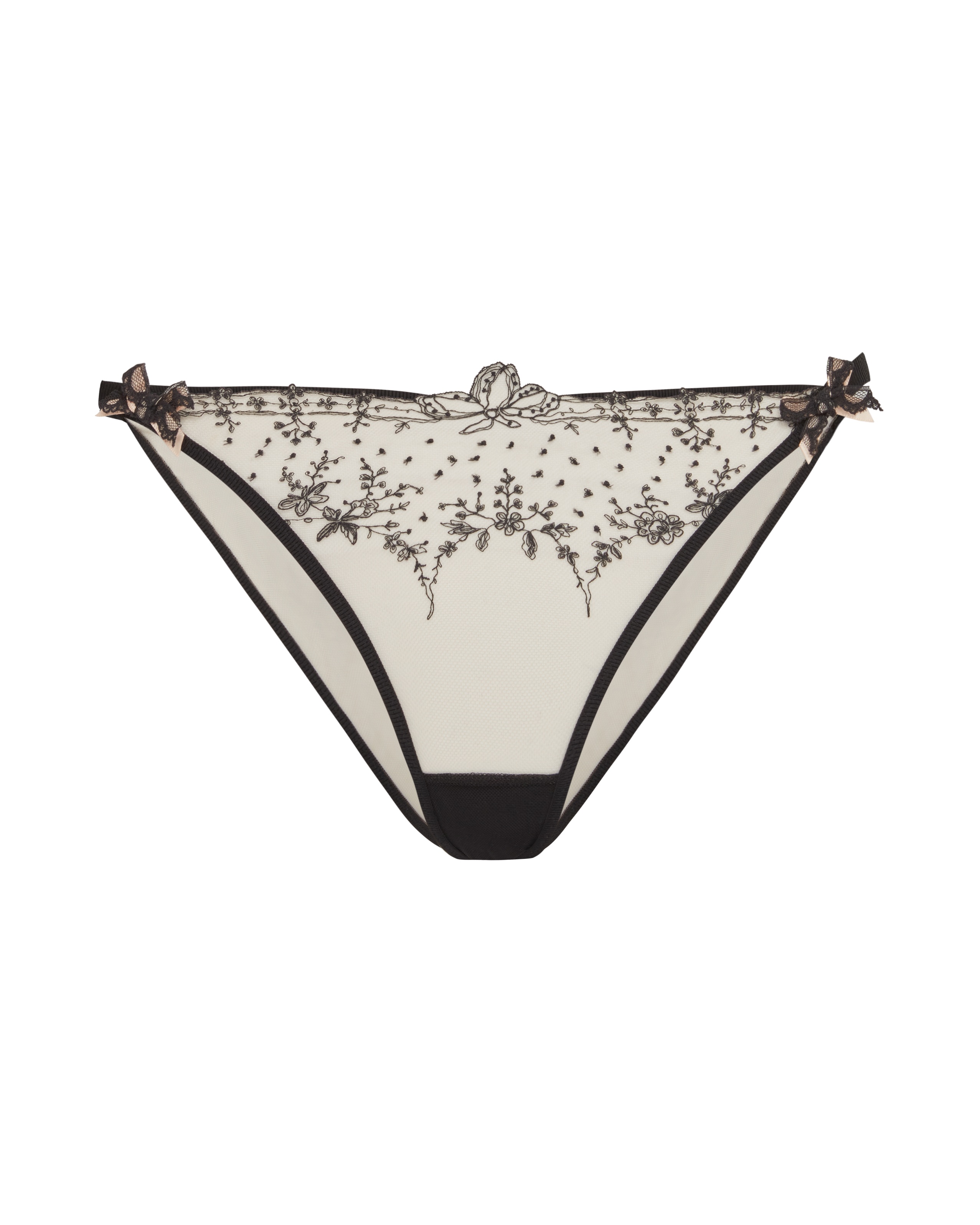 Классические трусы Graice черного цвета сочетают нежный песочный тюль и черную строчку, дополняя сложную цветочную вышивку. Элегантная прозрачность спереди и соблазнительное открытие сзади, отделка из изящных бантов. Позвольте коллекции Graice научить вас искусству соблазнения.