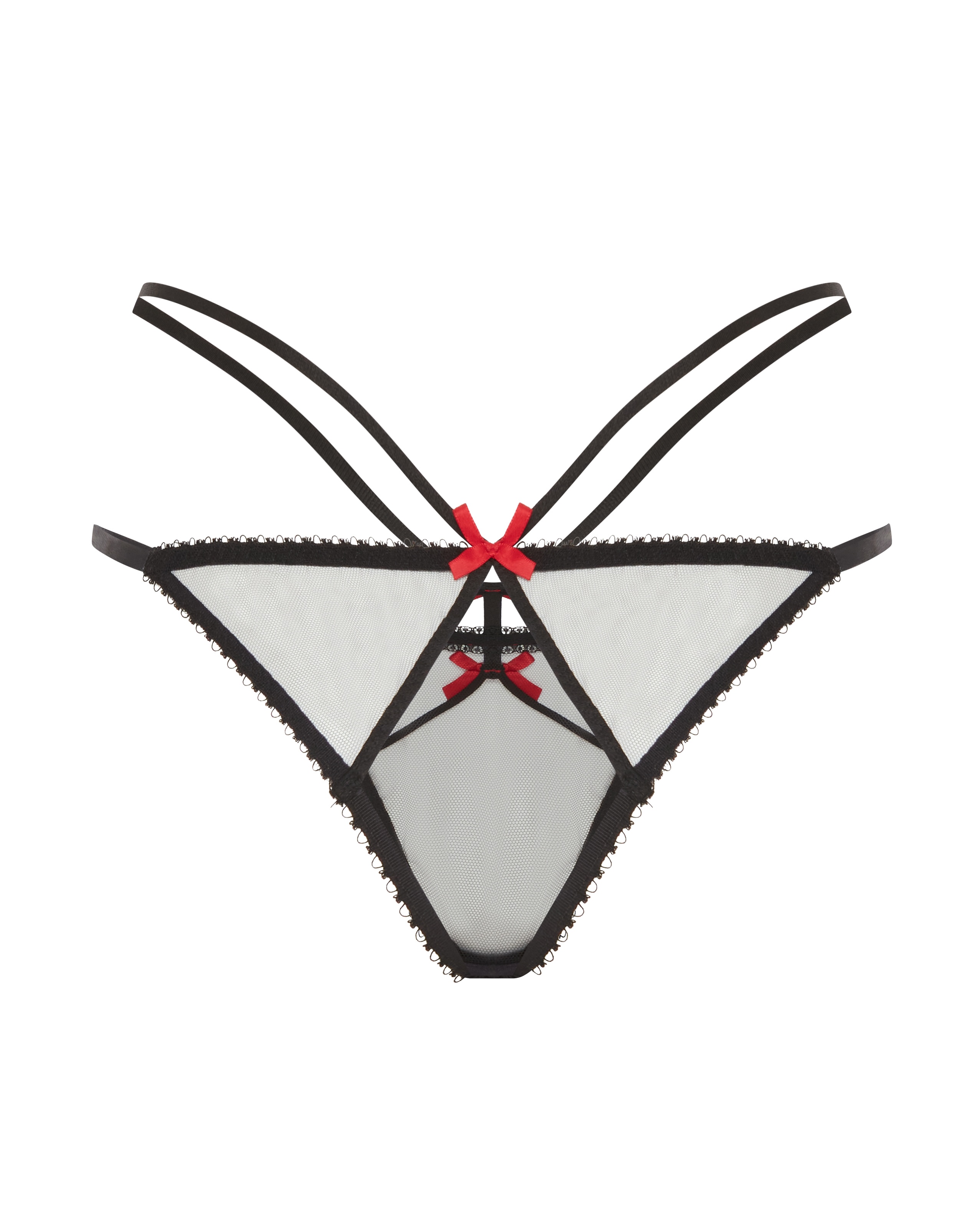 Классические трусы Hetty черного цвета с низкой талией в стиле танга, открытой спиной и смелым вырезом сзади. Эластичная обвязка-рулик образует Х-образный узор спереди и сзади, дополненный контрастной лентой. Невидимый тюль и миниатюрные атласные банты на соединениях лямок завершают образ. Сочетайте с другими вещами из комплекта Hetty.
