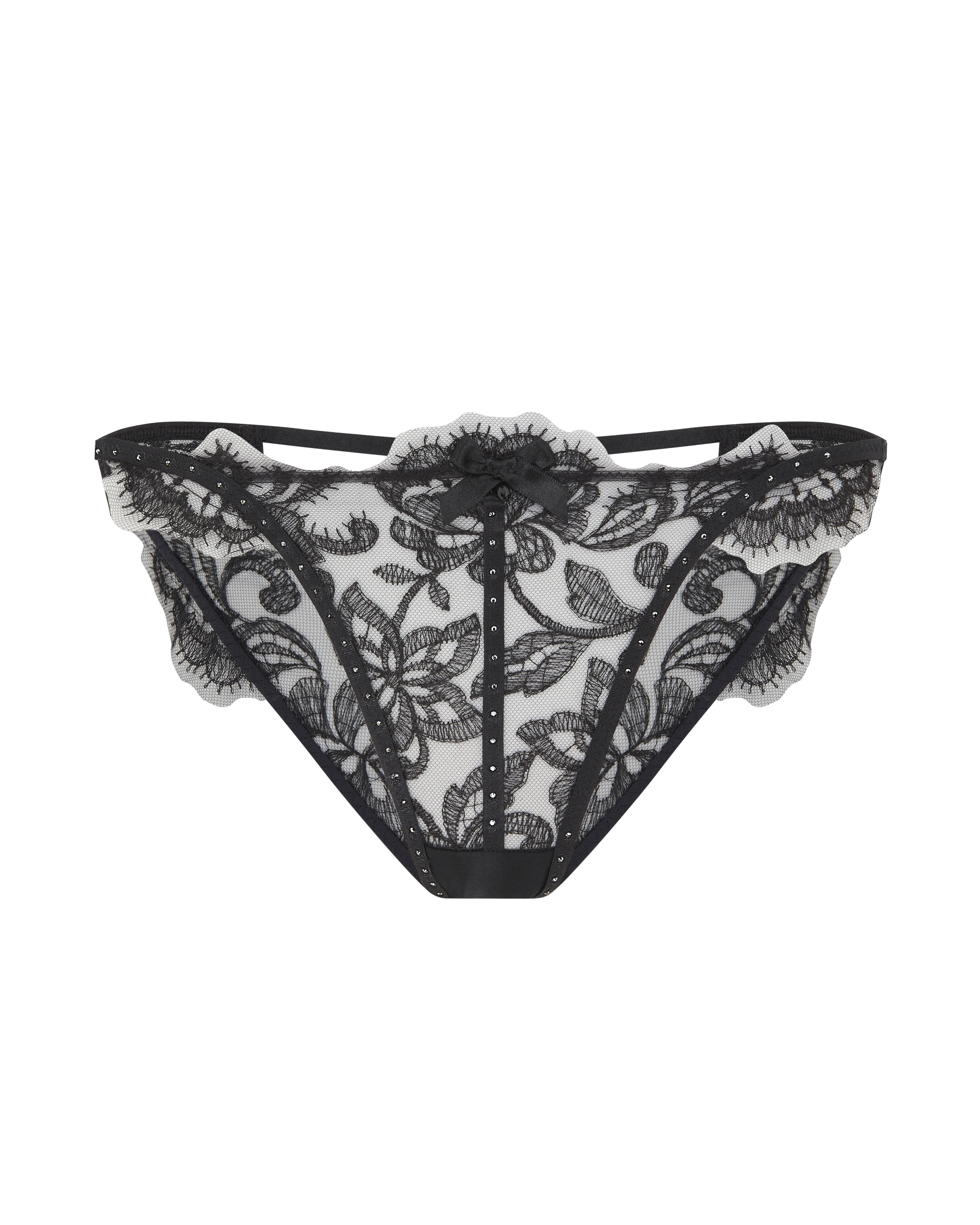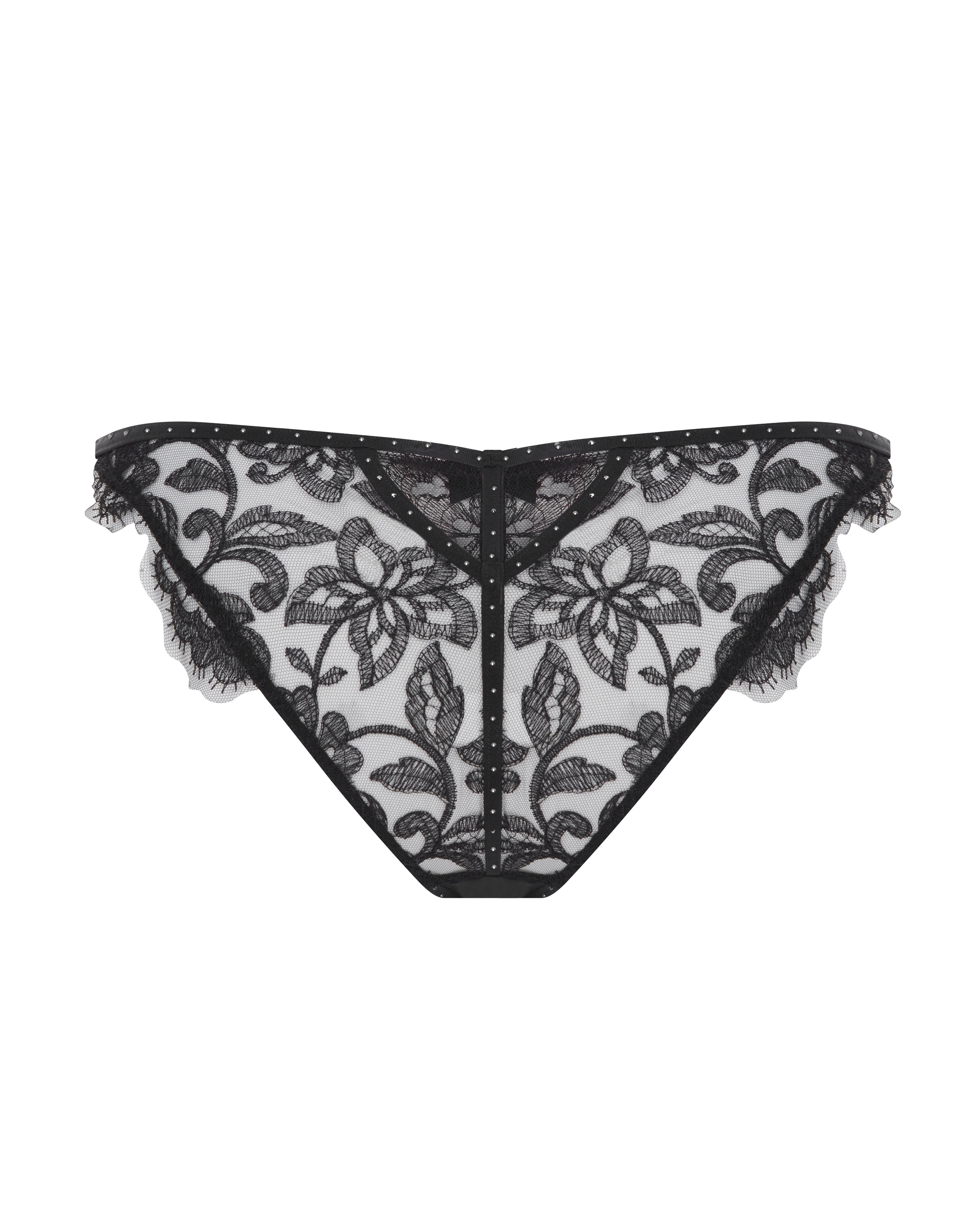 Черные классические трусы Krystabell выполнены в сексуальном стиле танга и украшены потрясающей австрийской цветочной вышивкой. Мягкие ремешки с кристаллами Swarovski® Jet Hematite и шелковая подкладка ластовицы добавляют изысканности и комфорта.