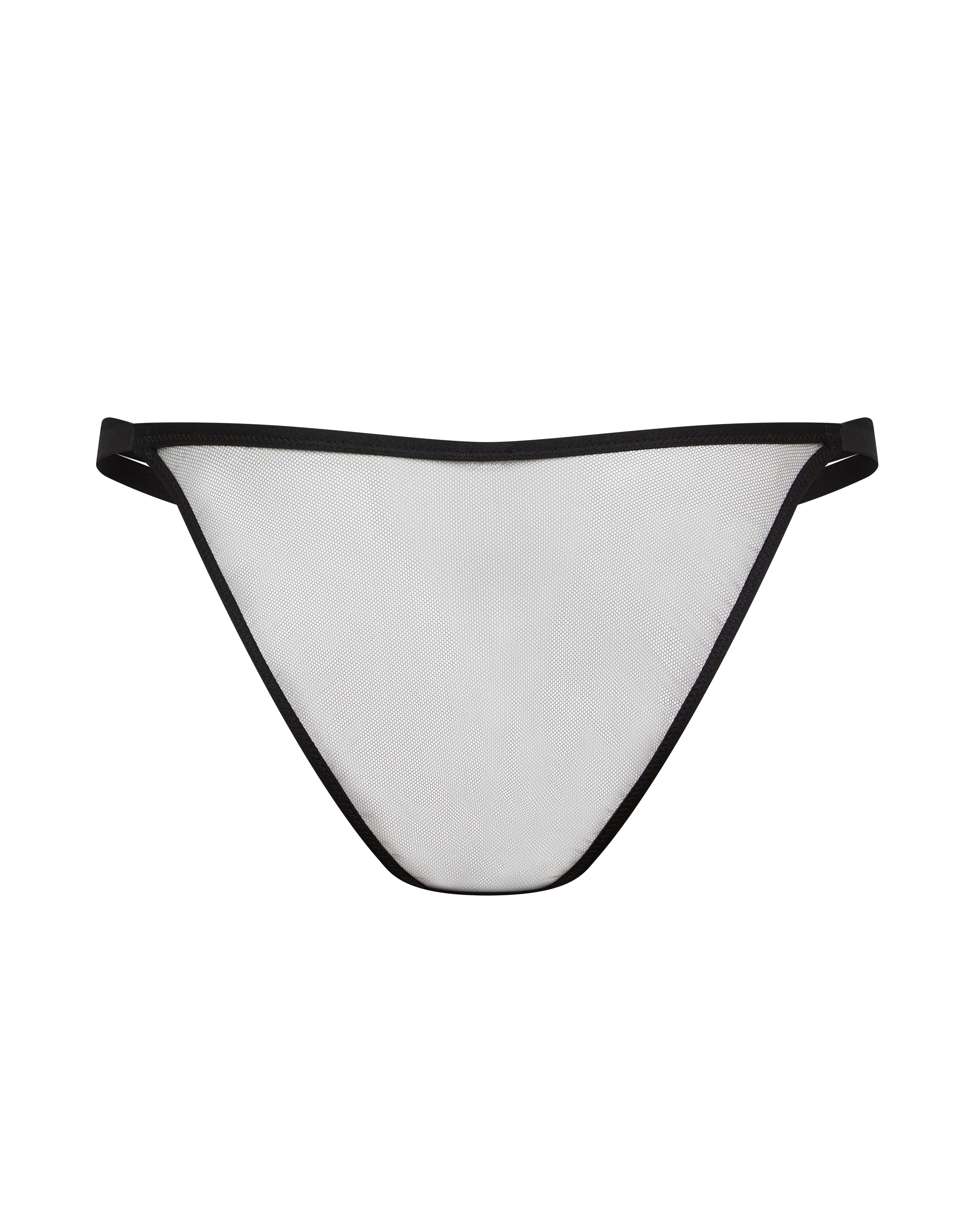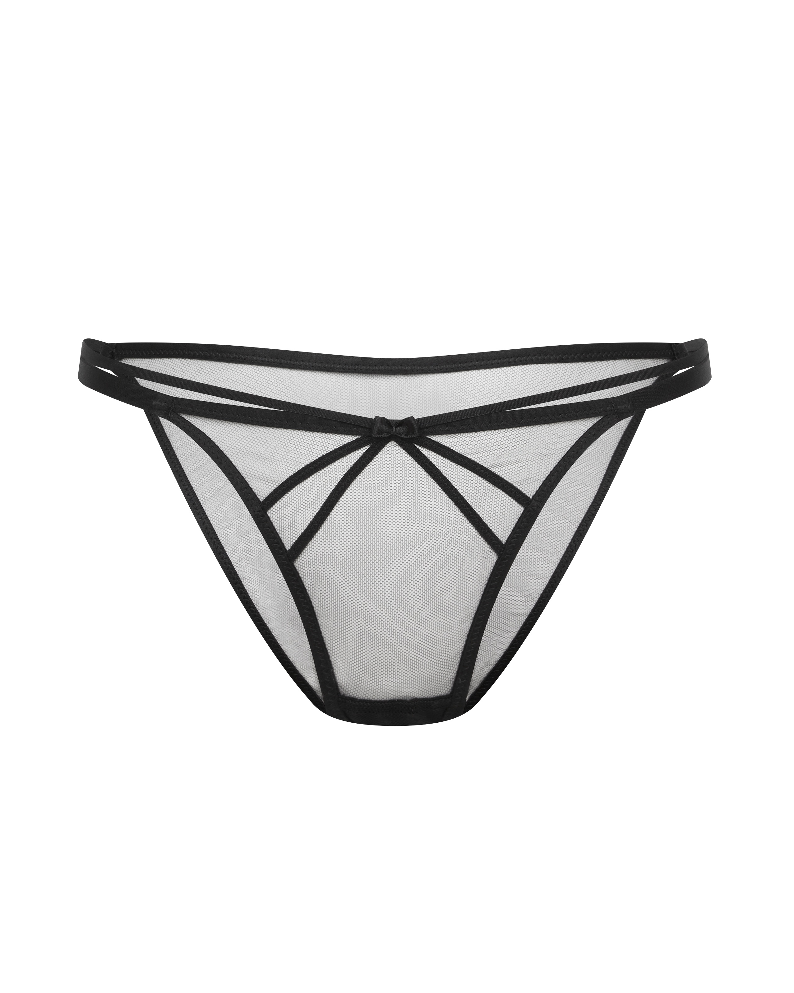 Классические трусы Missi черного цвета на основе прозрачного итальянского тюля. Деталь в виде ремешков на передней панели и линии талии, подчеркивающая изгибы. Миниатюрный бант-«бабочка» спереди. Ультрамягкие боковины танга. Сочетайте с бюстгальтером Missi для цельного образа.