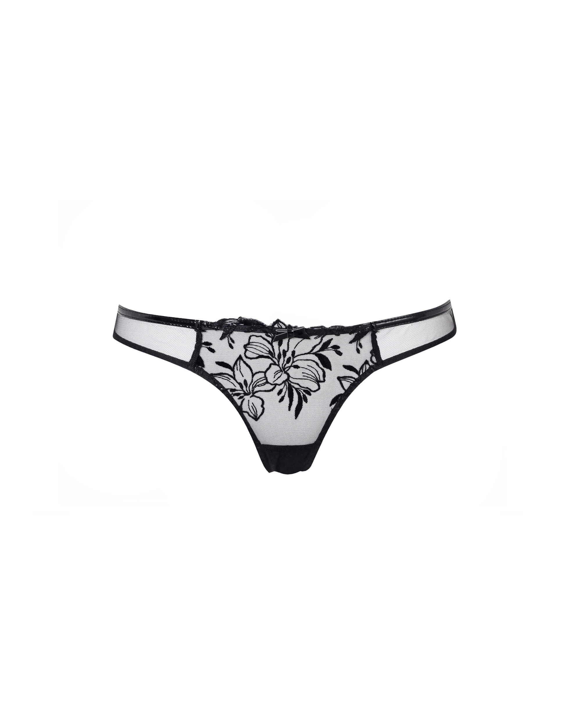 Черные трусики из прозрачного тюля украшены цветочной вышивкой с «мокрым» эффектом. Черная отделка из эластичной искусственной кожи вдоль линии бедер и перекрещивающиеся эластичные ленты, создающие эффект вырезов, завершают образ.