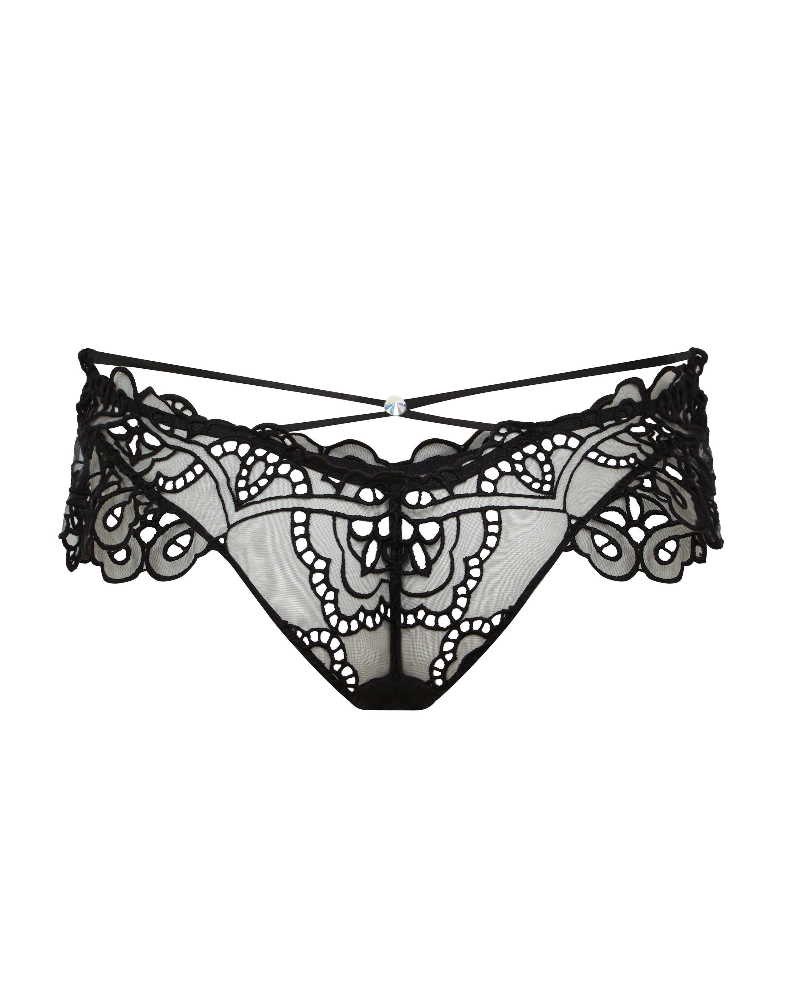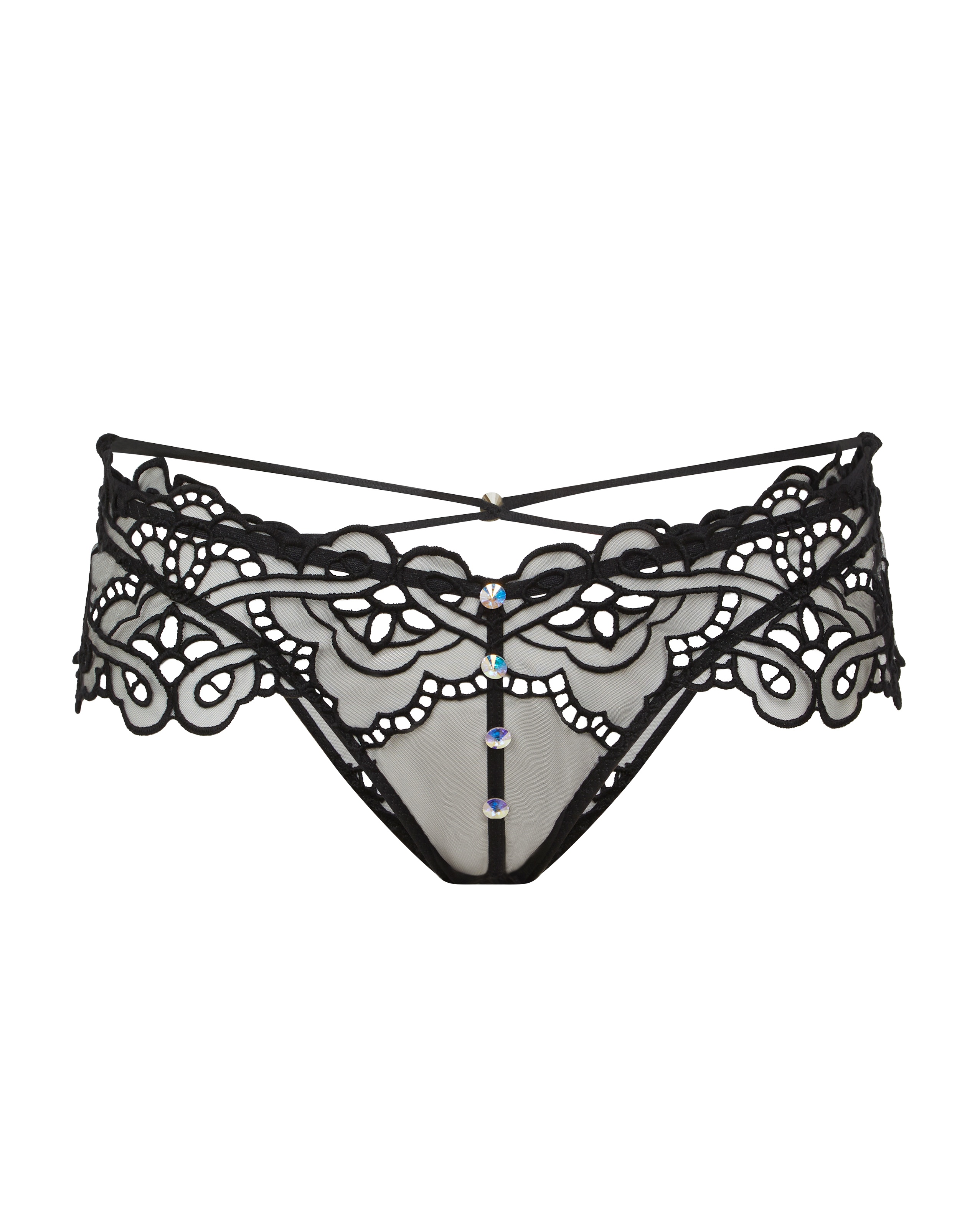 Классические трусы Seren черного цвета с низкой посадкой выполнены на основе итальянского тюля с гипюрной вышивкой. Декоративные пуговицы из кристаллов Swarovski®, шелковая ластовица и дерзкая деталь в виде ремешков сзади. Сочетайте с другими предметами коллекции Seren для соблазнительного ансамбля.