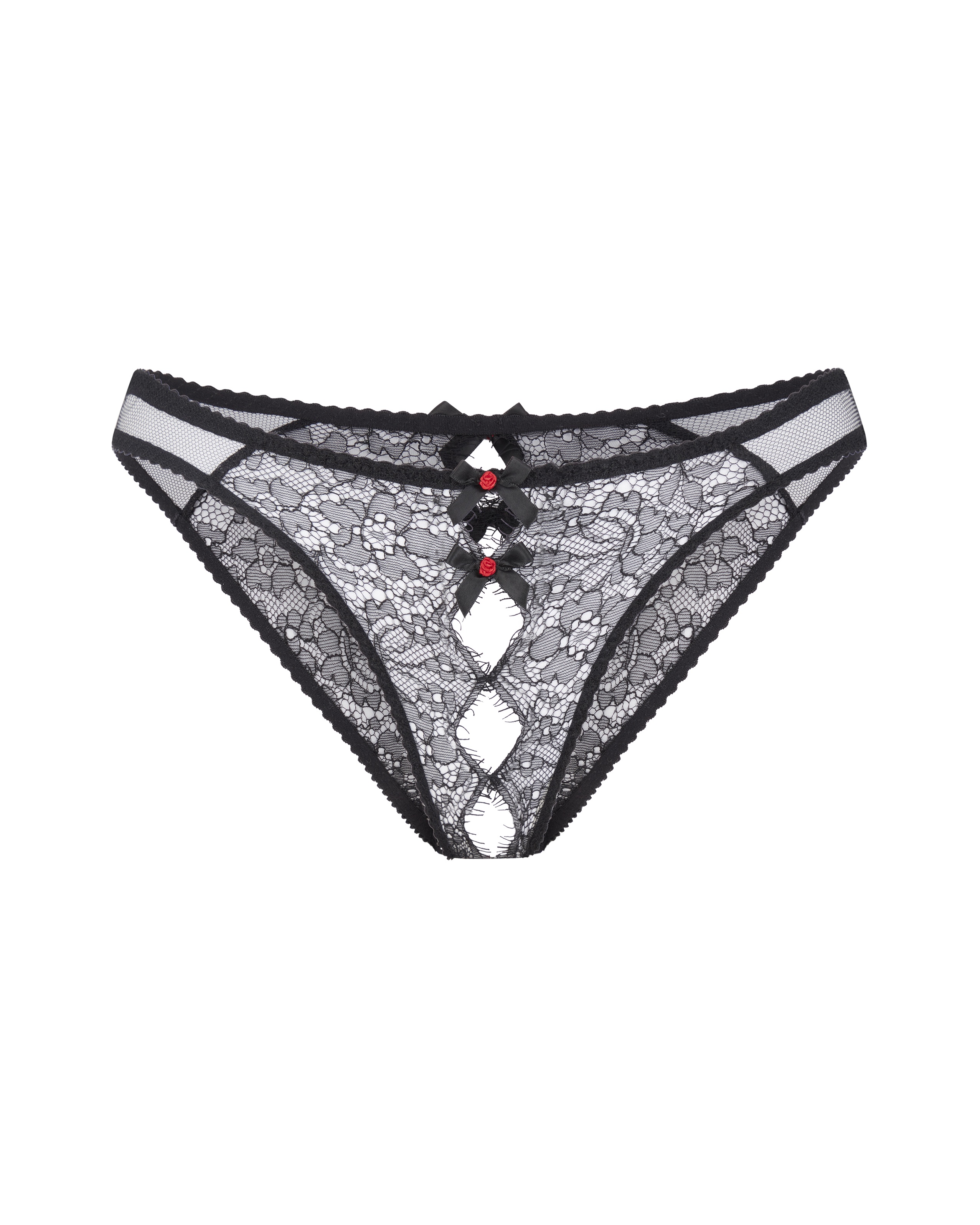 Французские трусики из коллекции Lorna Lace, которая стала новым прочтением культовой линейки в кружеве. Эта модель со смелыми вырезами спереди и сзади выполнена из черного кружева, создающего обворожительный контраст на коже, и украшена атласными бантами с красными бутонами. Дополните роскошный образ бюстгальтером и поясом Lorna Lace.