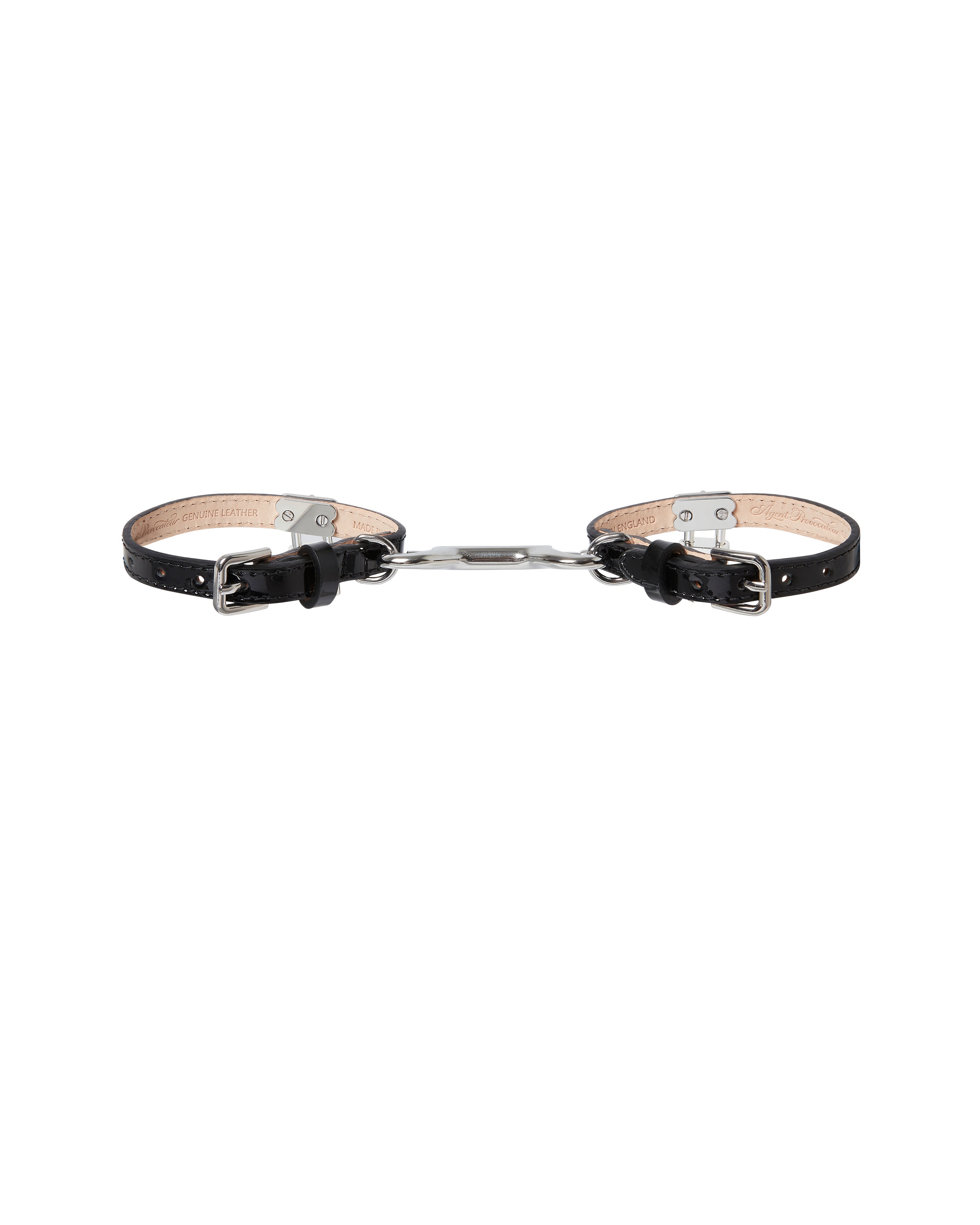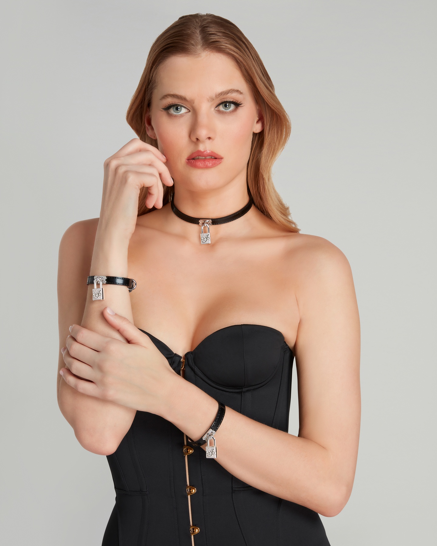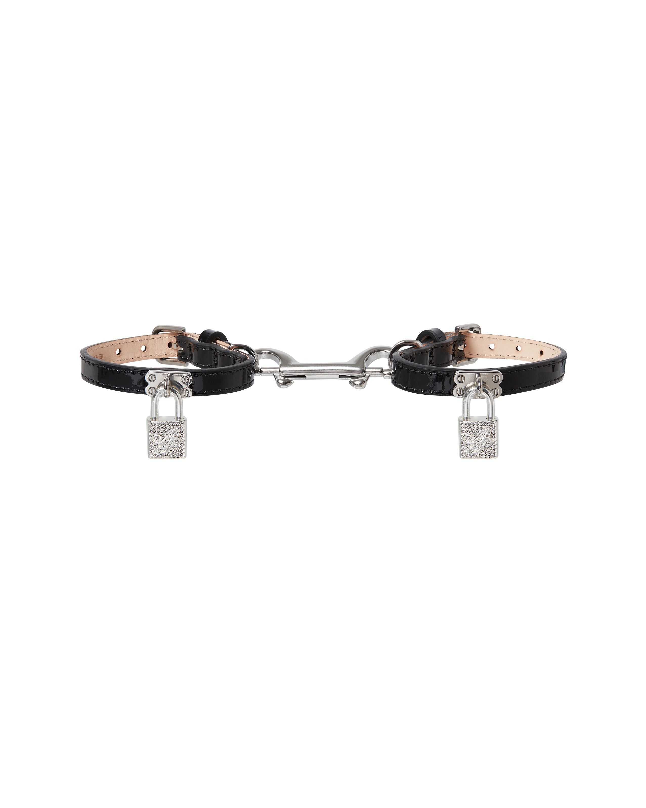 Манжеты Bess черного цвета из лаковой кожи с мягкой подкладкой из нубука. Замок с кристаллами и металлический коннектор для игривой связки. Регулируемая застежка-пряжка. Дополните дерзкий образ чокером Bess.