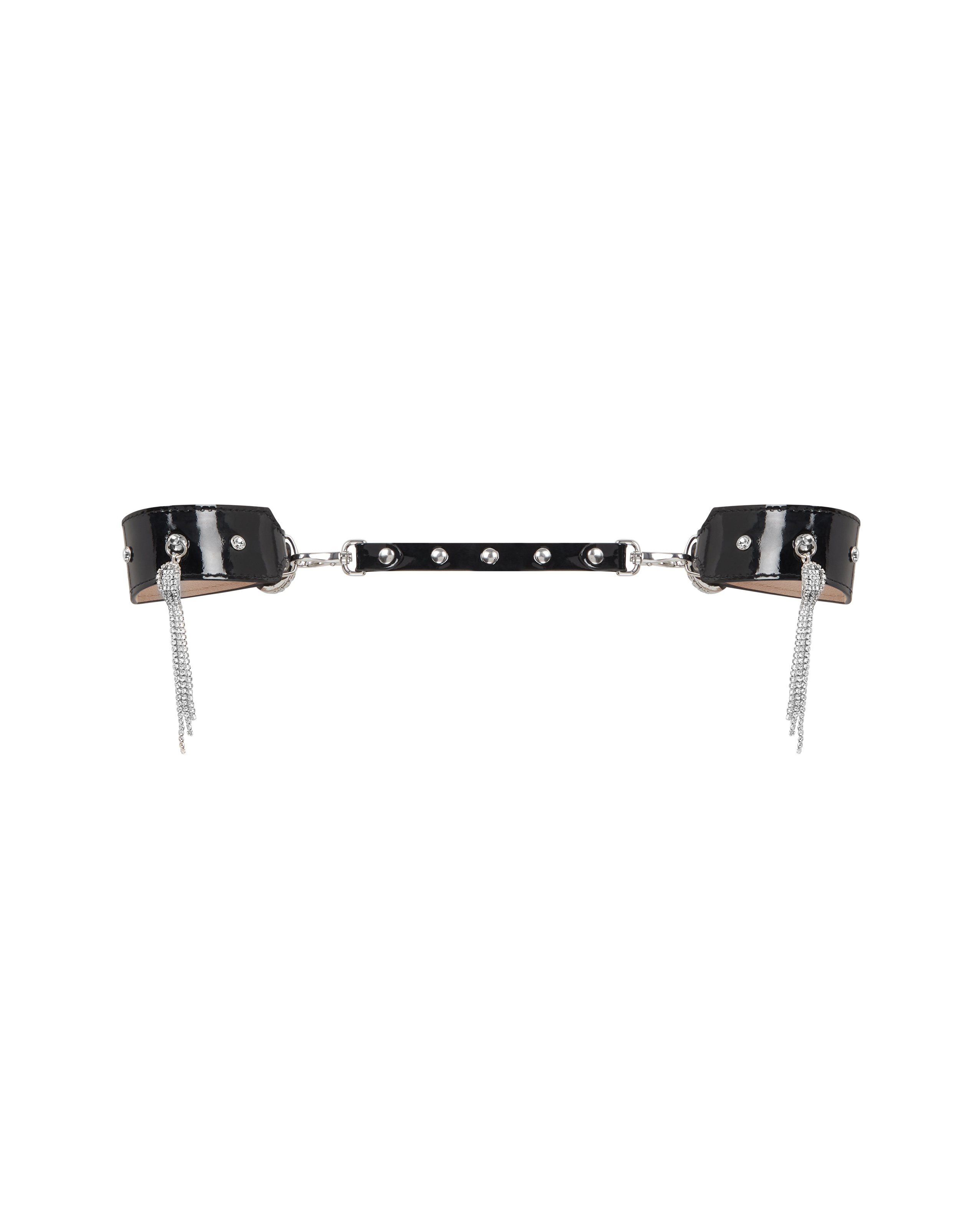 Манжеты Chrystalina черного цвета из лакированной кожи с кристальными заклепками и фирменными кистями стирают грань между бондажем и ювелирным искусством. Съемный коннектор позволяет носить их как парный комплект или как самостоятельные браслеты. В любом случае, вы будете в центре внимания.