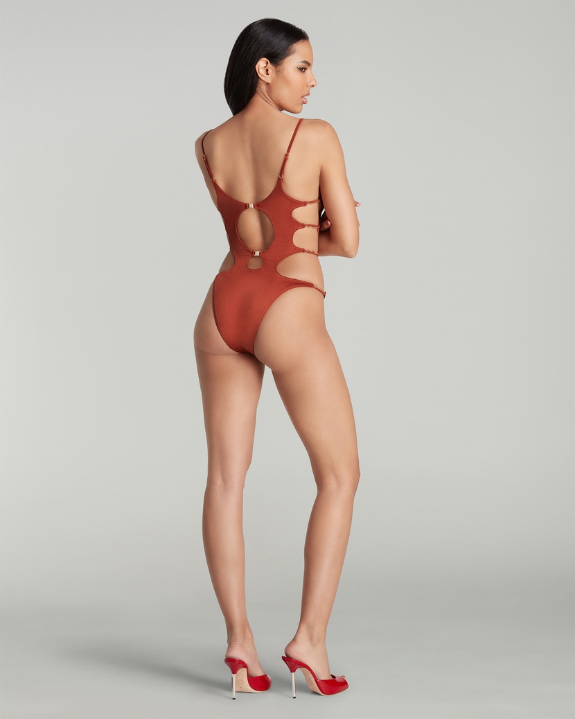Плавки купальника Christiana выполнены из черной итальянской ткани с блестящим эффектом. Дизайн включает привлекательные вырезы с золотистыми цепочками и сверкающими кристаллами. Детали с золотым покрытием гарантируют долговечность в водной среде и при высоких температурах. Идеально сочетаются с топом Christiana для создания эффектного образа на пляже.