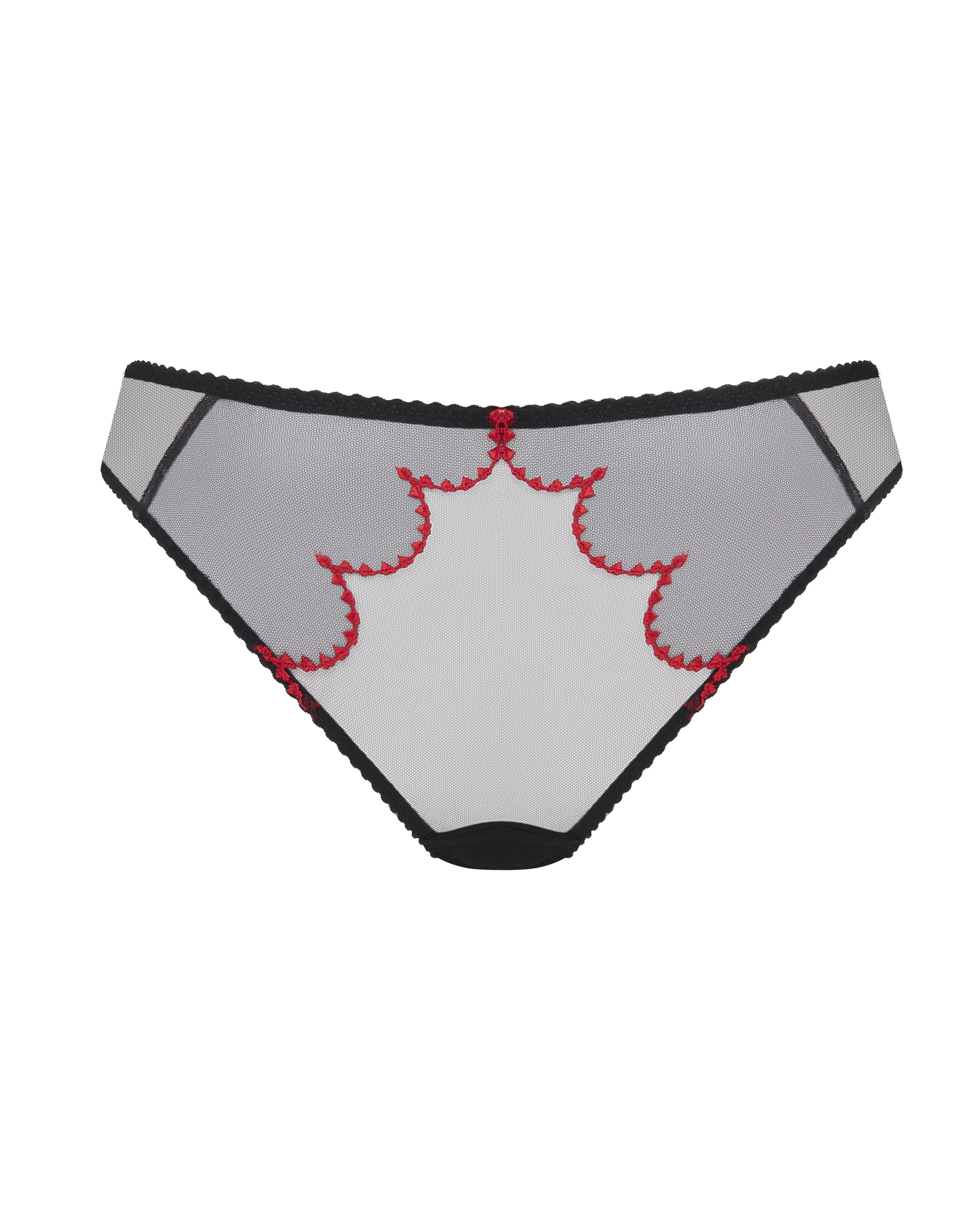 Черные брифы из коллекции Lorna Heart пошиты из прозрачного сетчатого тюля. Классическая модель украшена фестончатыми краями и вышивкой в виде красных сердец. Для создания стильного образа в стиле Provocateur сочетайте их с остальными предметами коллекции Lorna.