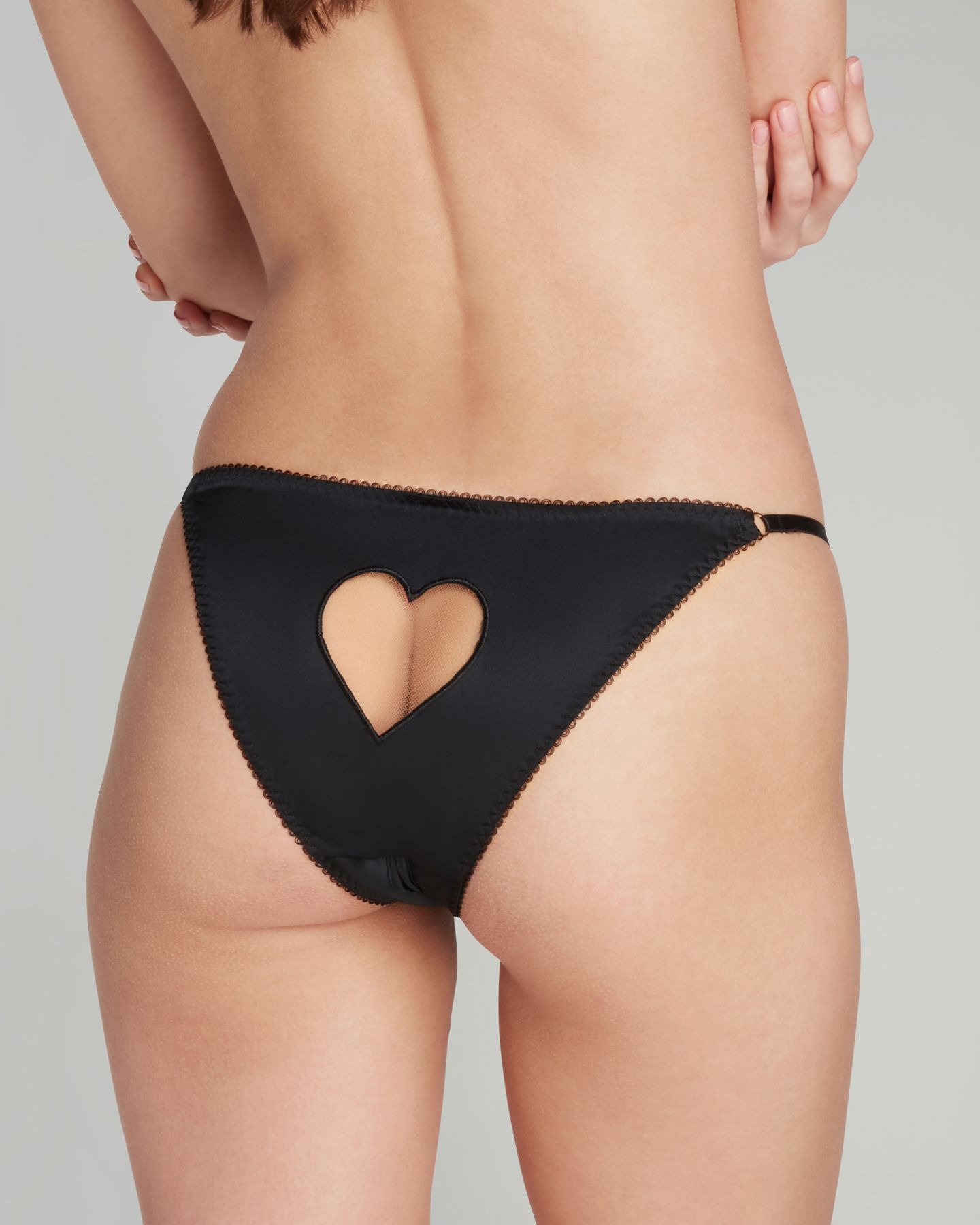 Трусики классического кроя сшиты из черного шелкового атласа. Вплетение волокон эластана делает материал невероятно мягким и придает манящий блеск. Ключевая деталь - вставка из прозрачного тюля сзади в виде сердца. Игра на контрастах: черного шелка и игривой вставки - отличительная черта коллекции Ettie. Модель дополнена резным эластичным кружевом, обрамляющим срезы и парой золотистых колец спереди, скрепляющих детали.