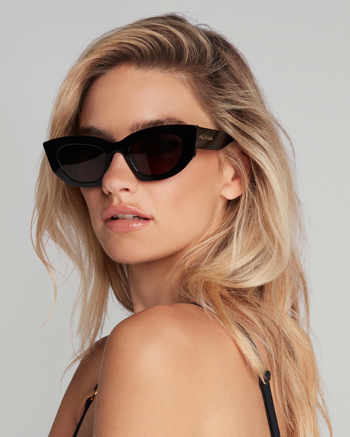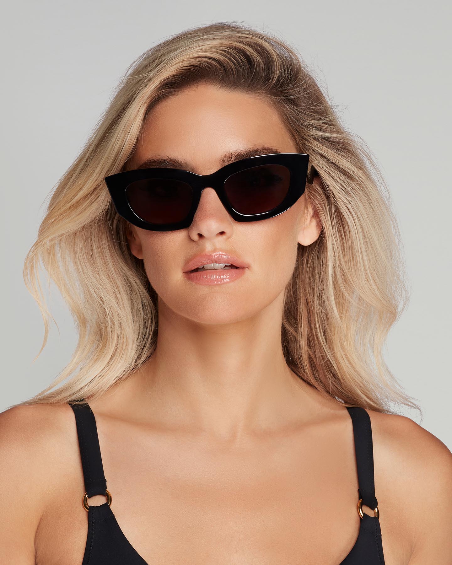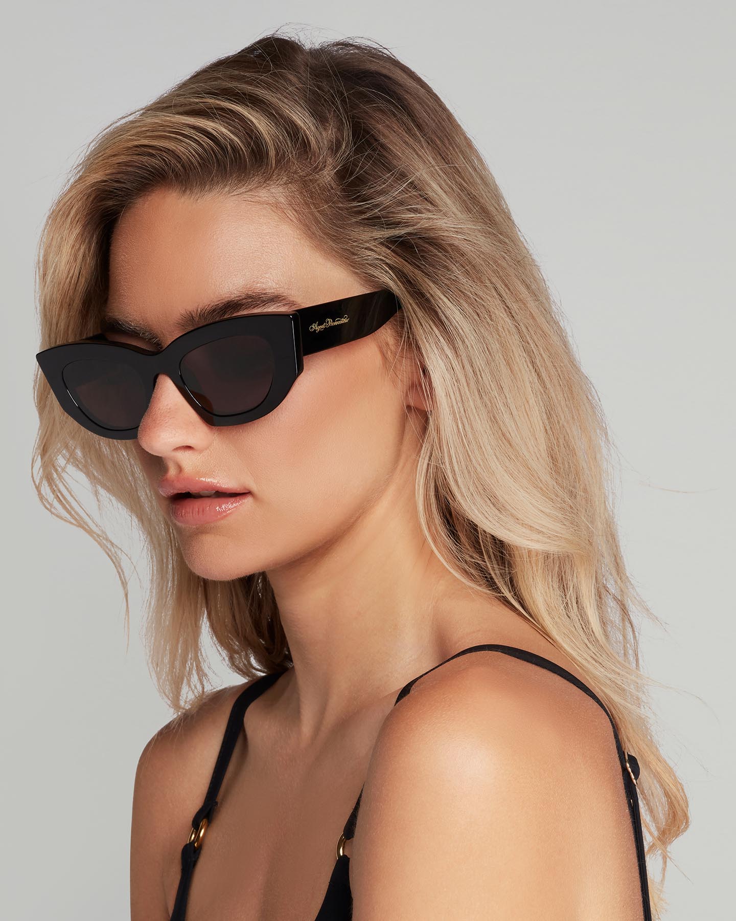 Черные солнцезащитные очки из коллекции Kitti представлены в оправе "кошачий глаз". Линзы черного цвета служат 100% защитой от UVA и UVB излучений. Сдержанный логотип Agent Provocateur золотистого цвета расположен сбоку на дужке.