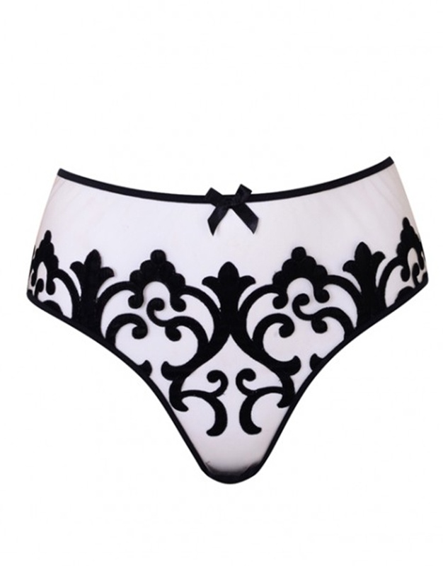 Нежная и декадентская Haylie окружена романтическим ореолом. Красивые бразильские трусики телесного цвета украшены черной вельветовой вышивкой и бантиком на талии. Сзади кружево дополнено перекрещивающимися черными тесемками.