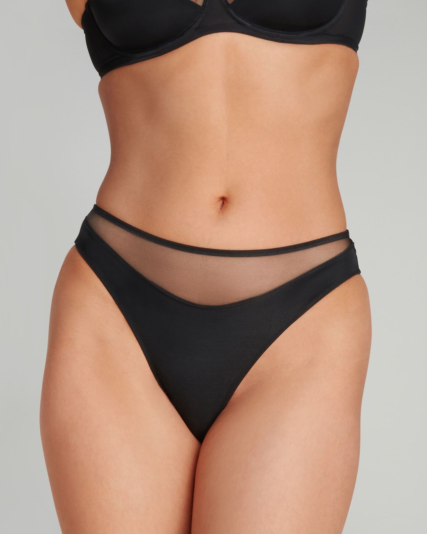 Черные трусики Lucky сшиты из эластичного тюля. Узнаваемая для коллекции деталь — плавный вырез сверху создает полупрозрачный эффект. Высокая линия бикини дополнена посадкой на талии. Тонкие швы обработаны эластичной строчкой зигзаг.