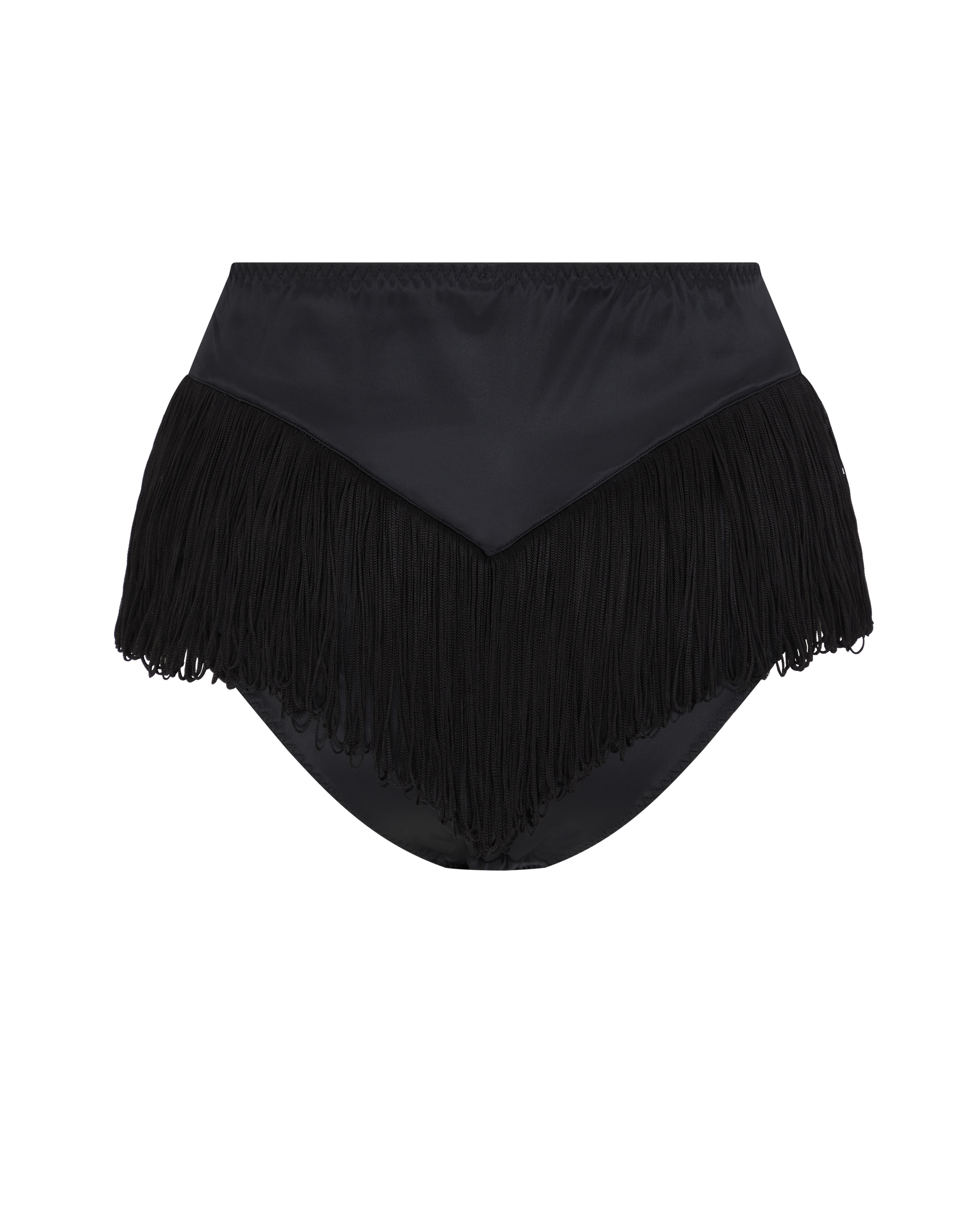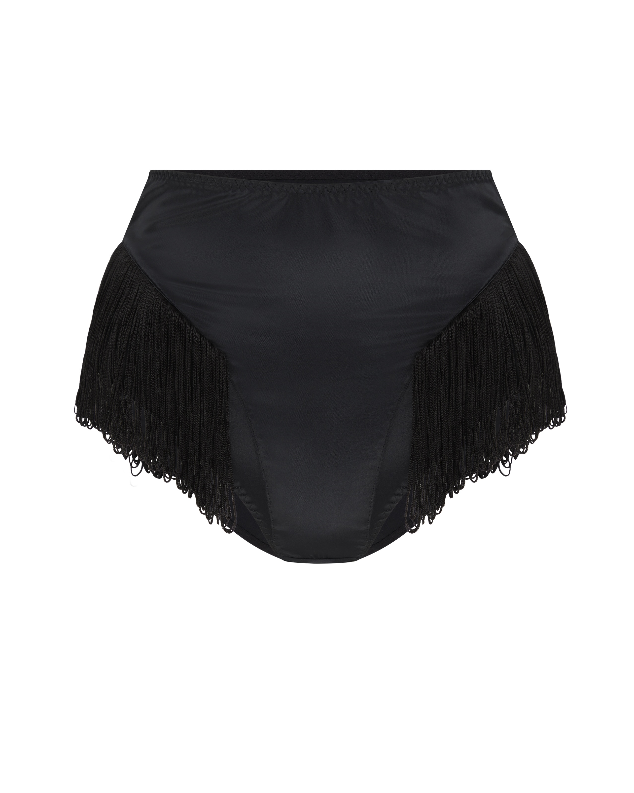 Трусы с высокой посадкой Tessah из эластичного атласа дополнены длинной бахромой. Идеально сочетаются с корсетами Drew или Zena для эффектного выхода.