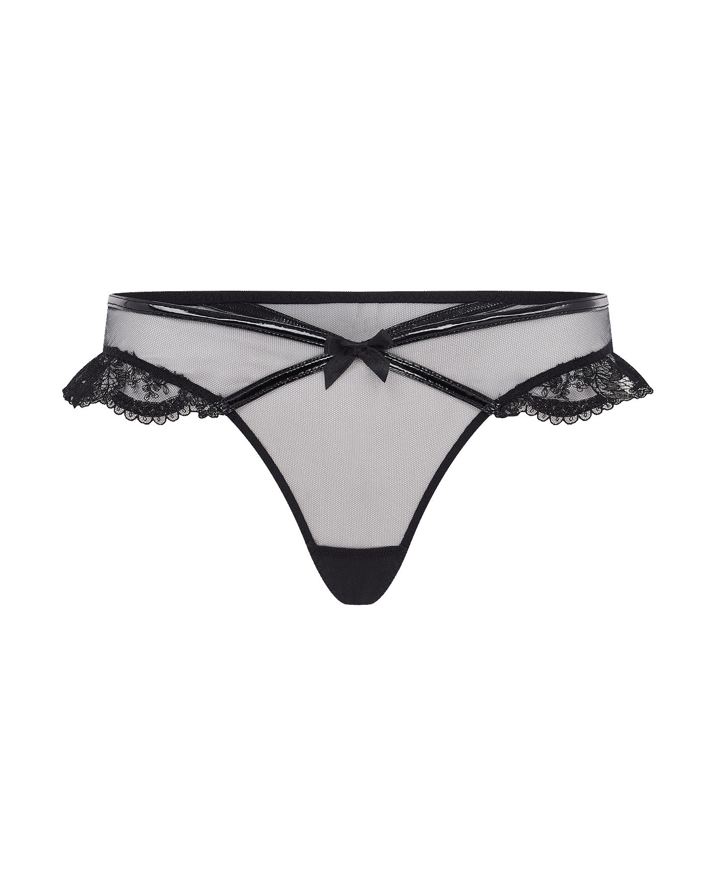 Черные стринги Charlotia из прозрачного тюля с акцентами из ПВХ: крест спереди и перекрестные ремешки сзади. Цветочная вышивка на бедрах добавляет игривости. Сочетайте с коллекцией Charlotia для максимальной дерзкой изощренности.