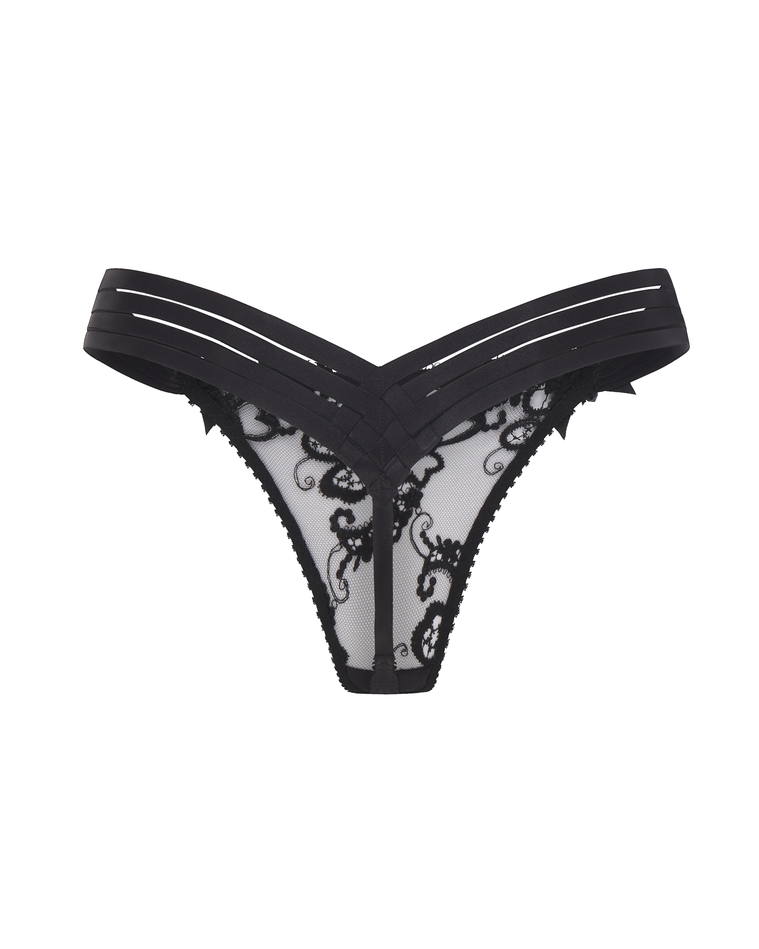 Трусы стринги Dioni черного цвета декорированы швейцарской лазерной вышивкой и кристаллами Preciosa®. Ремешки на бедрах сплетаются в выразительный акцент. Эта модель создана пленять — особенно в сочетании с полным комплектом Dioni.