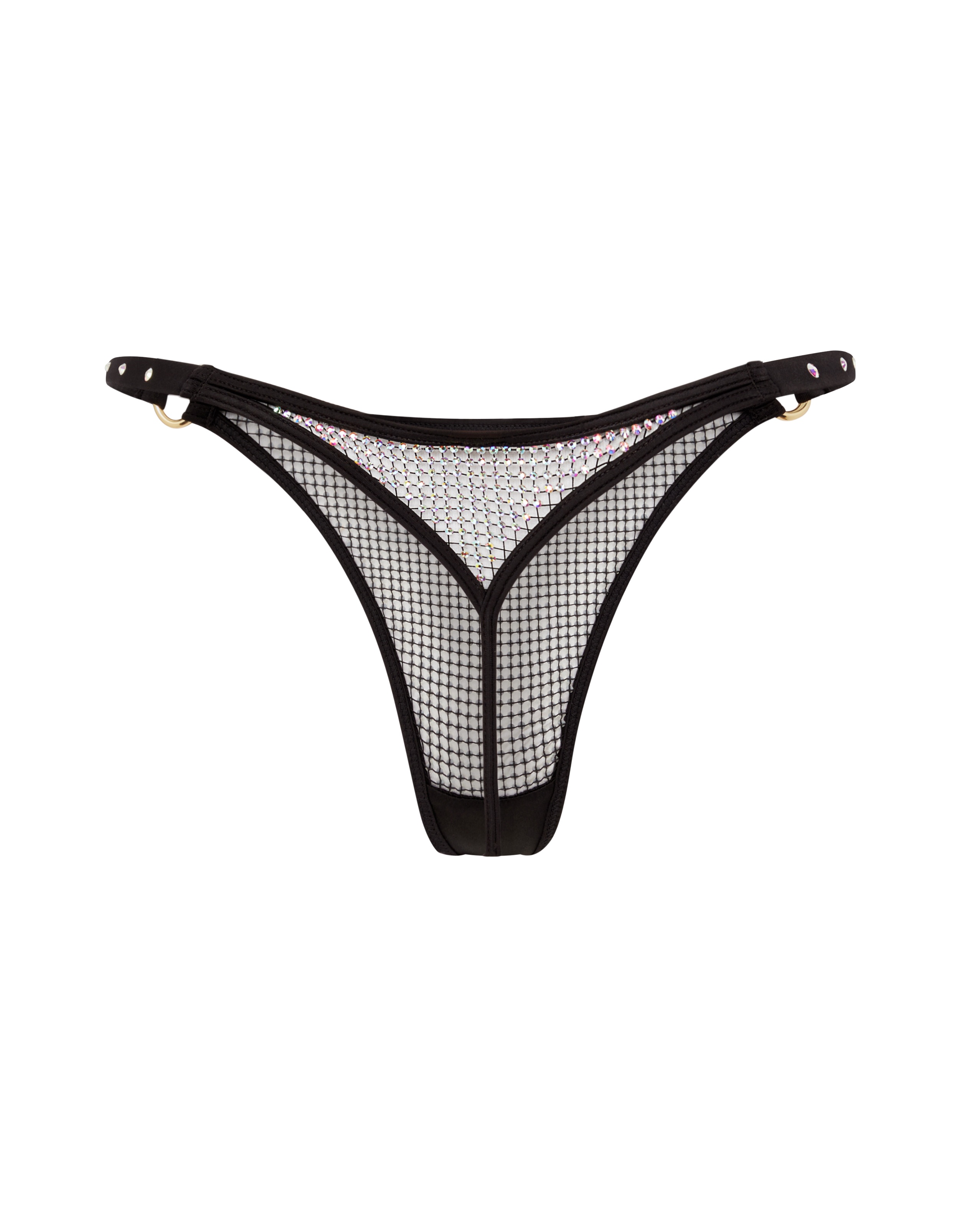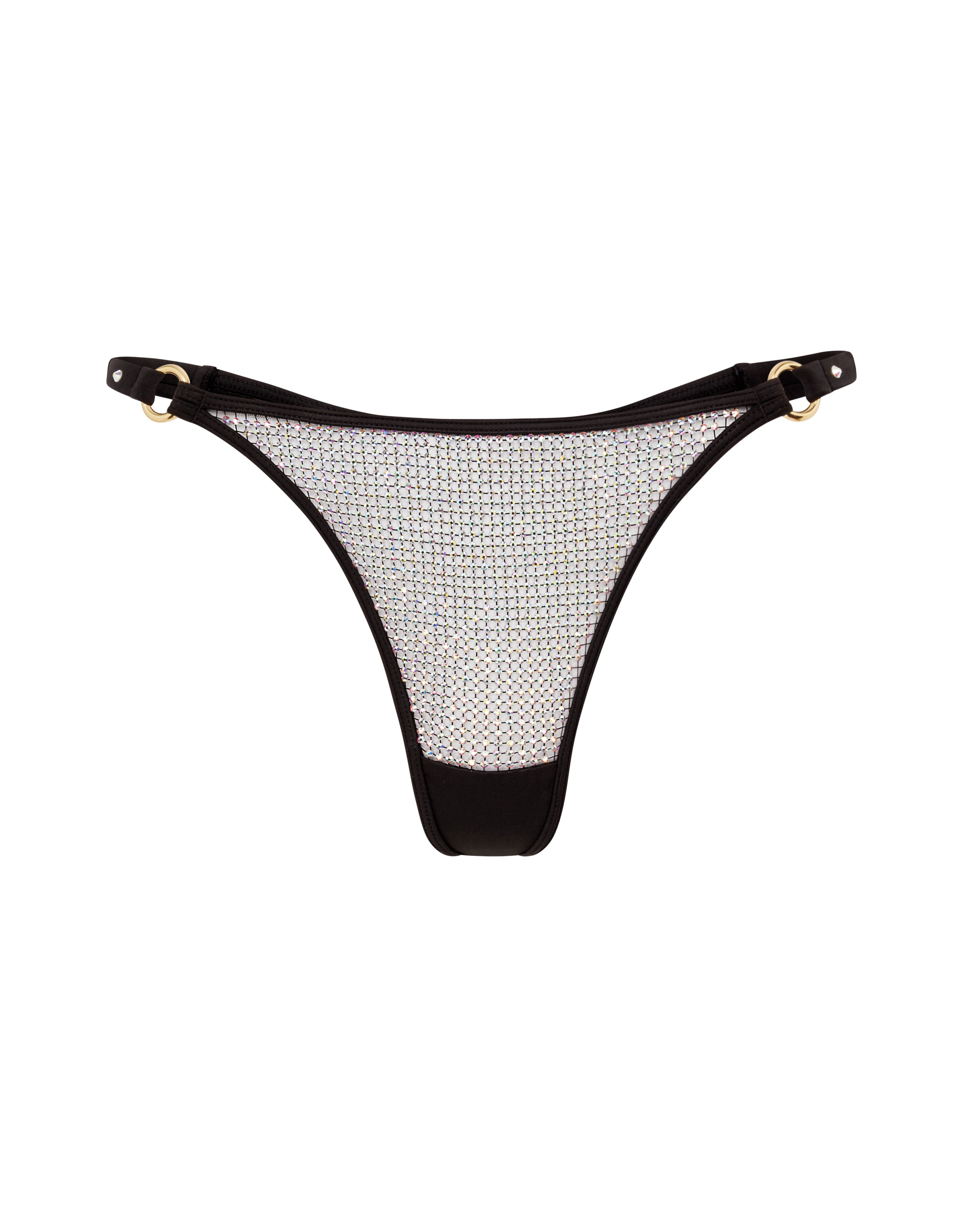 Черные стринги Estellie: итальянская кристальная сетка спереди и сзади. Бока-танга из атласной микрофибры со стразами, окантовка из гладкого атласа. Массивные золотистые кольца, шелковая ластовица. Создайте незабываемый гламурный образ с комплектом Estellie.