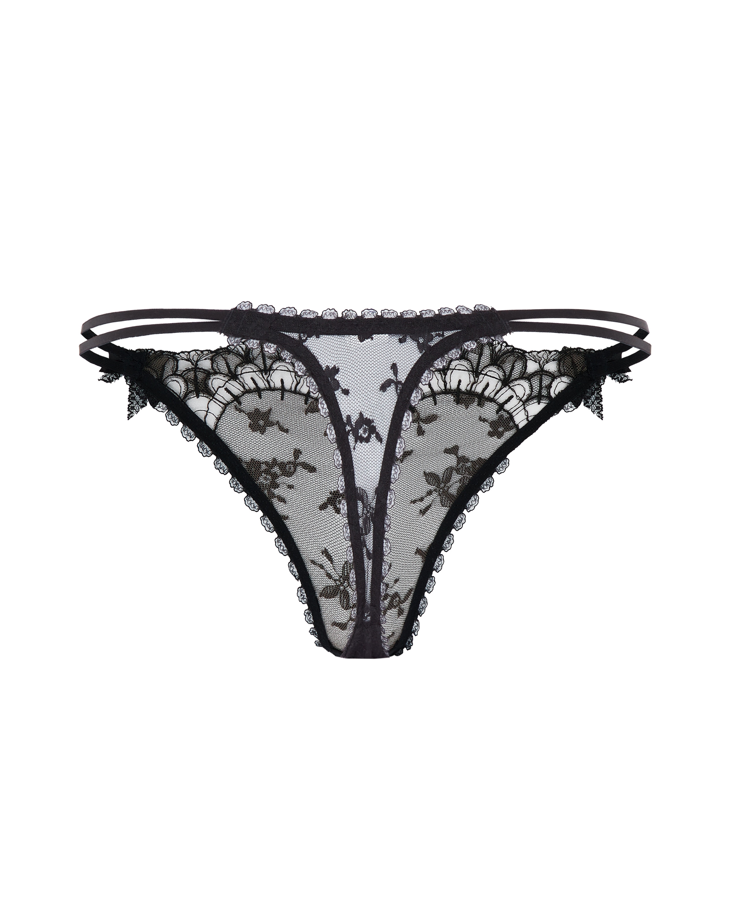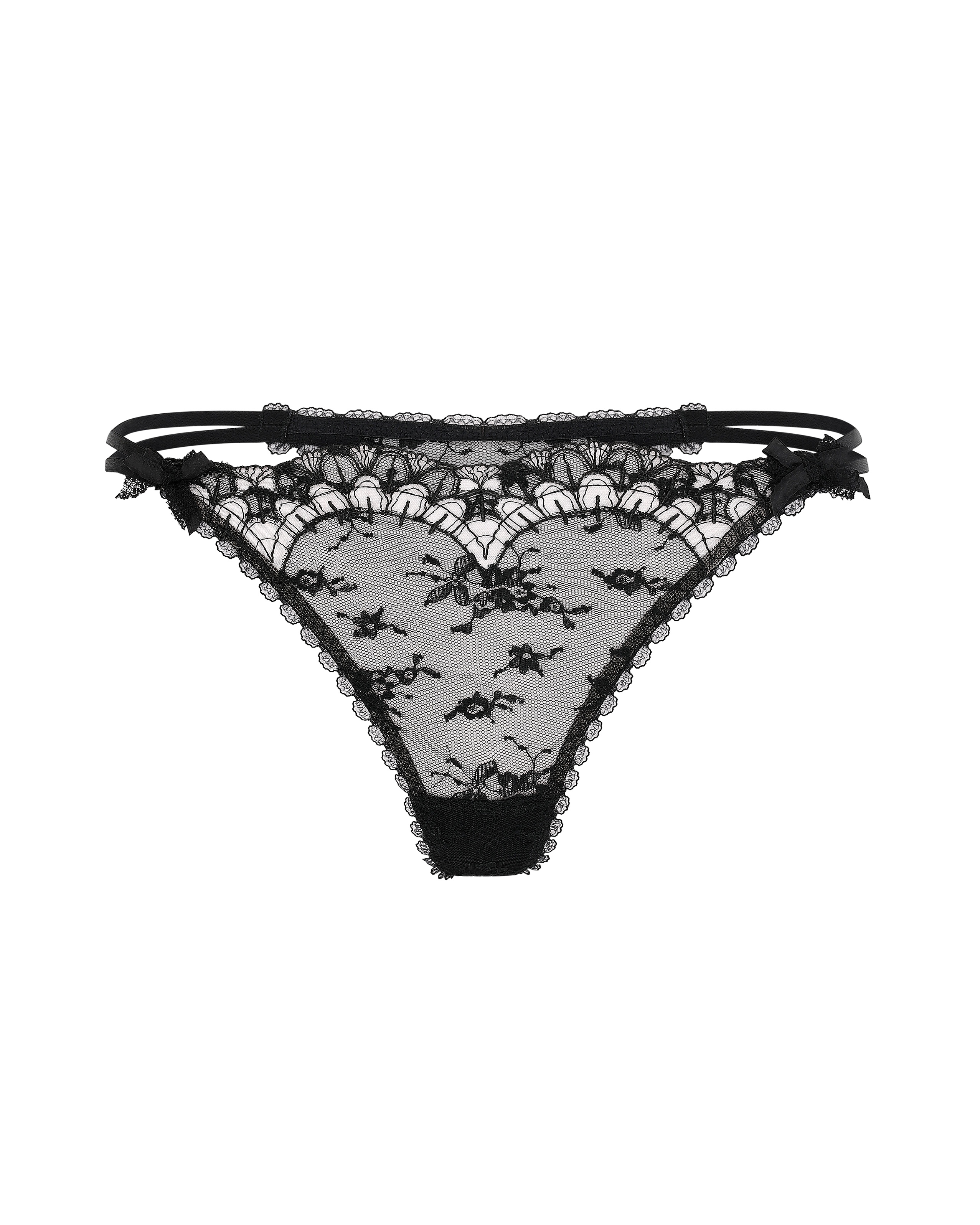 Черные трусы стринги Floria украшены швейцарской вышивкой с ажурными краями и эластичными сатиновыми боковыми вставками. Кружевной бантик и изящная отделка по краям завершают образ. Носите их с остальными изделиями коллекции Floria.