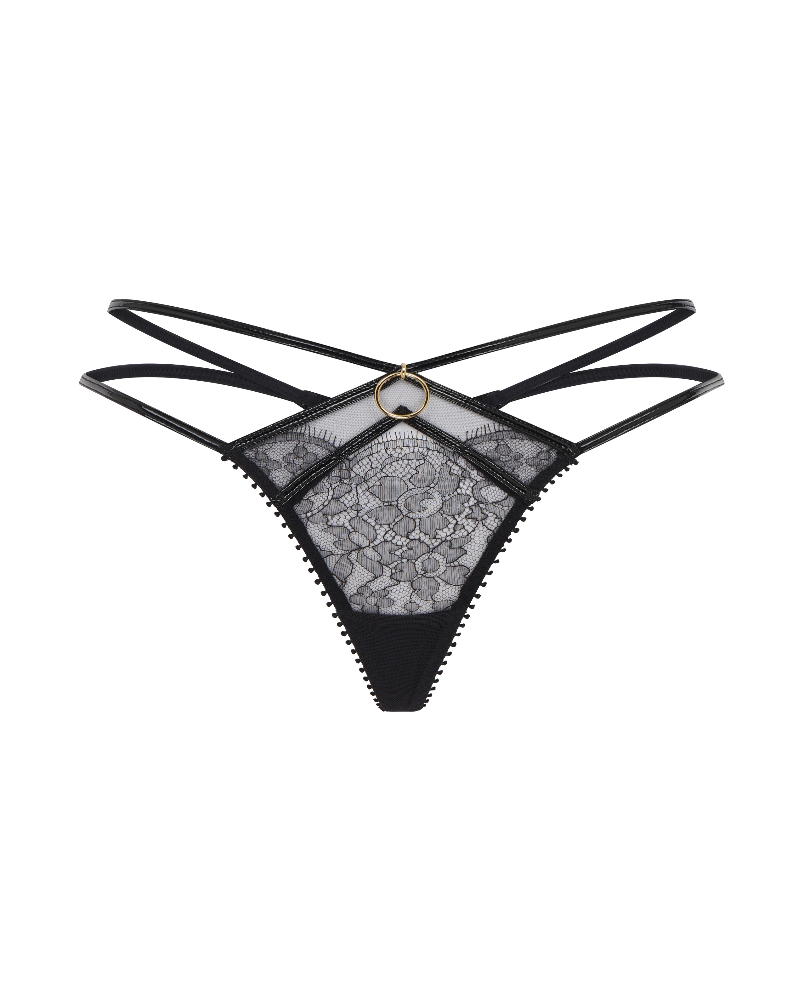 В модели стрингов Foxie сочетаются смелость и изысканность: глянцевые ремни ПВХ и цветочное кружево дополнены крупным кольцом и оборочным краем. Фурнитура с покрытием из настоящего золота добавляет роскоши. Создайте неповторимый образ с другими изделиями линейки Foxie.