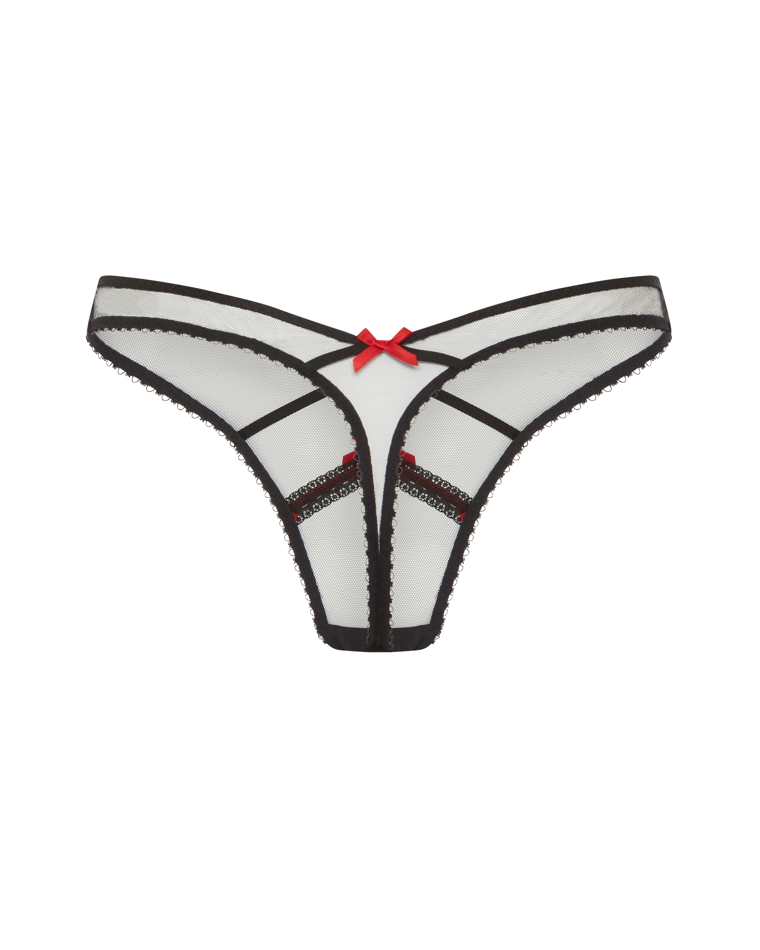 Трусы стринги Hetty черного цвета с высоким вырезом и V-образной линией талии спереди и сзади. Отделка в виде контрастной ленты и атласных бантиков, а также двойных руликов, образующих Х-образный узор. Прозрачный тюль завершает этот дерзкий образ. Сочетайте с полным комплектом Hetty.