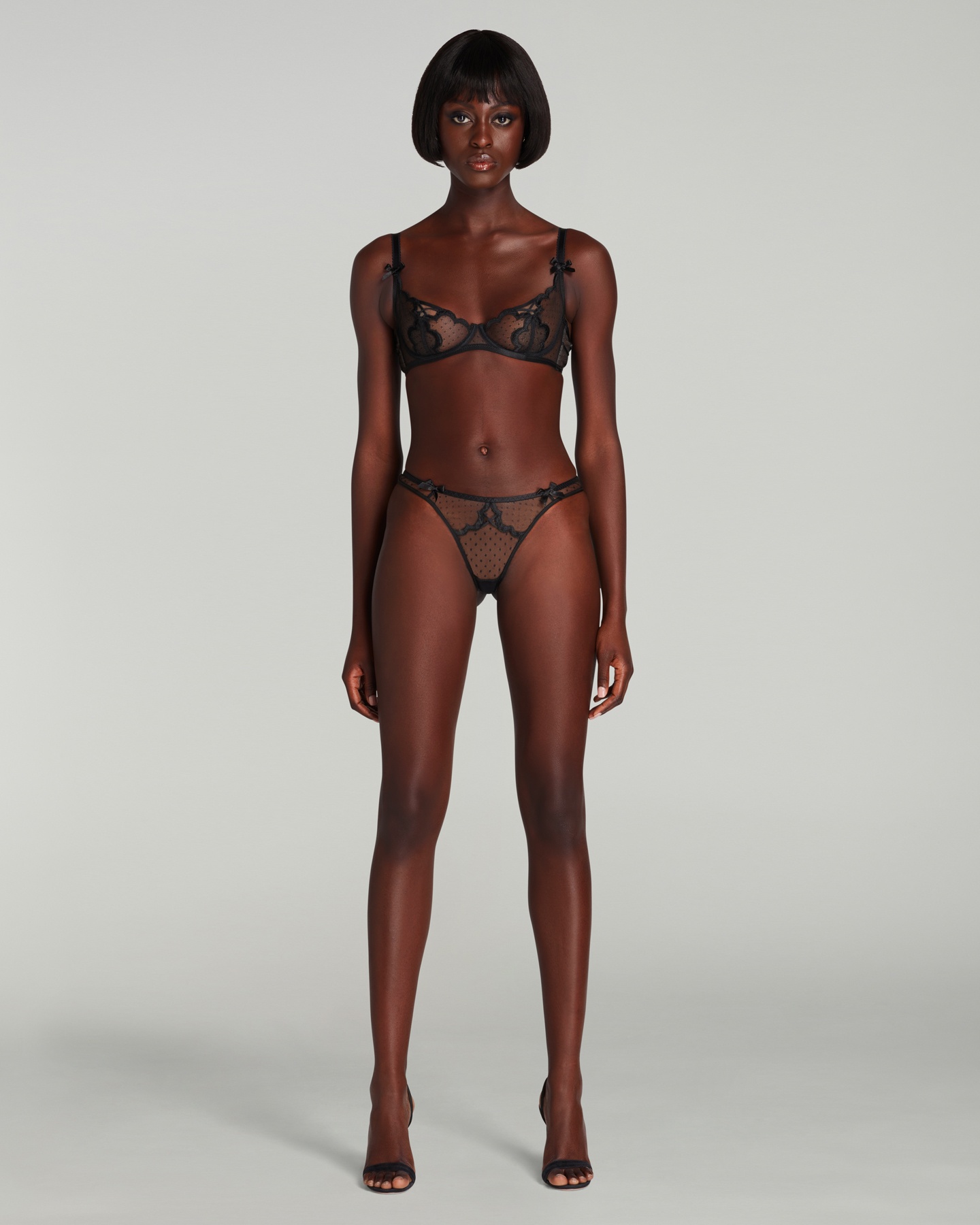 Стринги Katanah сочетают швейцарский тюль с деликатной вышивкой и изящными ремешками-руло спереди. Эффектный дизайн идеально дополняет остальные изделия коллекции.