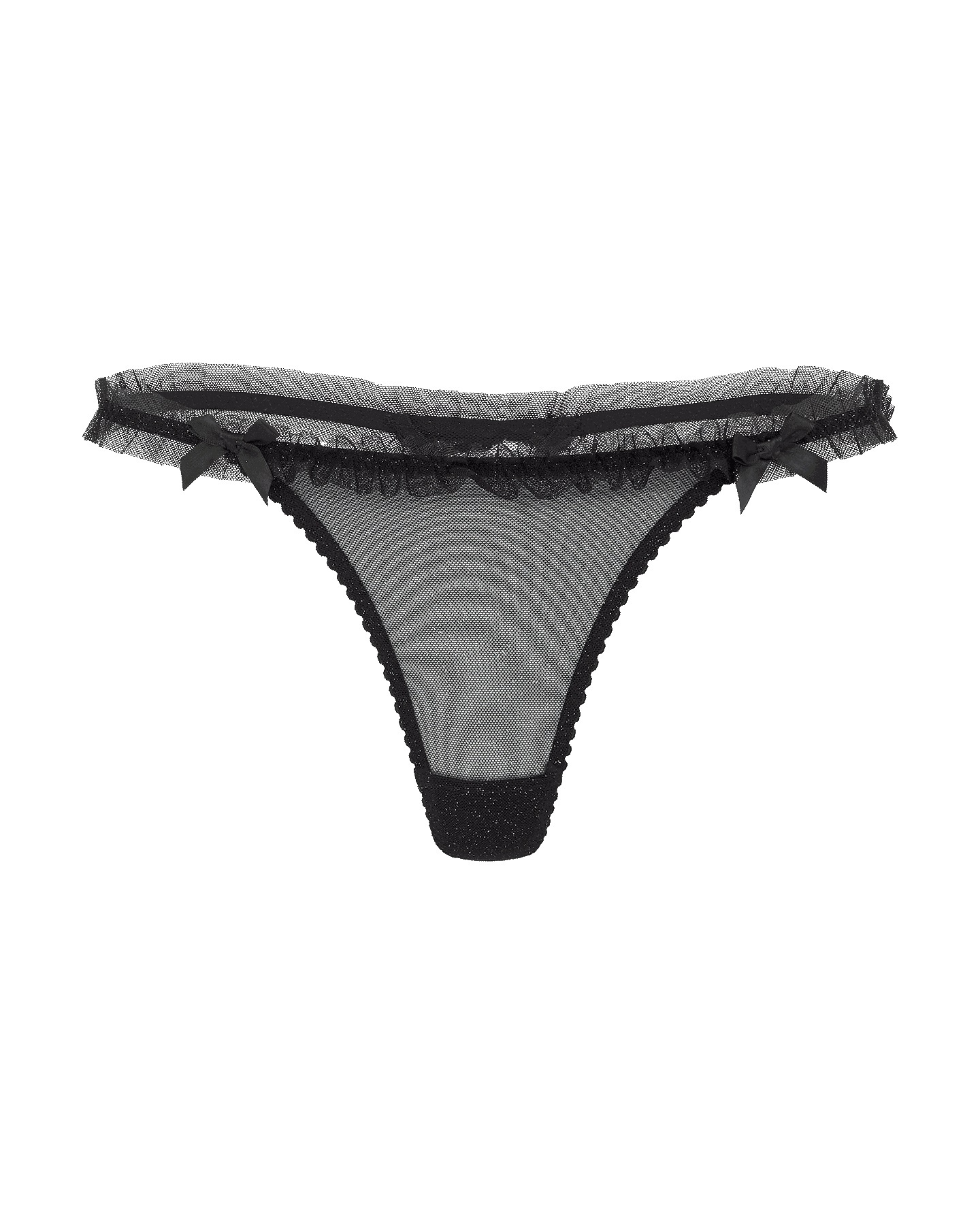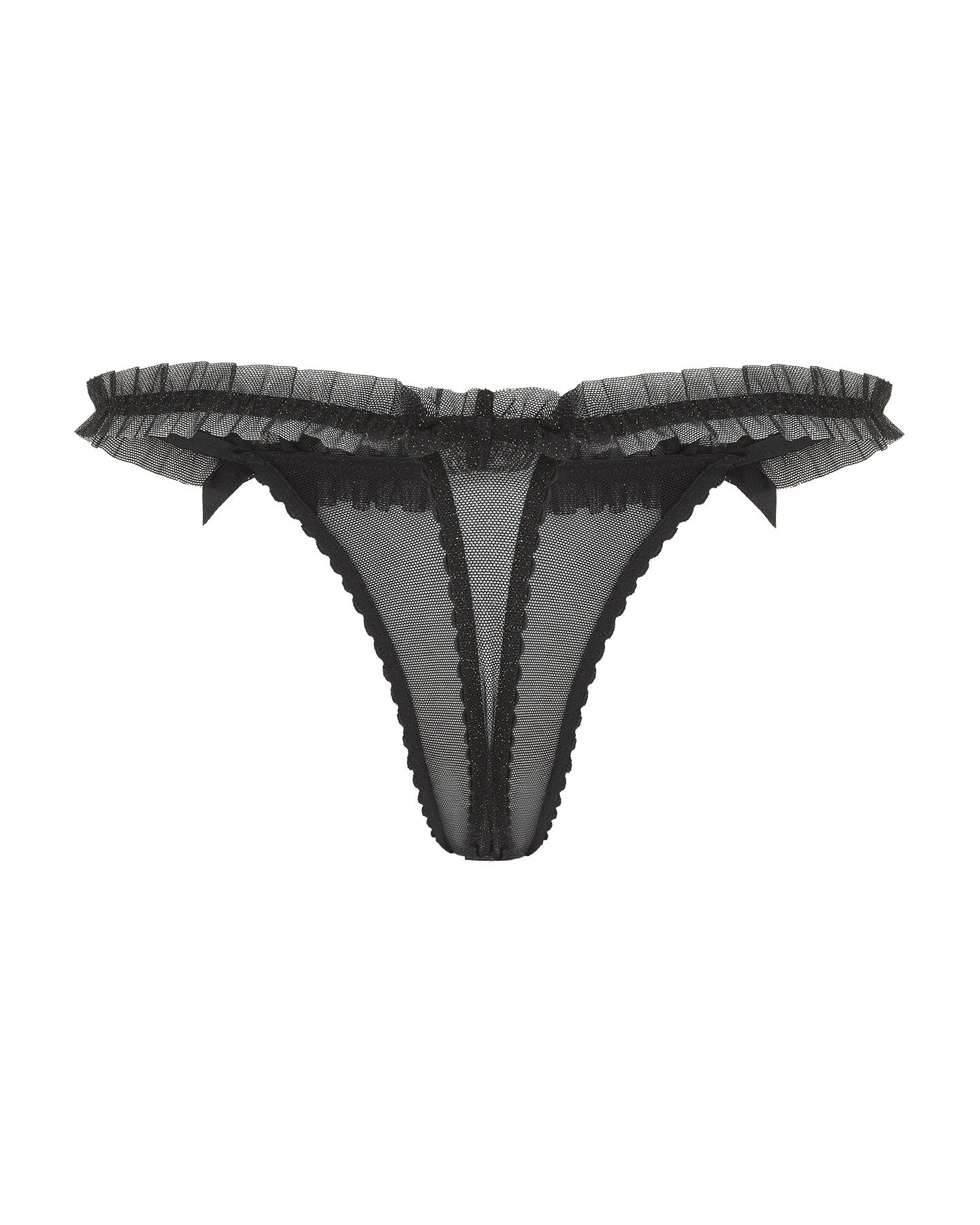 Черные трусы стринги Mixi — нежное сочетание прозрачного французского тюля с блестящим покрытием, создающим легкий мерцающий эффект. Обрамлены игривыми оборками по талии и украшены атласными бантиками на бедрах.