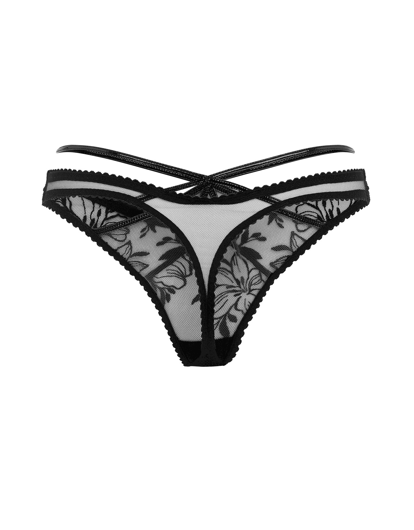 Черные трусики стринги из прозрачного тюля украшены цветочной вышивкой с «мокрым» эффектом. Черная отделка из эластичной искусственной кожи вдоль линии бедер и перекрещивающиеся эластичные ленты, создающие эффект вырезов, завершают образ. Сочетайте с коллекцией Ozella.