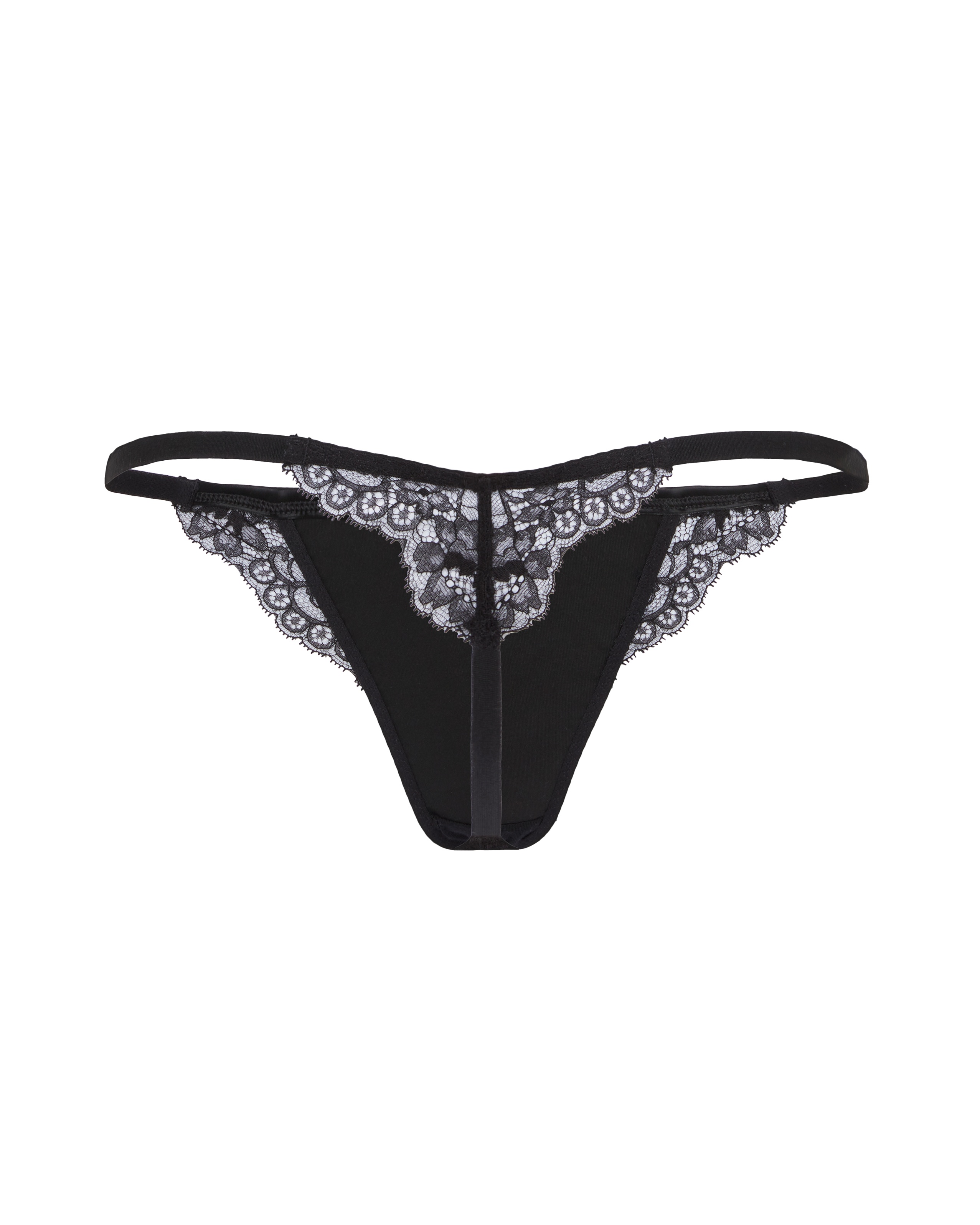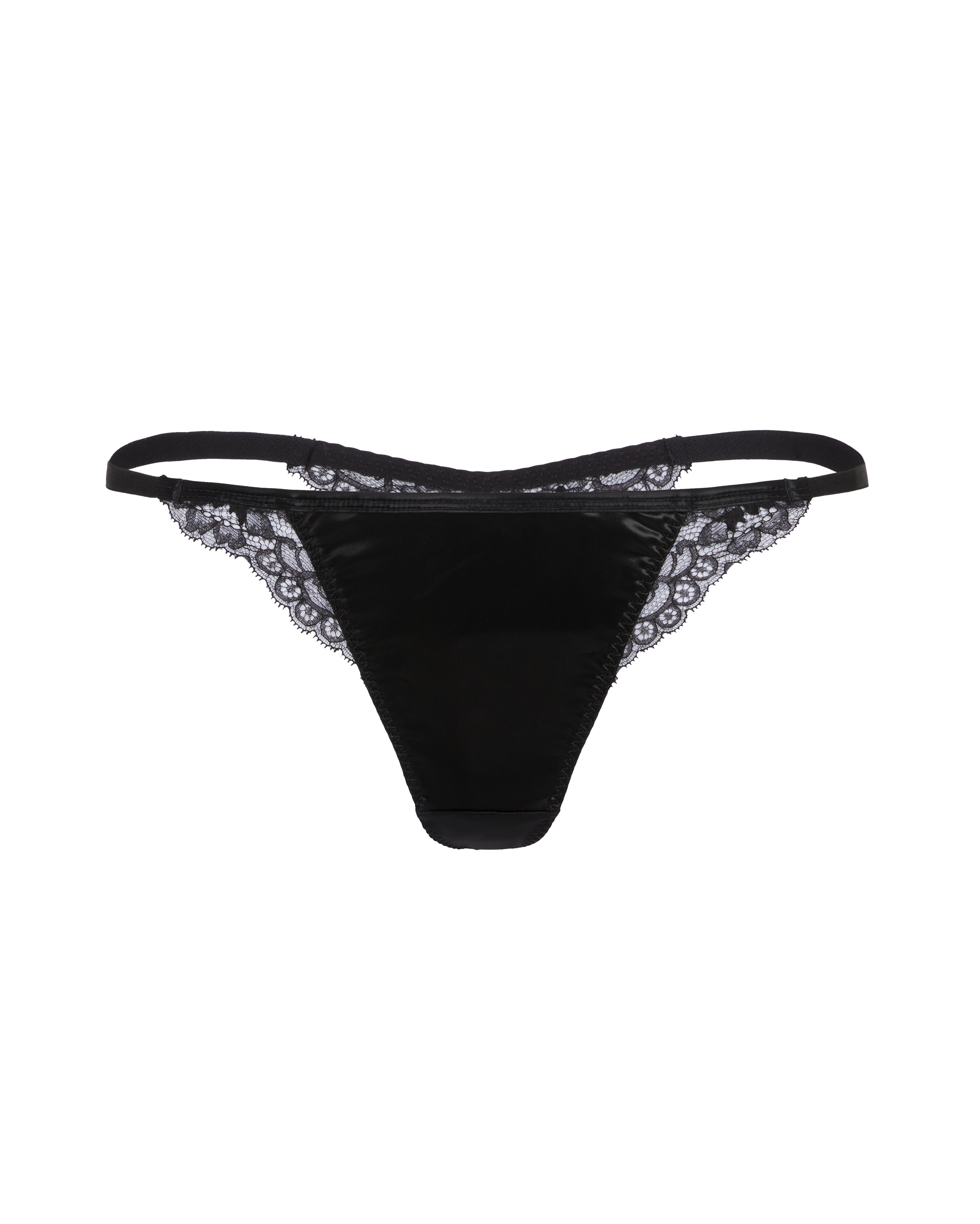 В коллекции Rivere представлены стринги с дерзким танга-кроем, выполненные из итальянской ткани с глянцевым эффектом и дополненные нежными кружевными вставками. Носите их с поясом для чулок и бюстгальтером этой коллекции для гармоничного образа.