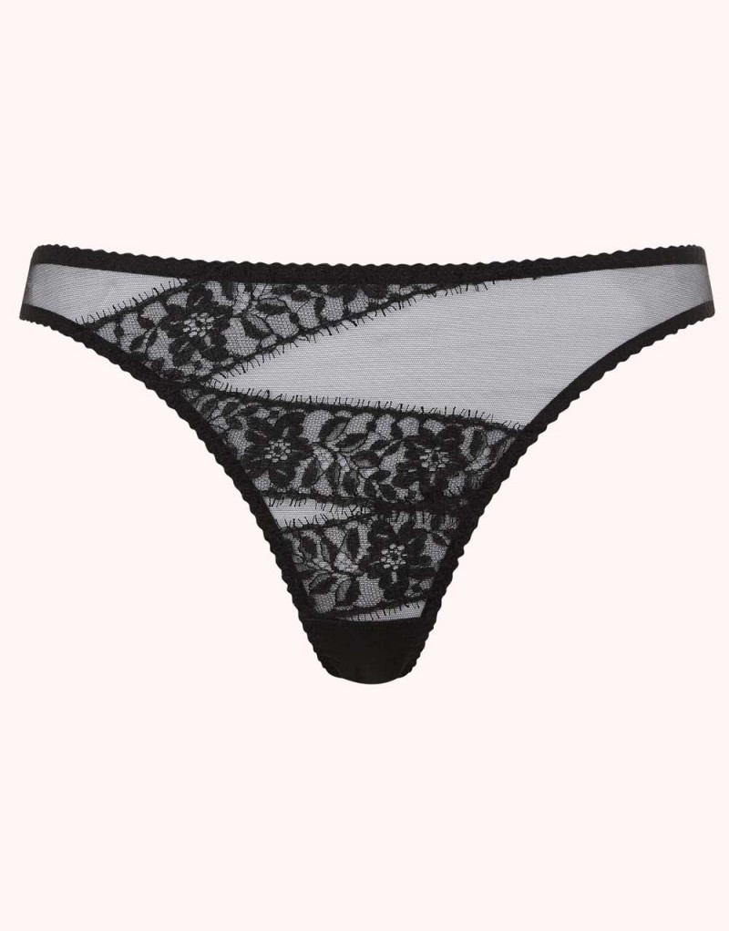 Angelica - сексуальная модель из прозрачного тюля и кружева ливерс классического черного цвета. Винтажные трусики стринги с высокой линией бедер украшены французским кружевом спереди и петельной оторочкой по краю . Сочетайте с бюстгальтером Angelica для создания эффектного образа.