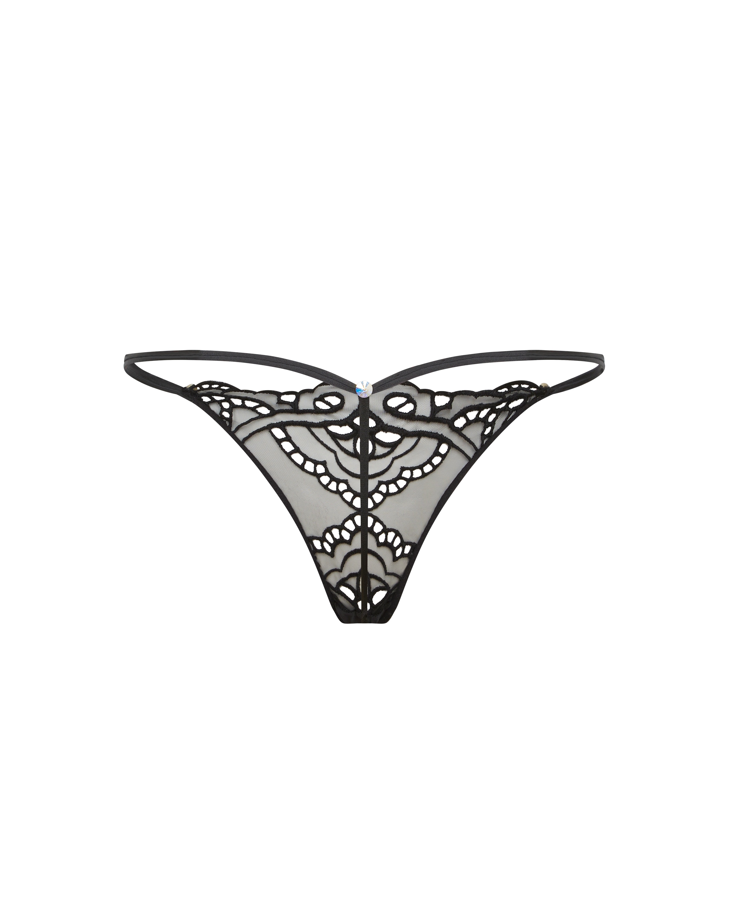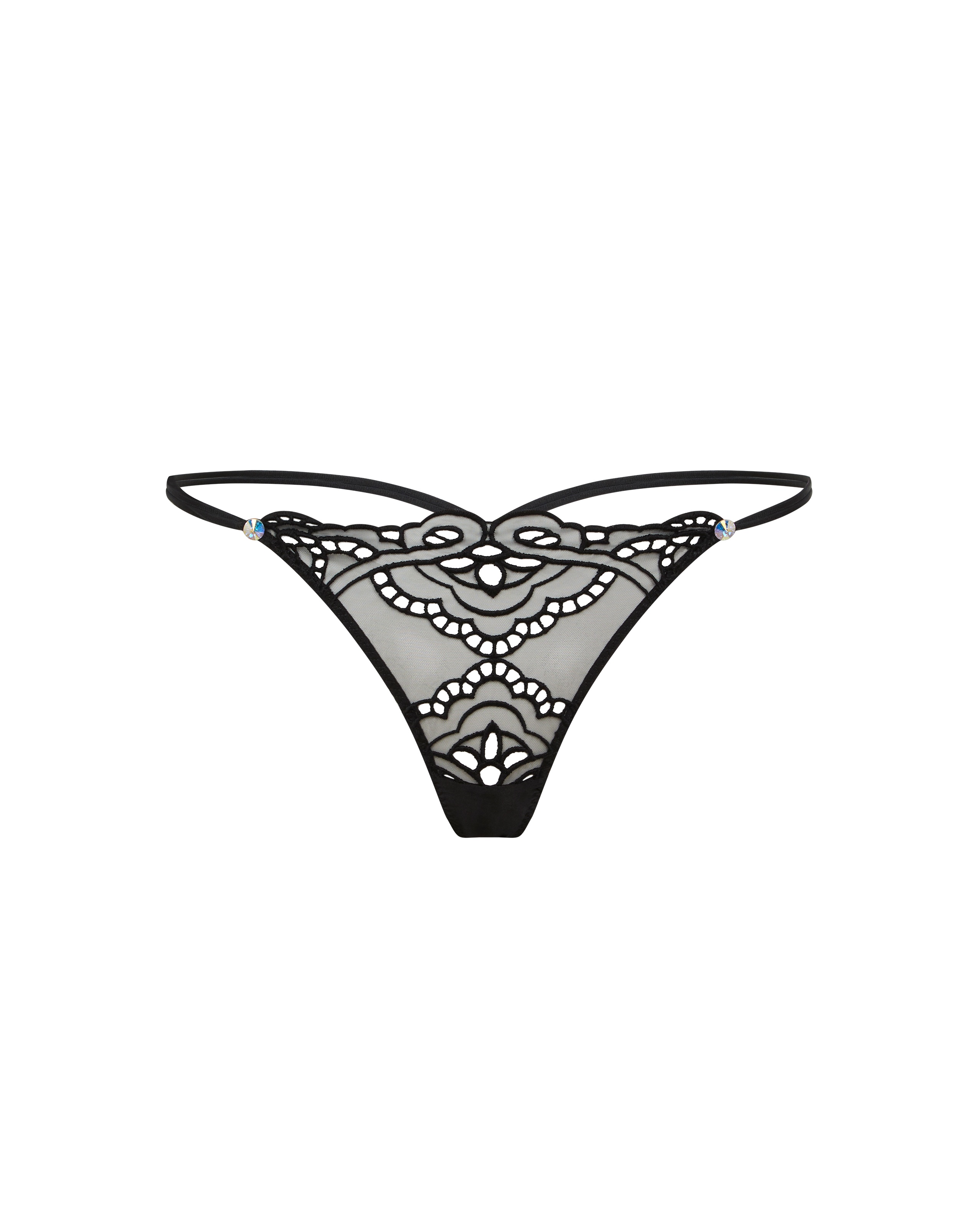 Трусы стринги Seren черного цвета с низкой посадкой выполнены на основе итальянского тюля с гипюрной вышивкой. Декоративные пуговицы из кристаллов Swarovski®, шелковая ластовица и минималистичные боковины танга. Дополните свой образ коллекцией Seren для полной гармонии.