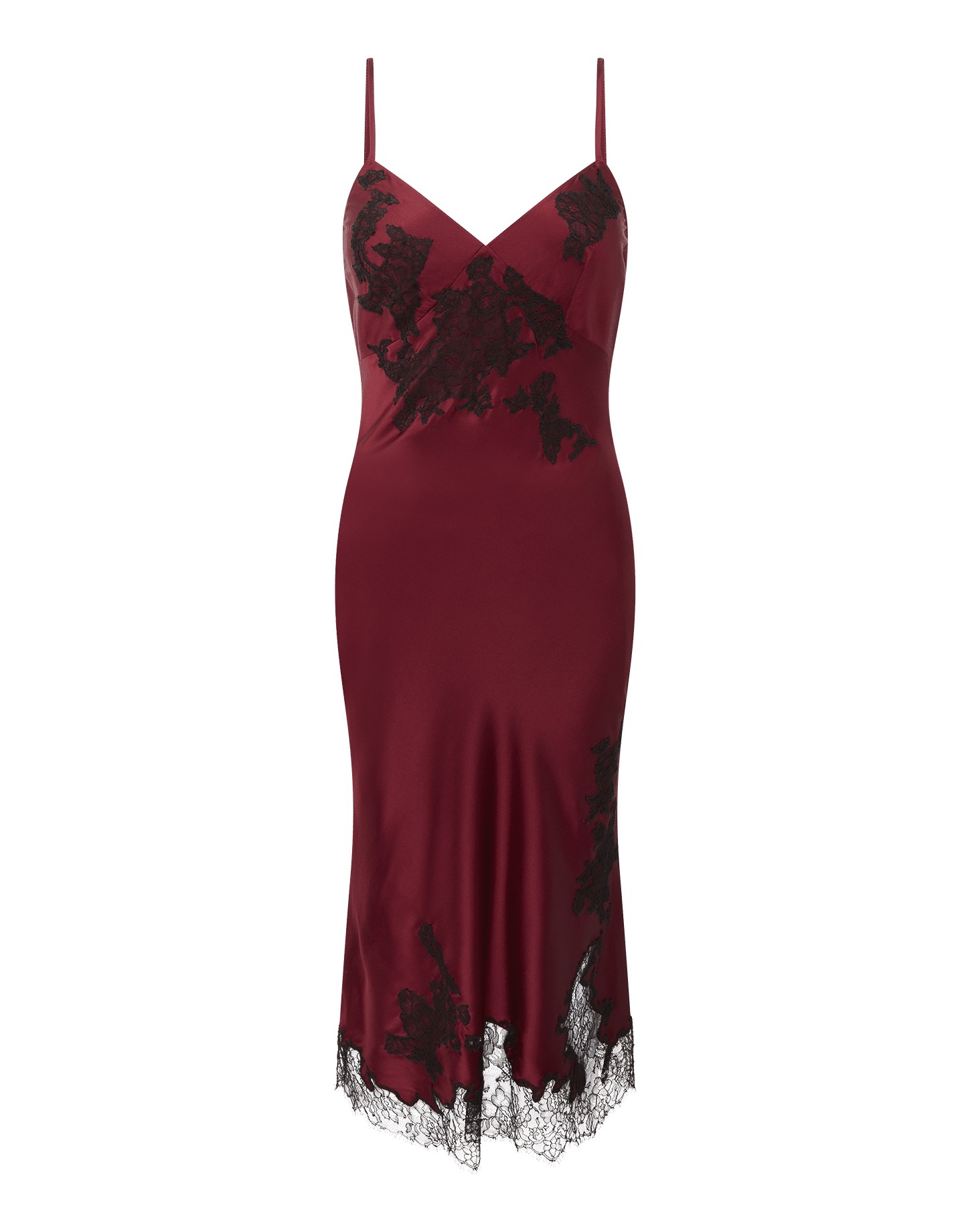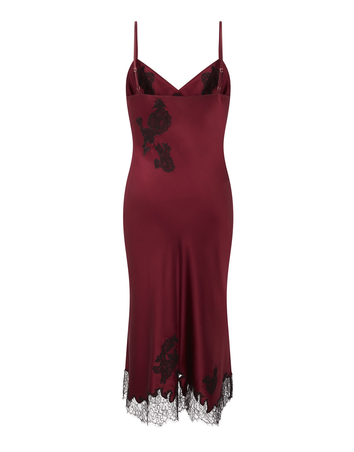 Сорочка Christi на тонких бретелях сшита из невероятно гладкого и приятного к телу стрейч-шелка. Модель в роскошном оттенке бургунди украшена черным французским кружевом премиального качества. Дополните образ халатом-кимоно из коллекции Christi.