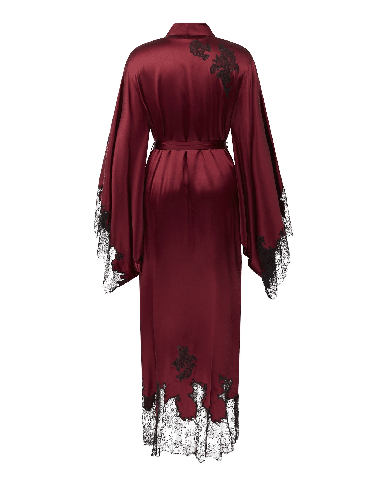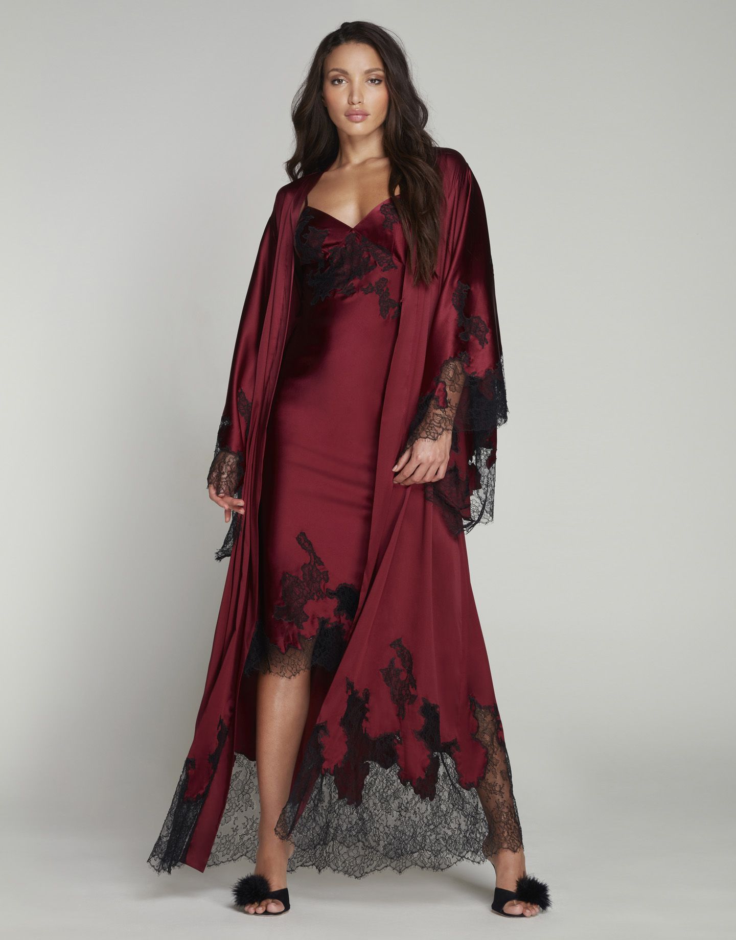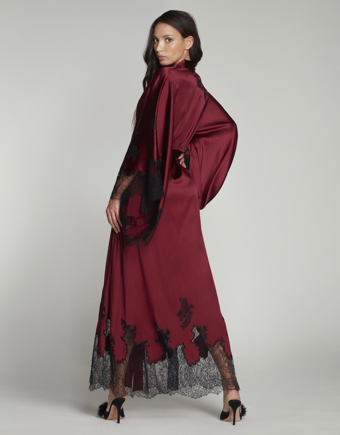 Коллекция Christi - воплощение будуарного стиля в его самом роскошном проявлении. Этот длинный халат-кимоно свободного кроя с широкими рукавами сшит из струящегося эластичного шелка оттенка бургунди и украшен черным французским кружевом. Носите его поверх любой из сорочек или боди Christi.
