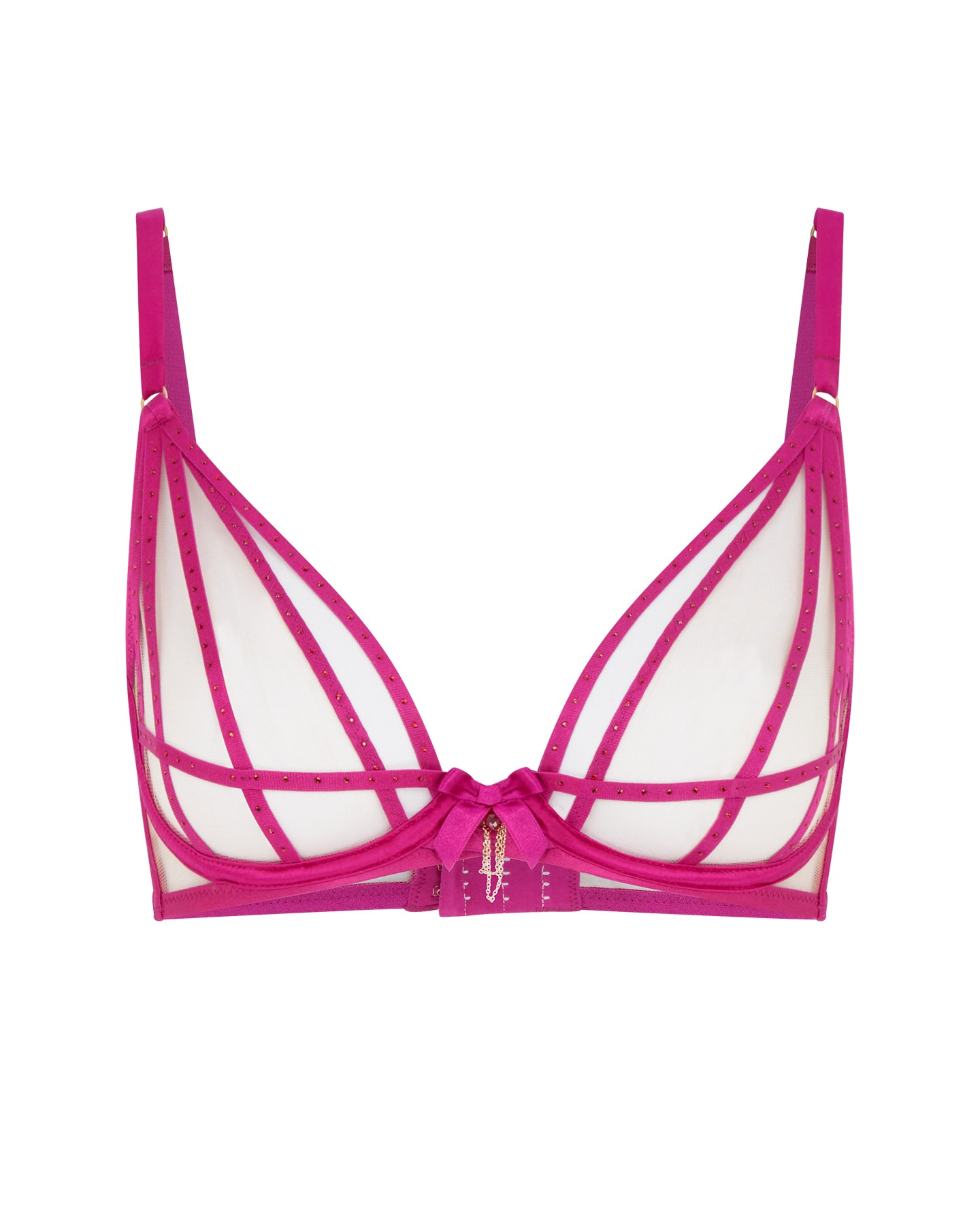 Фиолетовый прозрачный бюстгальтер с мягкой чашкой Rubi создан для дерзкого и соблазнительного образа. Эластичные ремешки украшены сверкающими кристаллами Swarovski®. Центр бюстгальтера украшен бантом и цепочкой. Прозрачный тюль добавляет легкости и нежности. Дополните образ трусами или стрингами Rubi.